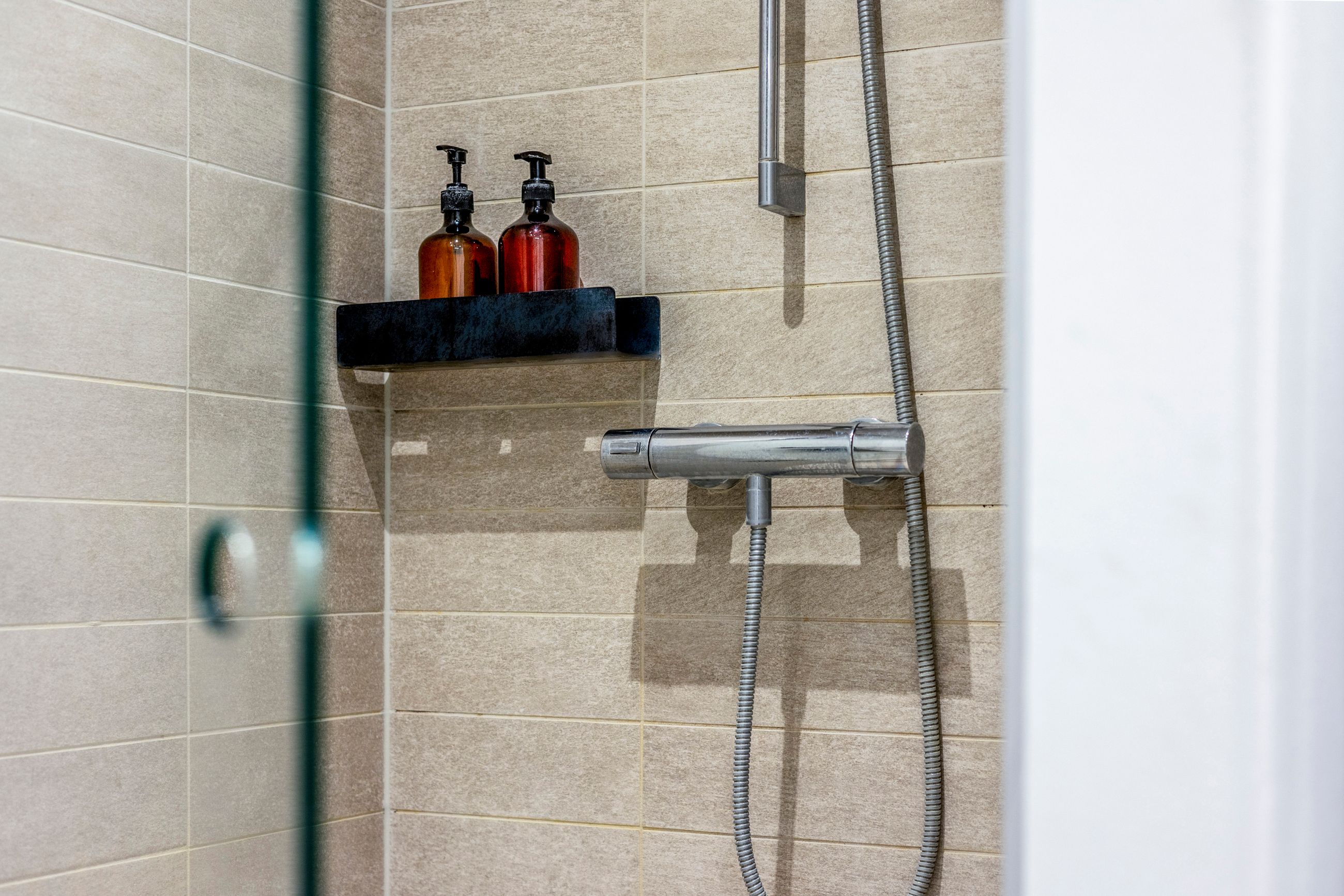Man bydes velkommen i en rummelig entré, hvor der er god plads til overtøj og opbevaring, og herfra forgrener lejligheden sig naturligt til boligens øvrige rum. Badeværelset ligger praktisk placeret og fremstår moderne og indbydende med bruseniche og en funktionel indretning, hvor der samtidig er tænkt på hverdagskomfort med plads til vaskefaciliteter.