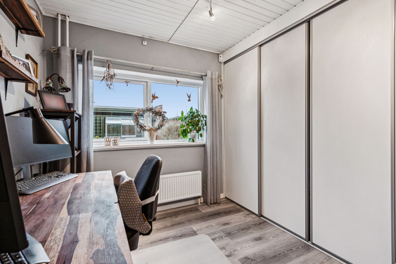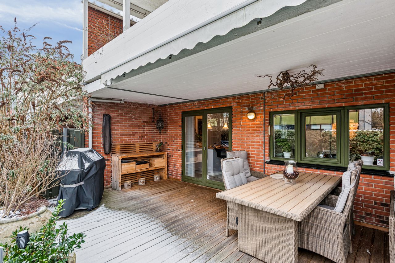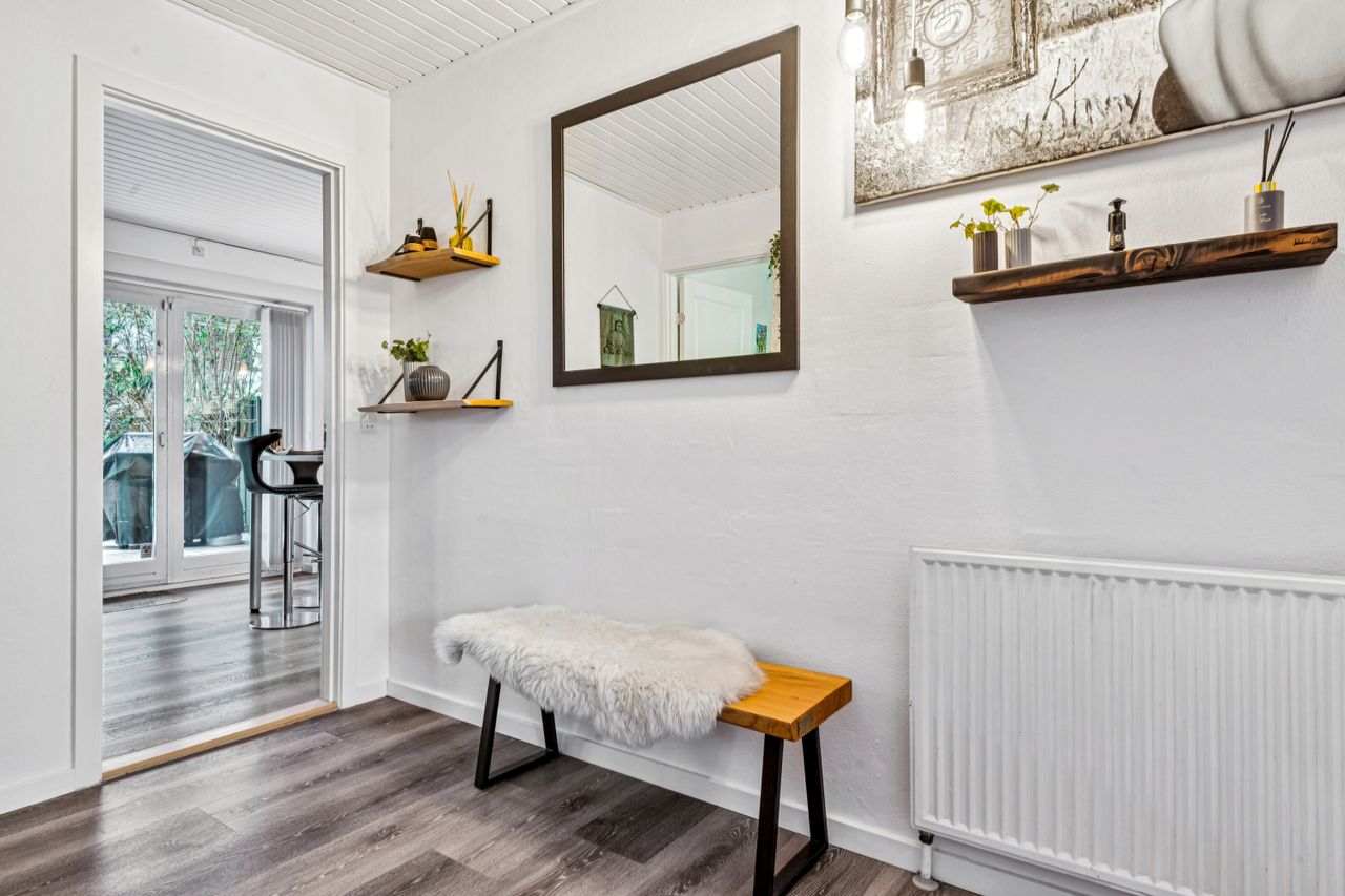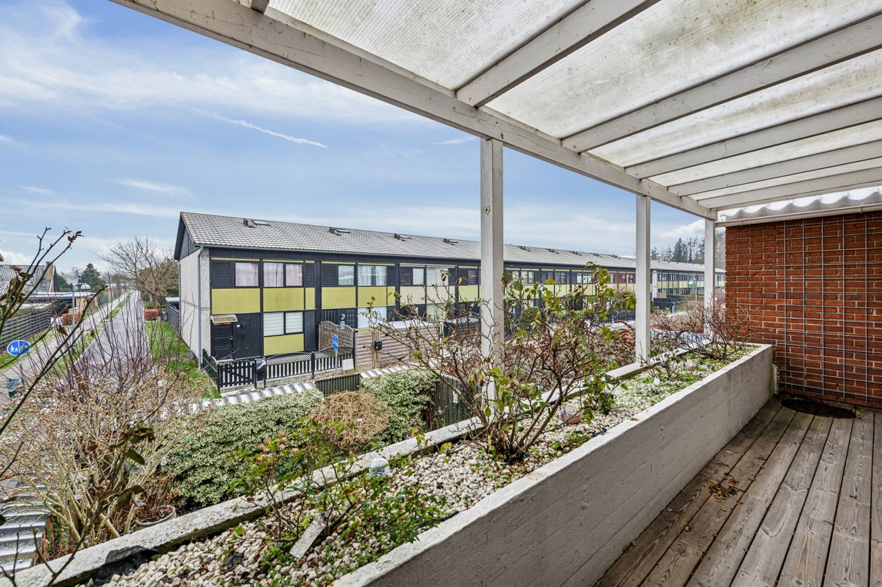 Med i købet får du en dejlig flisebelagt forhave og en skøn baghave med overdækket terrasse. Ydermere får du også en stort carport, så bil og cykler kan hildes fri for sne samt et stort og praktisk udhus.
