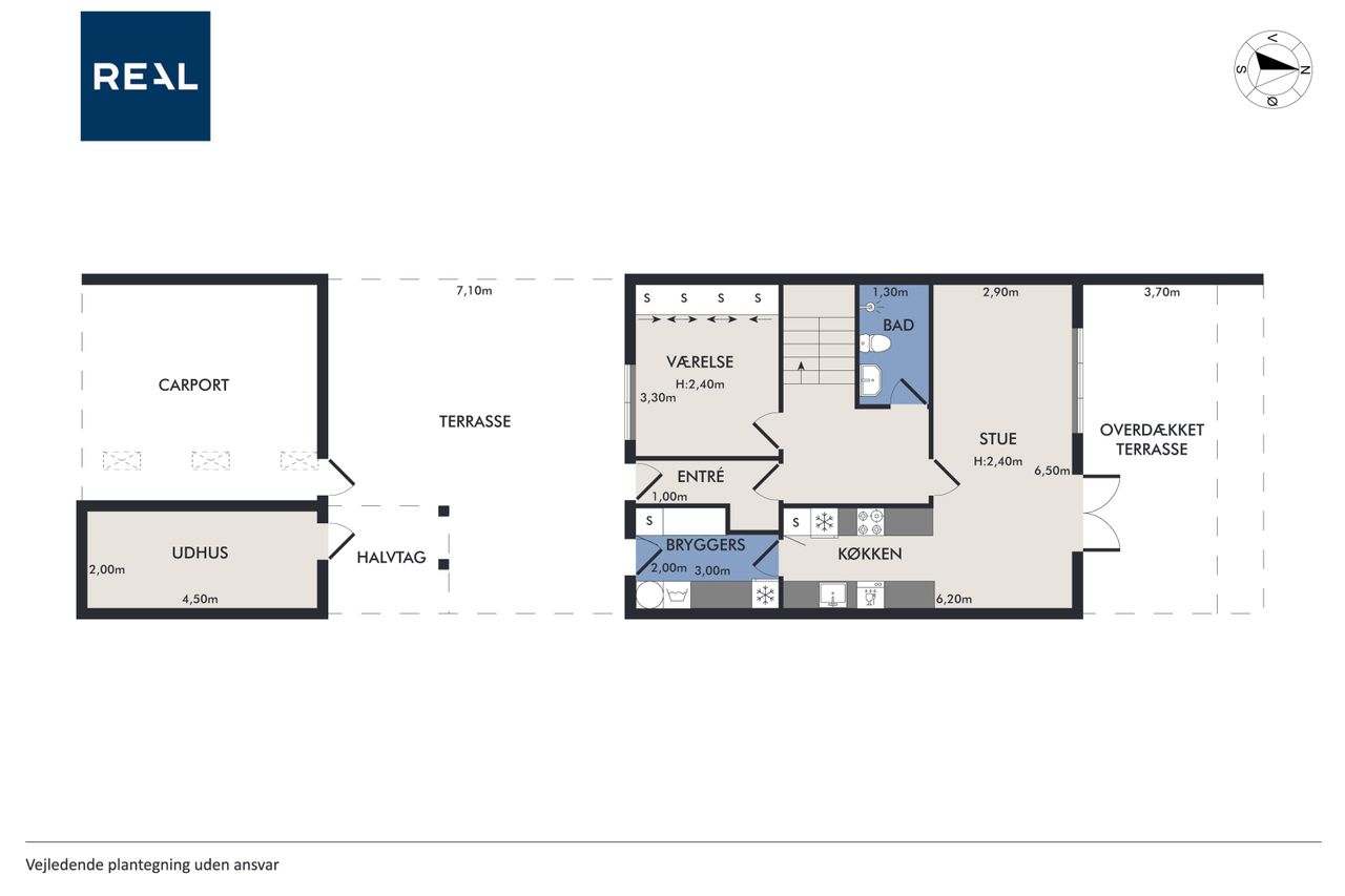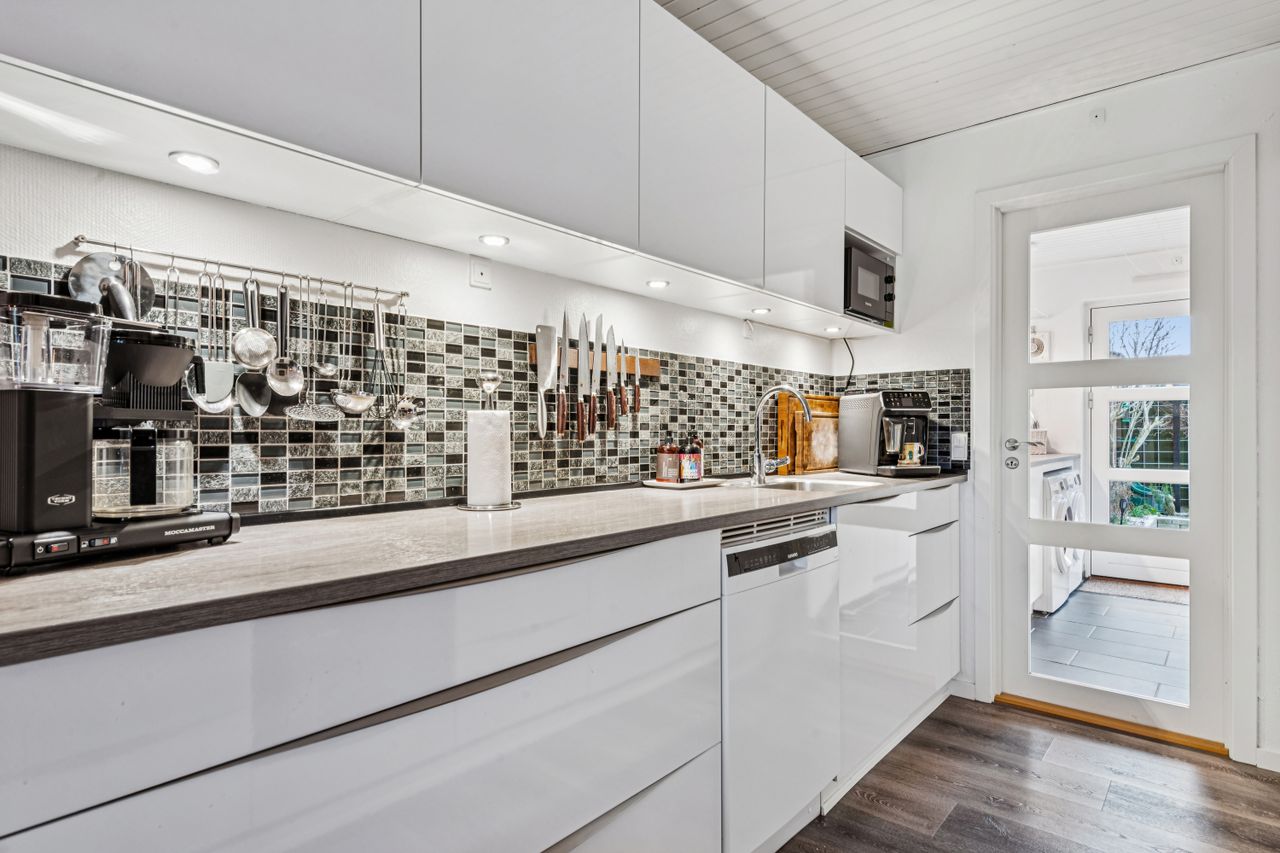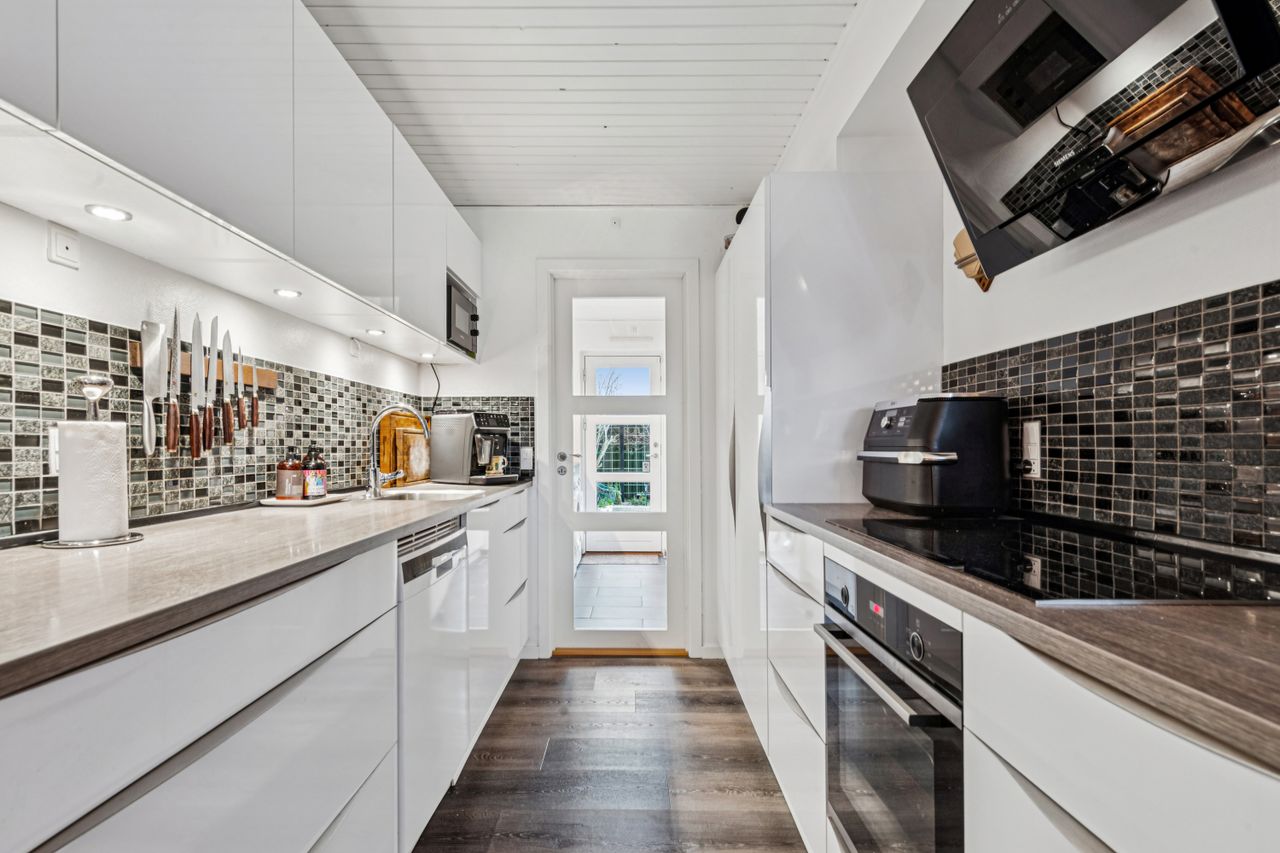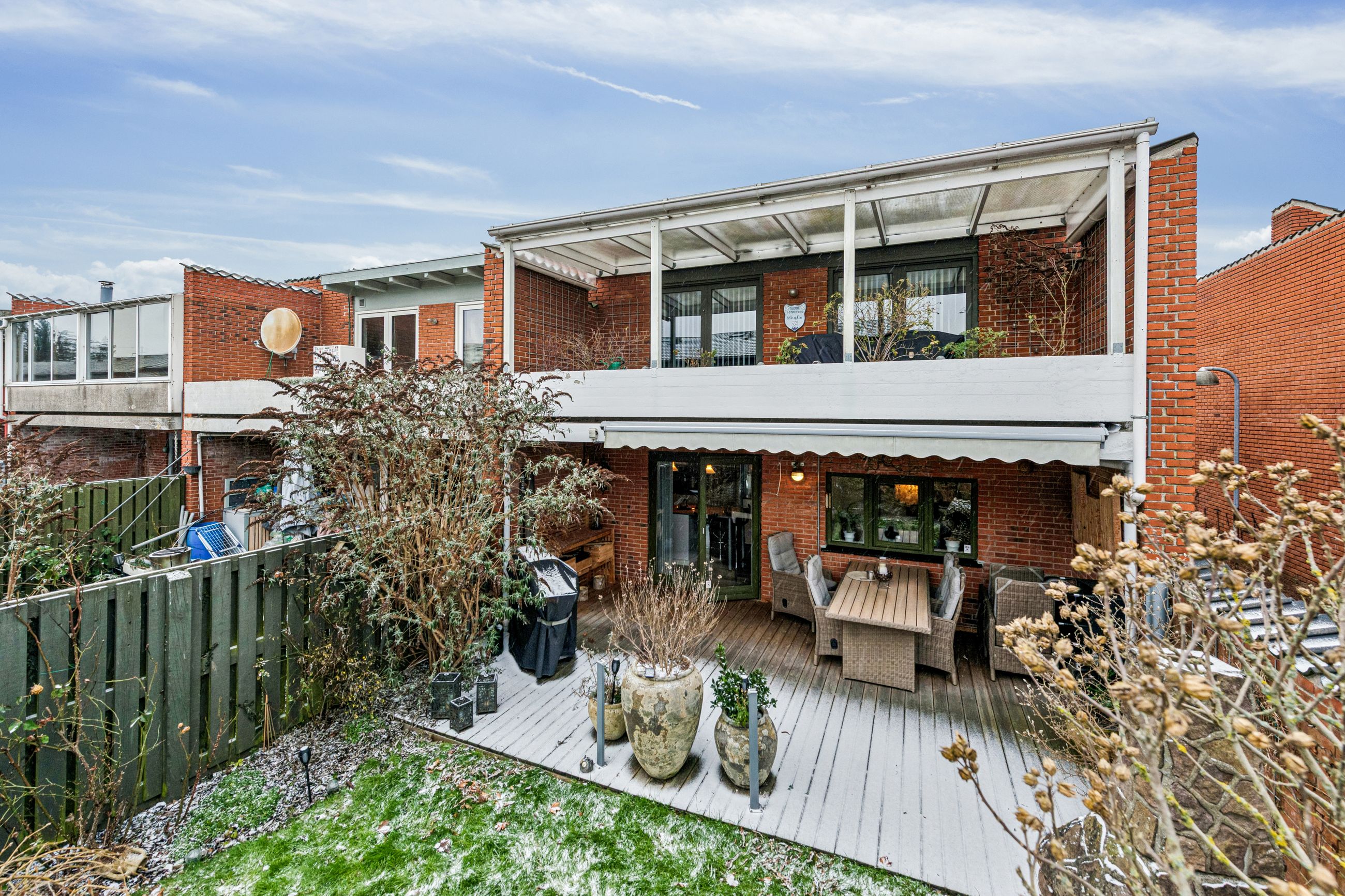 Med i købet får du en dejlig flisebelagt forhave og en skøn baghave med overdækket terrasse. Ydermere får du også en stort carport, så bil og cykler kan hildes fri for sne samt et stort og praktisk udhus.