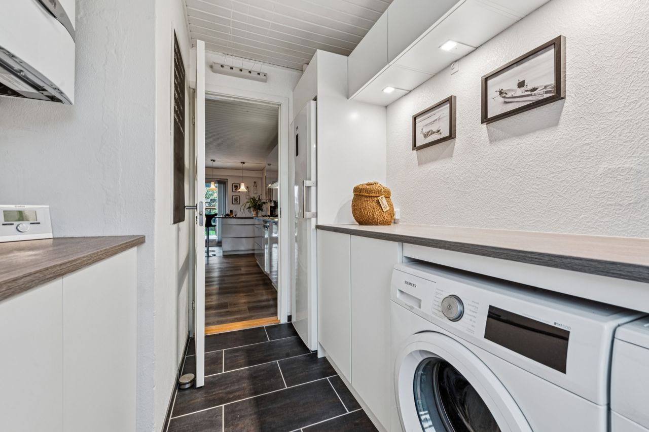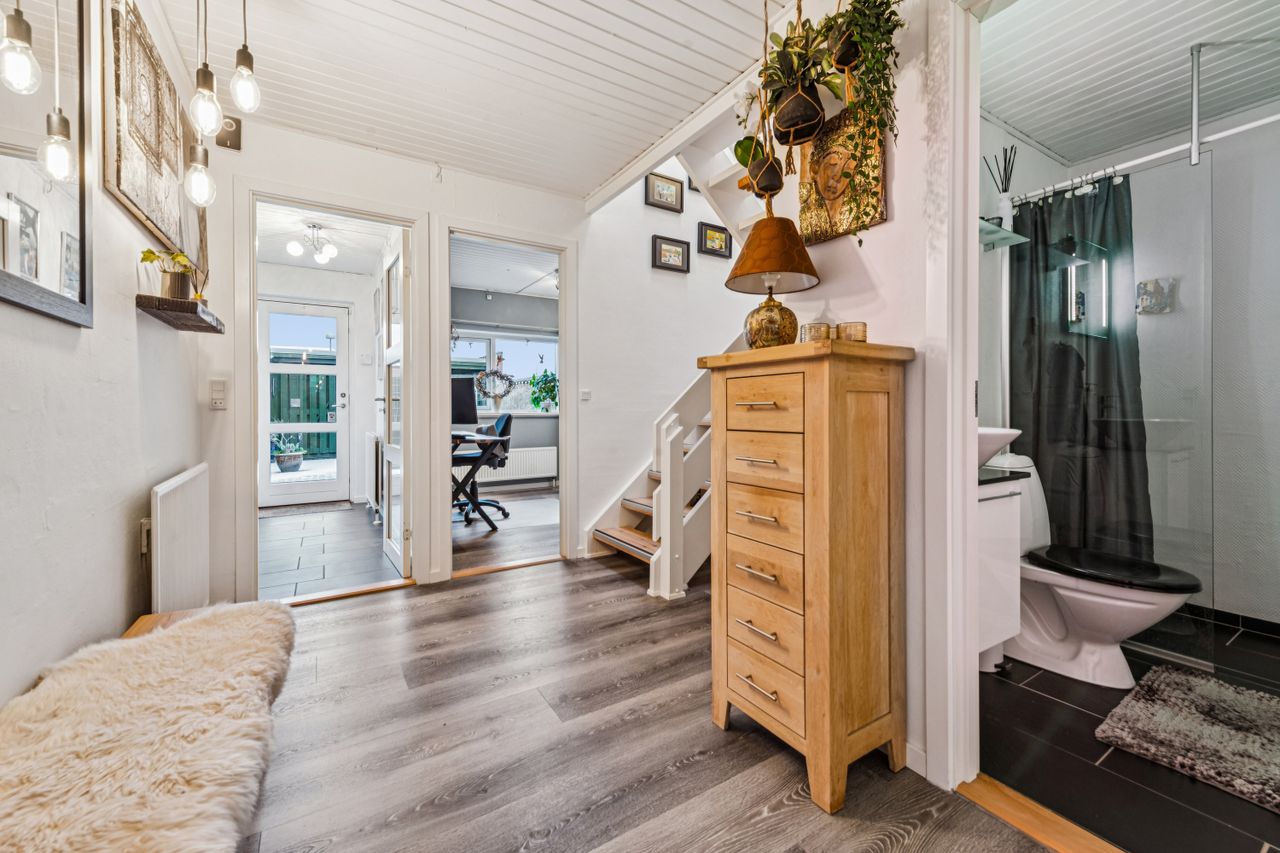 I stueplan bliver du mødt af det lyse køkken/alrum, der fungerer som hjemmets naturlige samlingspunkt. Her er god plads til både madlavning, samvær og lektielæsning. Her er også et skønt værelse med indbyggede skabe. Man kan nemt (gen)etablere en skillevæg ved køkkenet, hvorved man kan opnå et ekstra værelse. Badeværelse med pæne fliser og brus. Lækkert bryggers med god aflægger plads og en ekstra dør til forhaven. Fra køkkenet er er udgang til boligens dejlige overdækkede terrasse og solrige have.