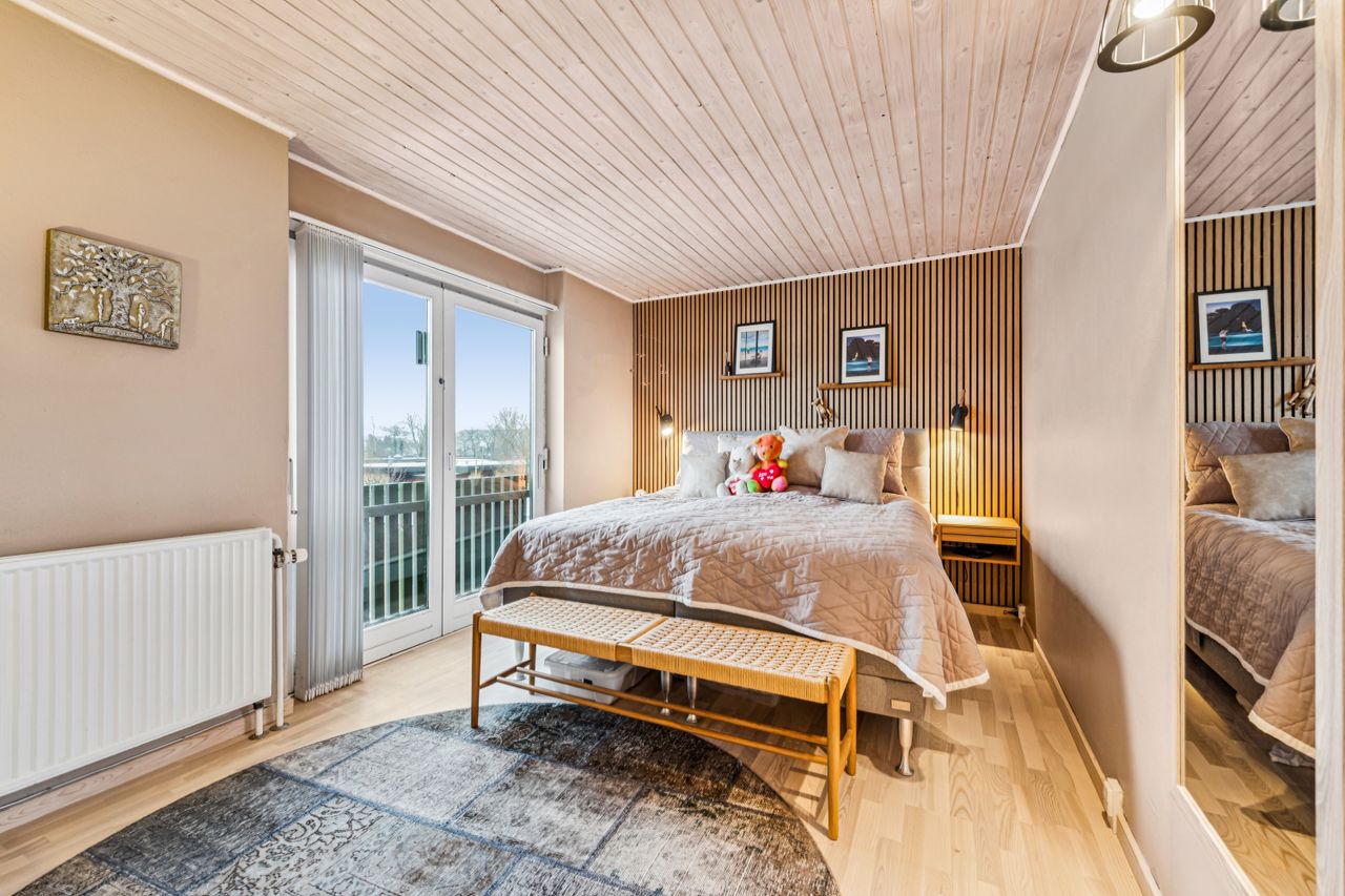 På førstesalen finder du ”master-bedroom” og her er lavet et dejligt ”walk-in” closet i forlængelse af værelset. Flot badeværelse med bruseniche. Stor stue med vinduer i hele rummets bredde og udgang til herlig altan, hvor aften solen virkelig kan nydes. Såfremt der ønskes flere rum/værelser på førstesalen, så kan man også dele stuen op med en skillevæg.