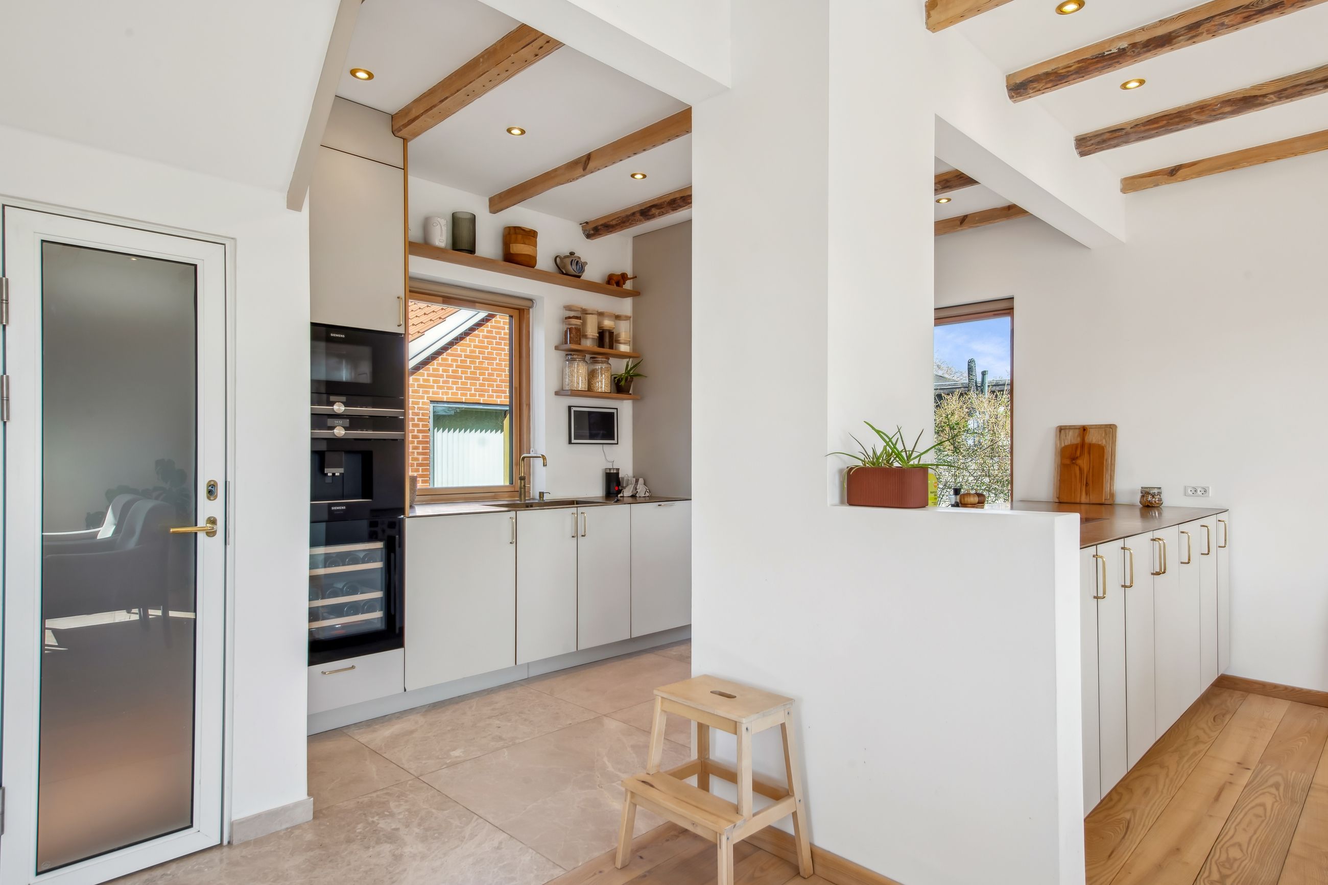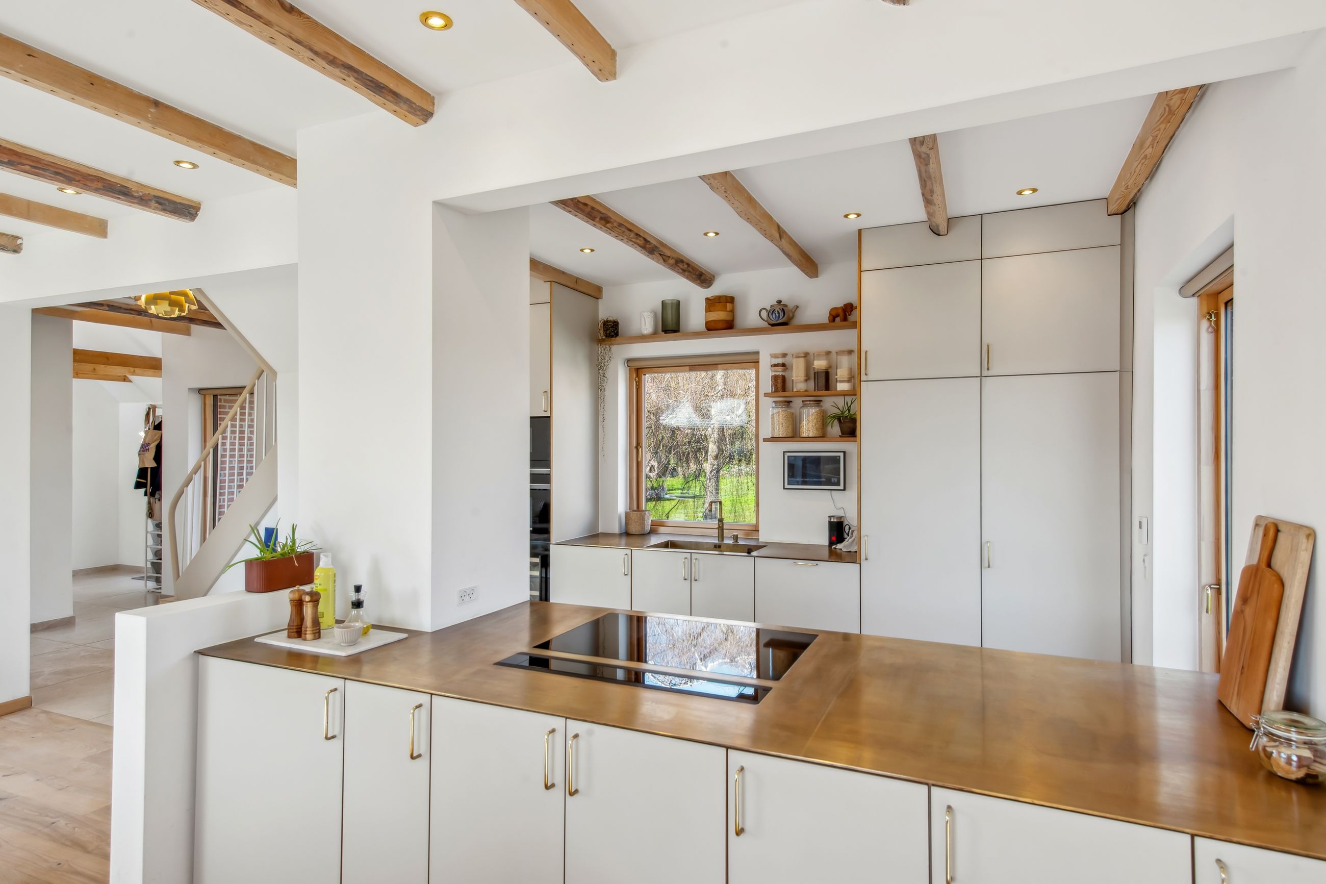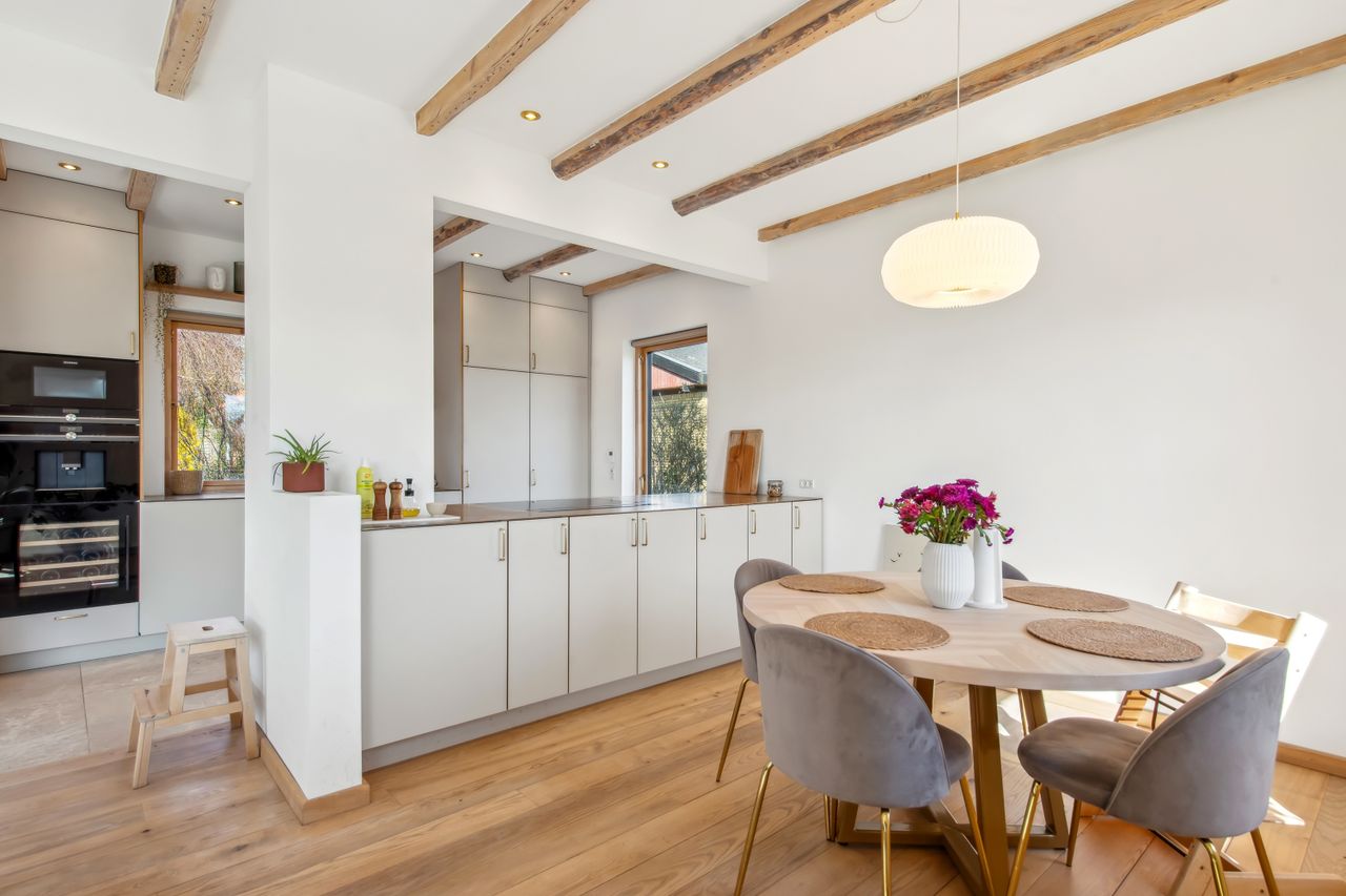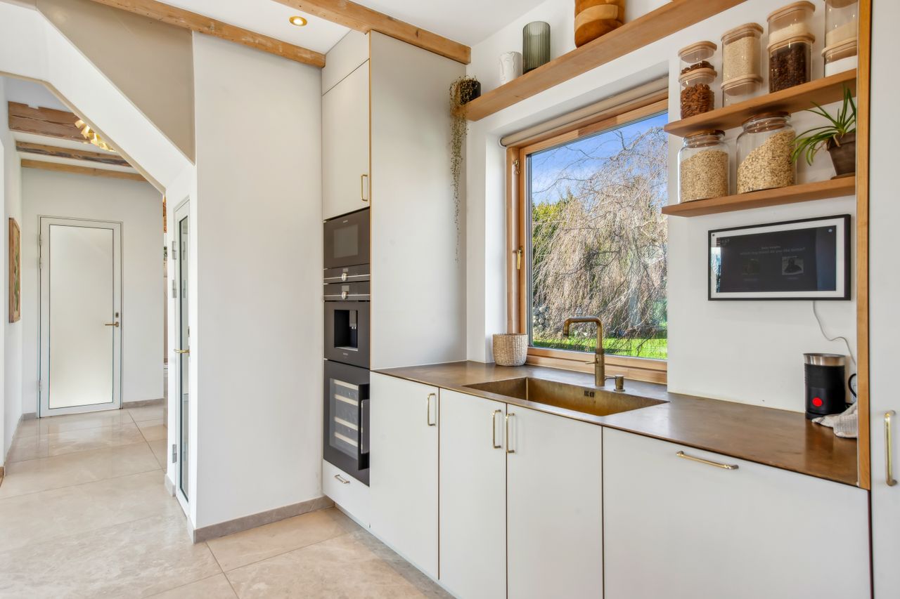 Køkkenelementene er fra Ikea, men installeret med linoleumslåger fra ArkiStudio med massive messing greb, samt en særdeles flot bordplade i massiv messing. Aller hårde hvidevarer er fra Siemens, og der er desuden installeret kaffemaskine, vinkøleskab samt Quooker i messing. Den røde, eksklusive tråd afviges bestemt ikke!