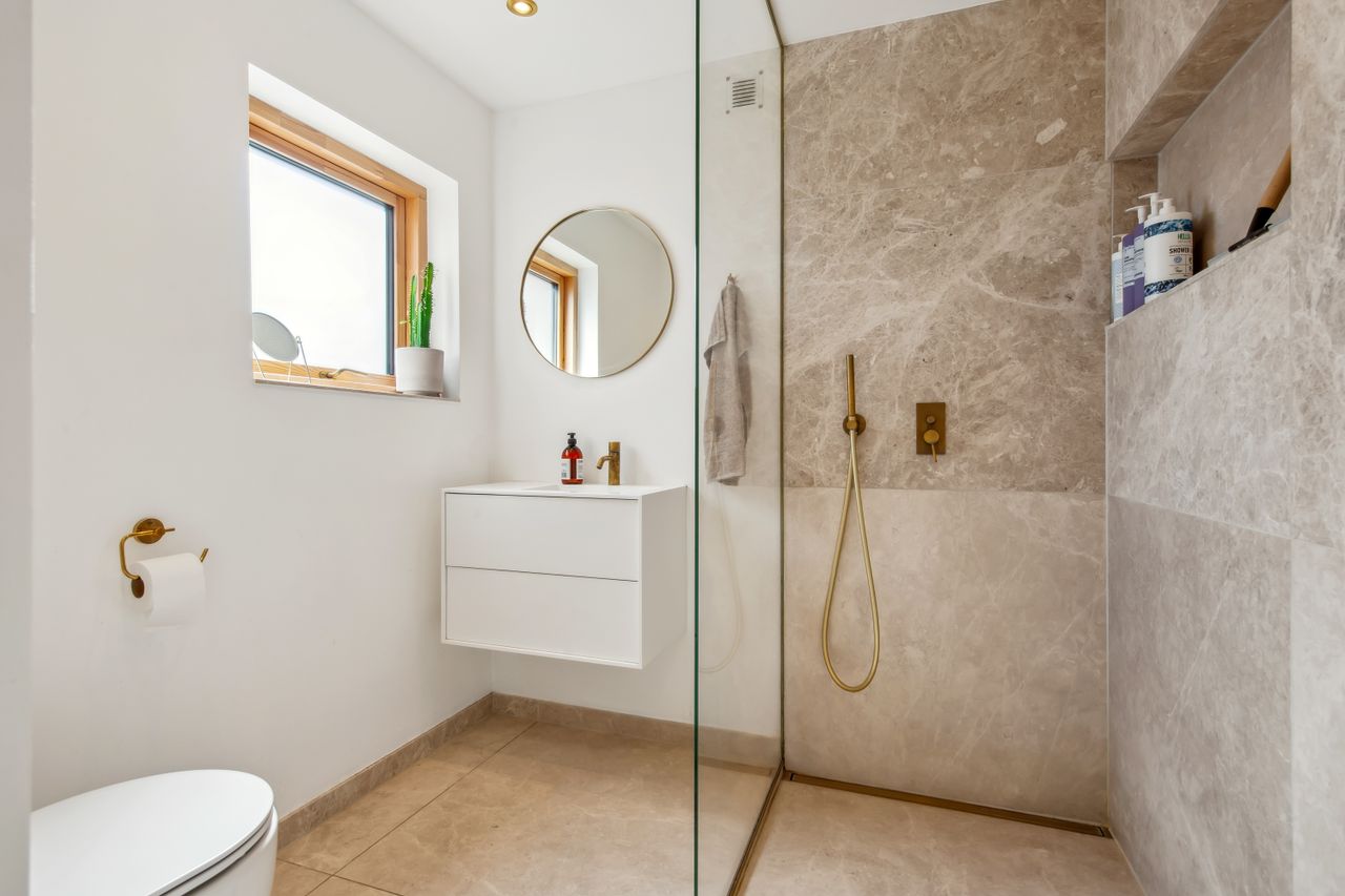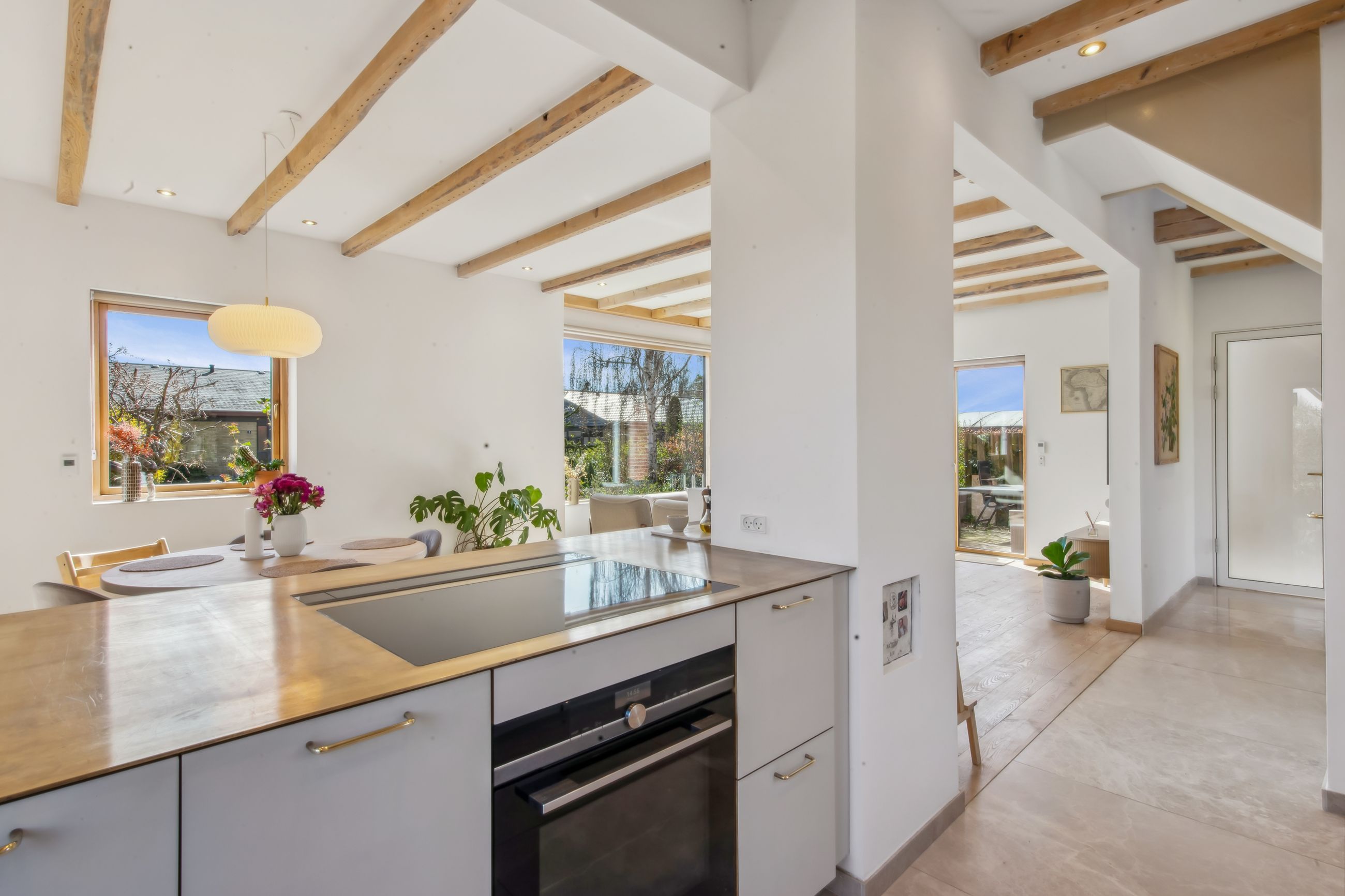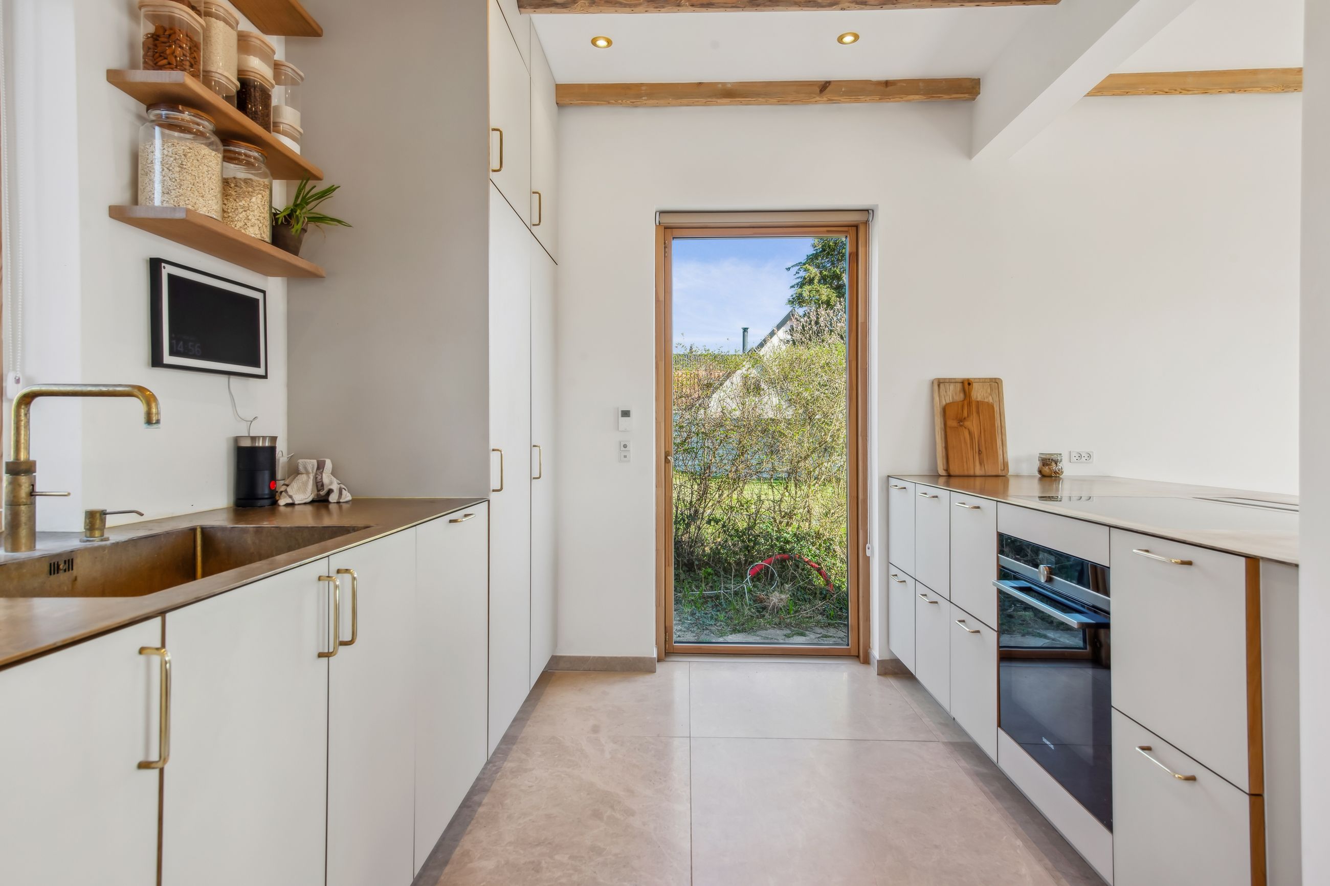 Køkkenelementene er fra Ikea, men installeret med linoleumslåger fra ArkiStudio med massive messing greb, samt en særdeles flot bordplade i massiv messing. Aller hårde hvidevarer er fra Siemens, og der er desuden installeret kaffemaskine, vinkøleskab samt Quooker i messing. Den røde, eksklusive tråd afviges bestemt ikke!