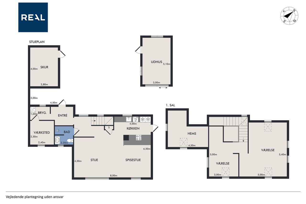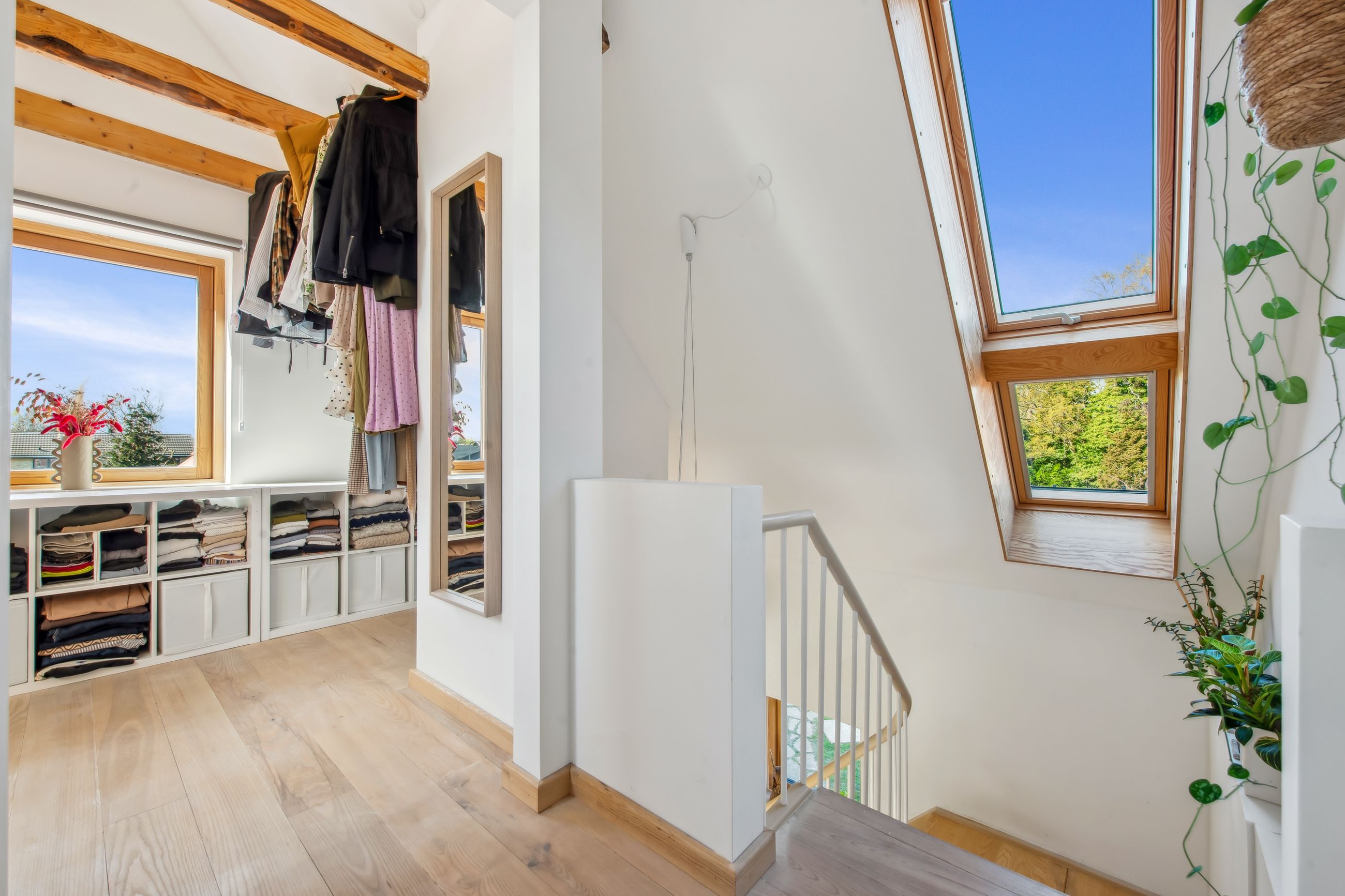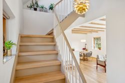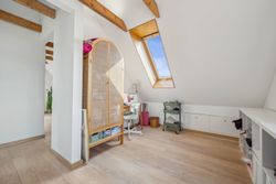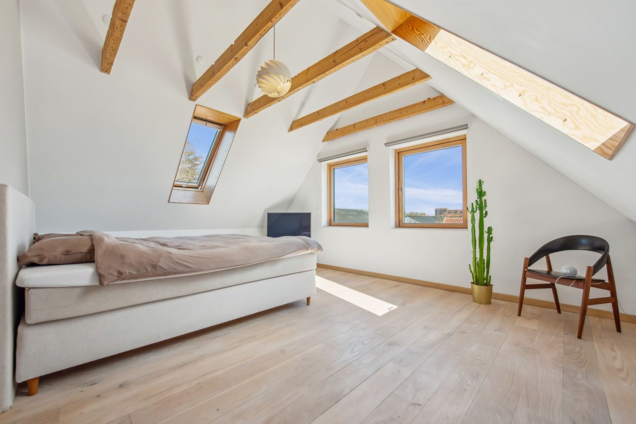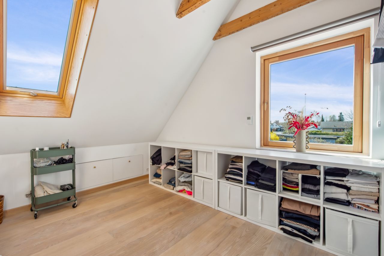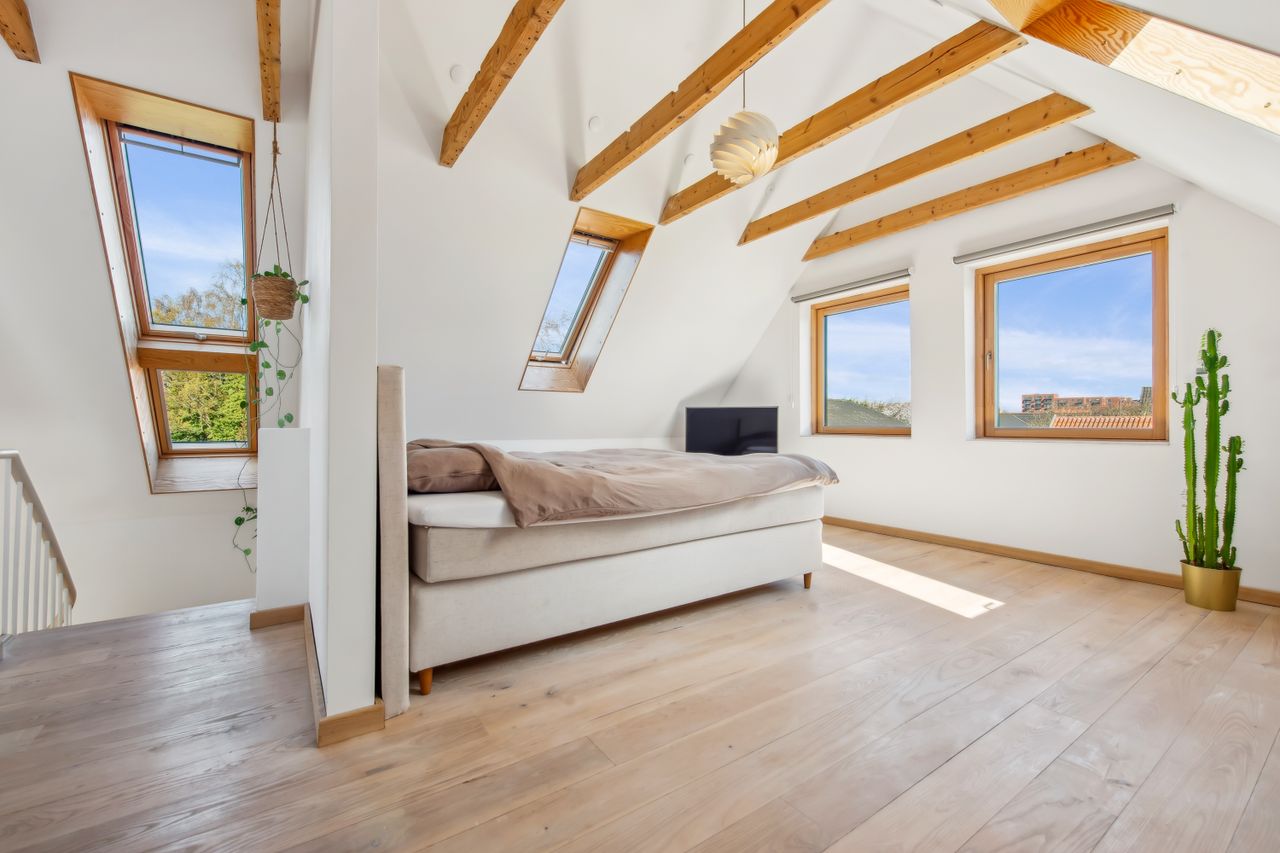 På 1.sal er der klargjort til at kunne opdele det store soveværelse til to, såfremt man måtte have behov for et ekstra værelse - og det er naturligvis også muligt at isætte døre, og lukke af heroppe, skulle det ønskes. Ud over det, hører der til ejendommen et fantastisk flot udhus, istandsat fuldstændig i sync med villaen.
