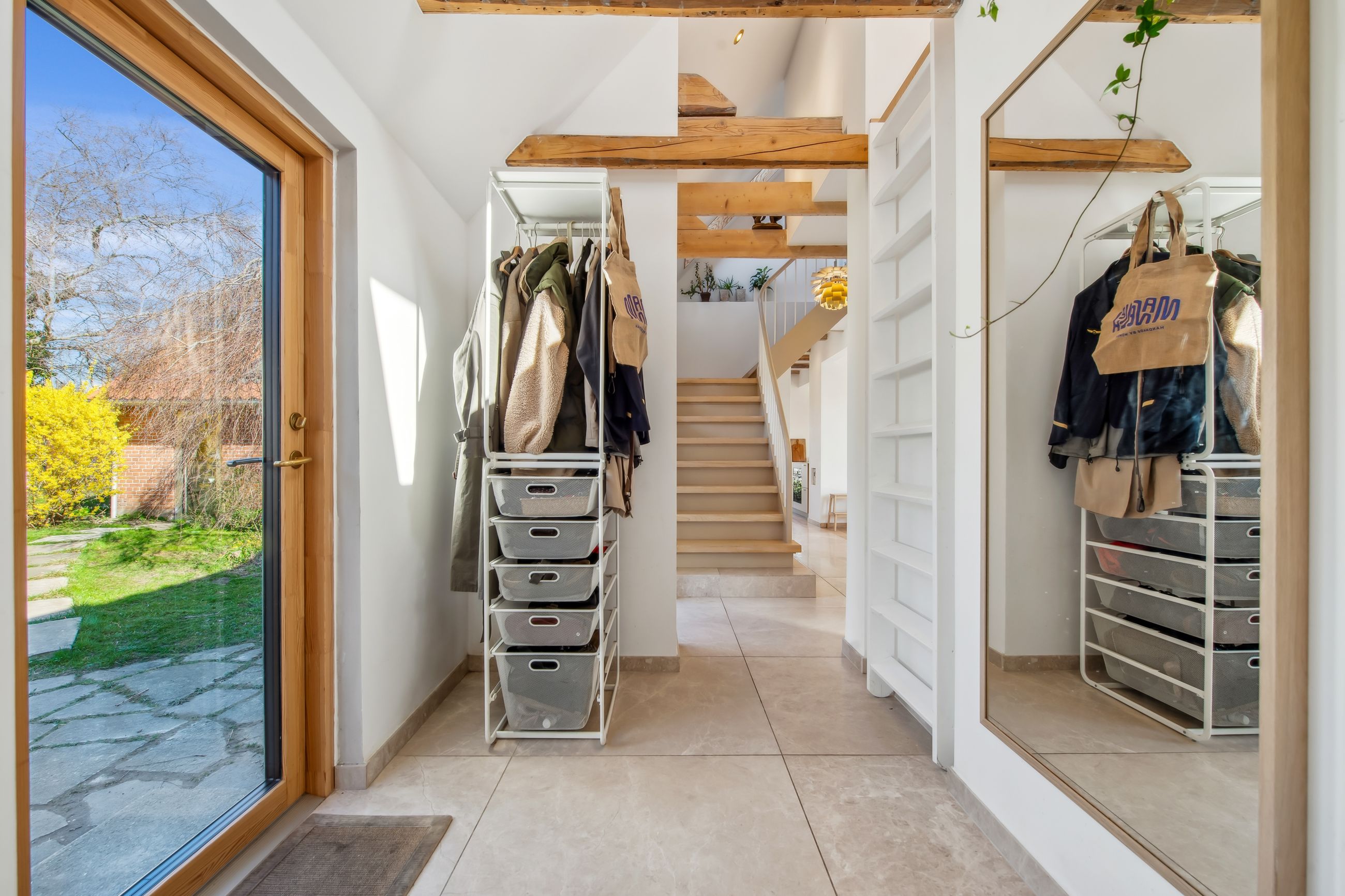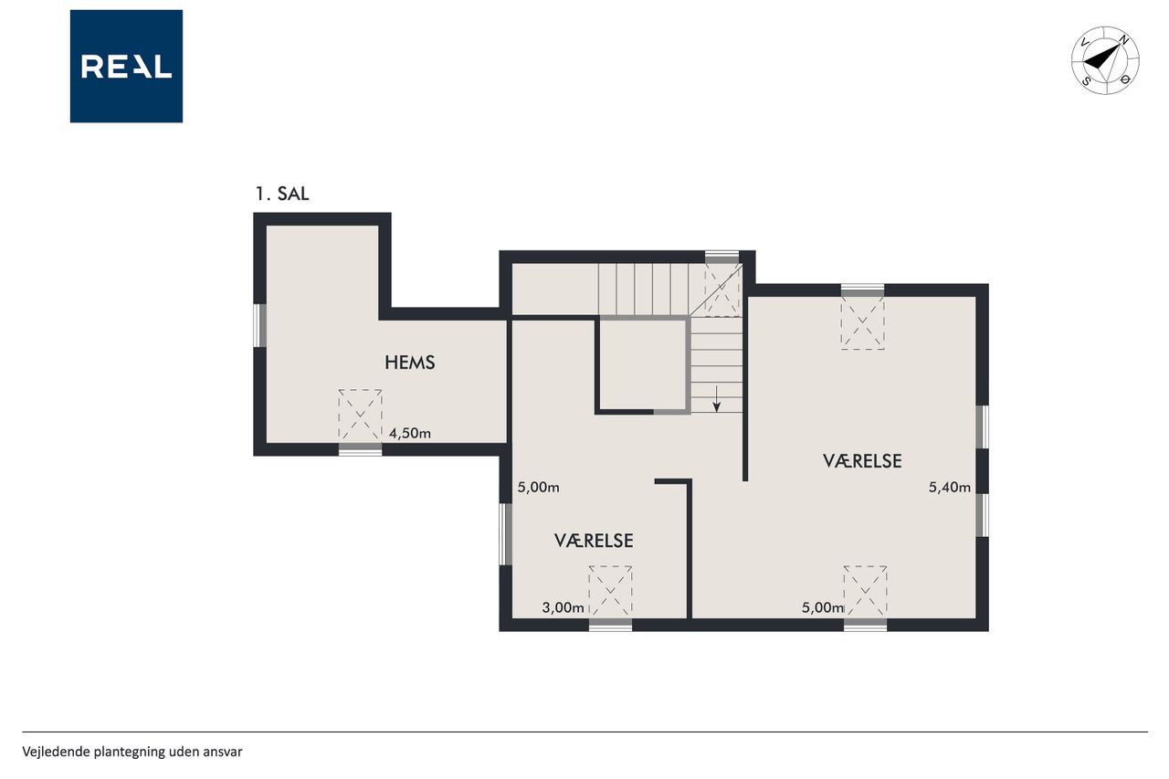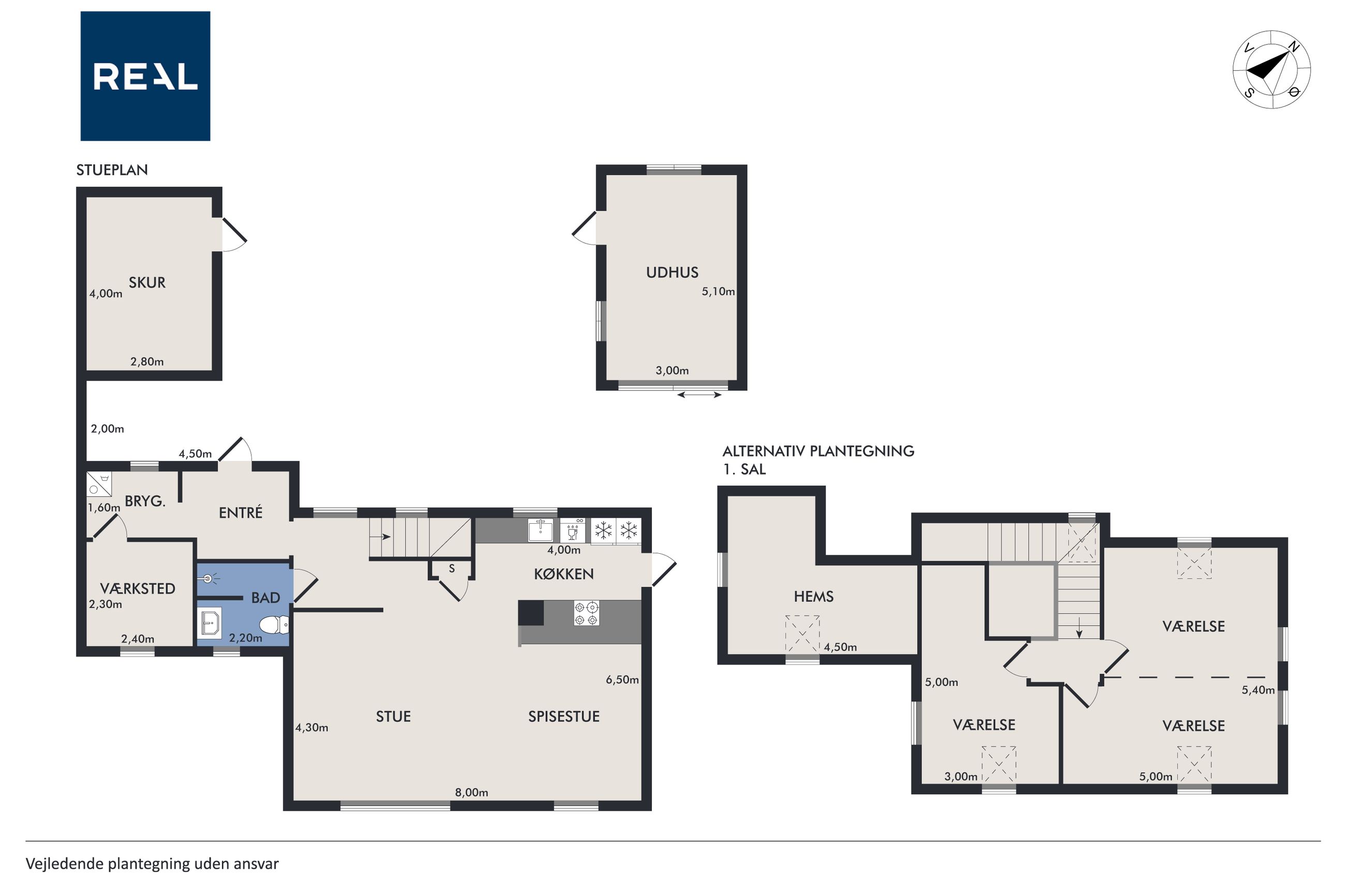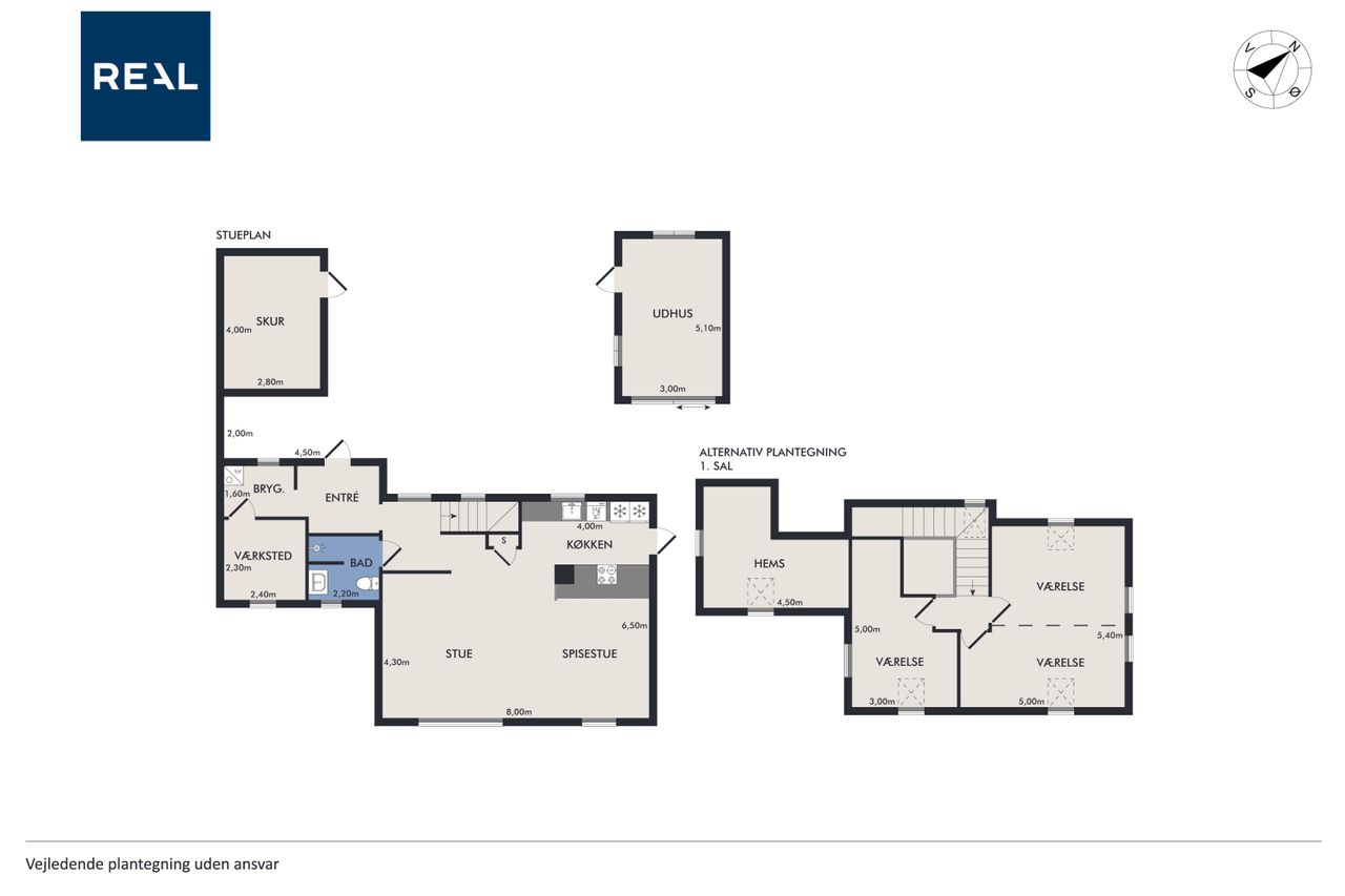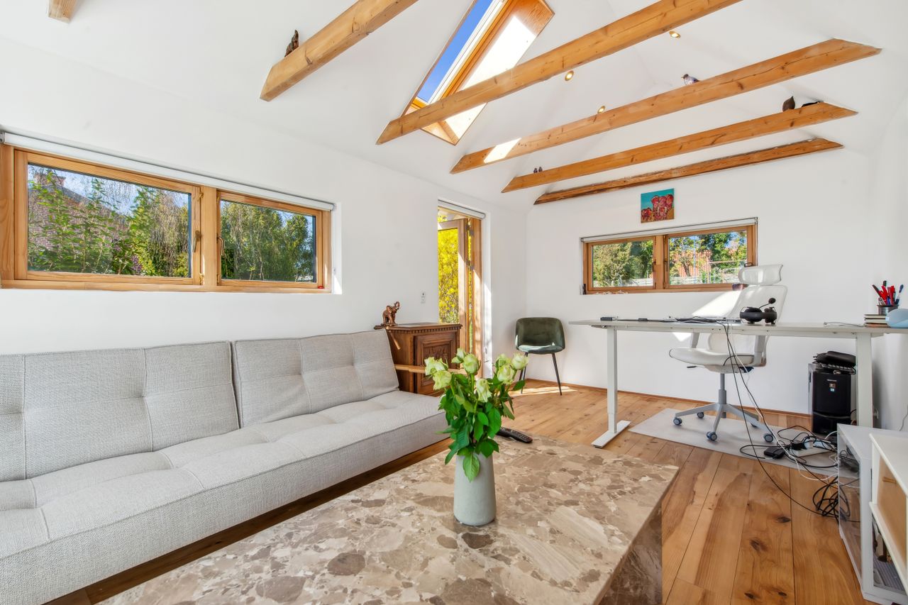 På 1.sal er der klargjort til at kunne opdele det store soveværelse til to, såfremt man måtte have behov for et ekstra værelse - og det er naturligvis også muligt at isætte døre, og lukke af heroppe, skulle det ønskes. Ud over det, hører der til ejendommen et fantastisk flot udhus, istandsat fuldstændig i sync med villaen.