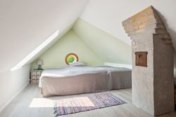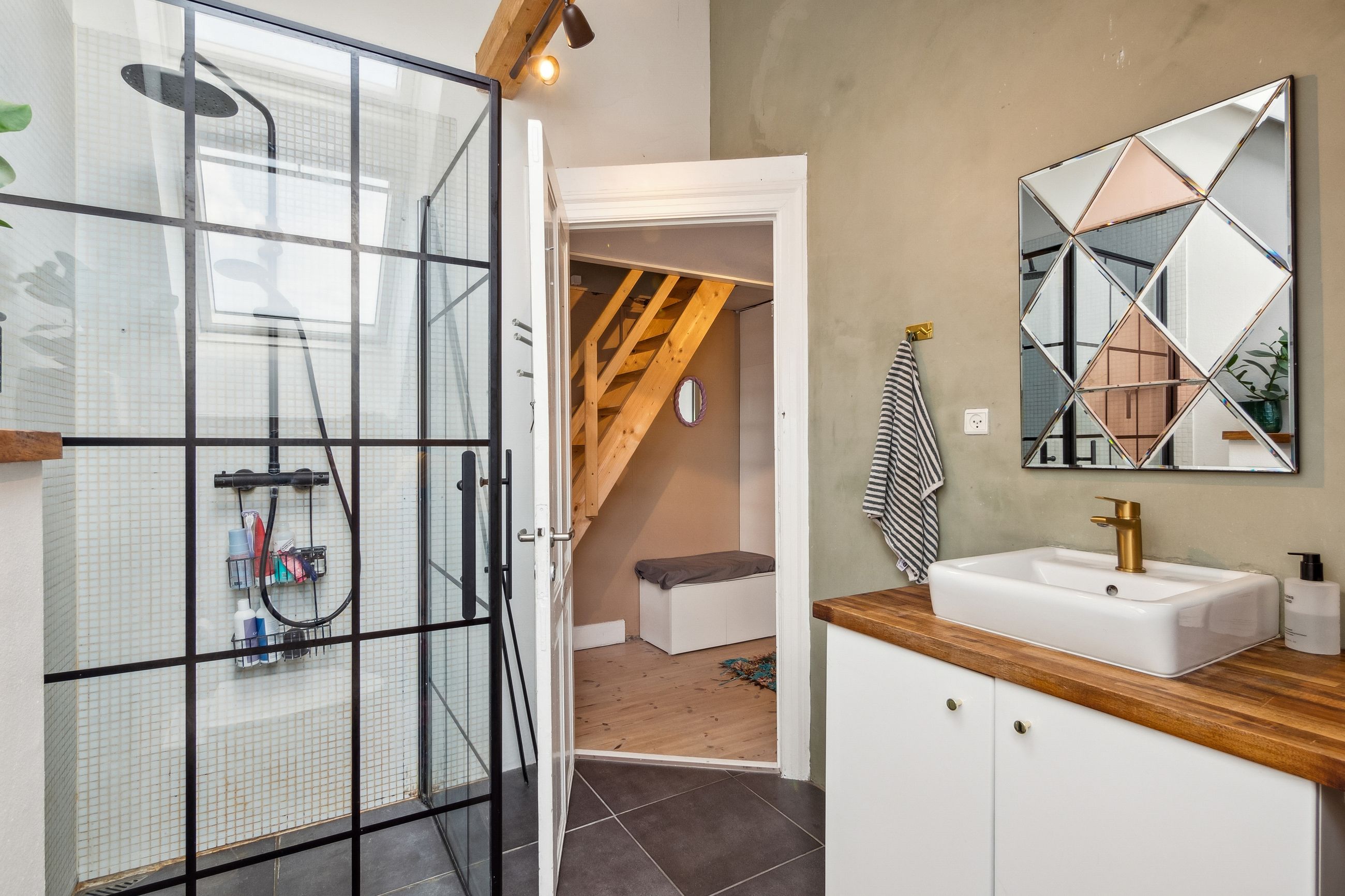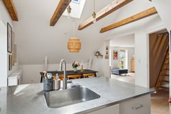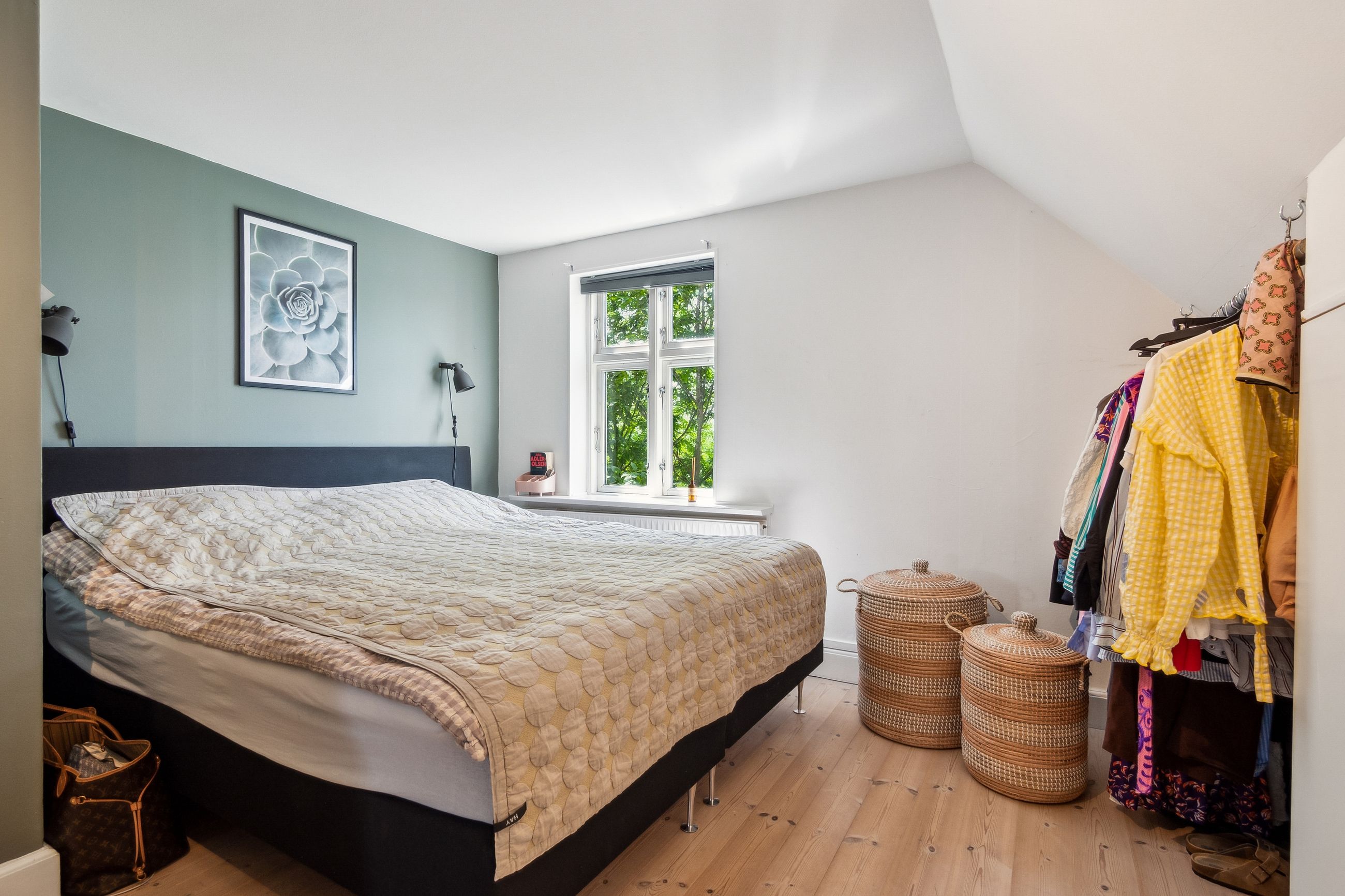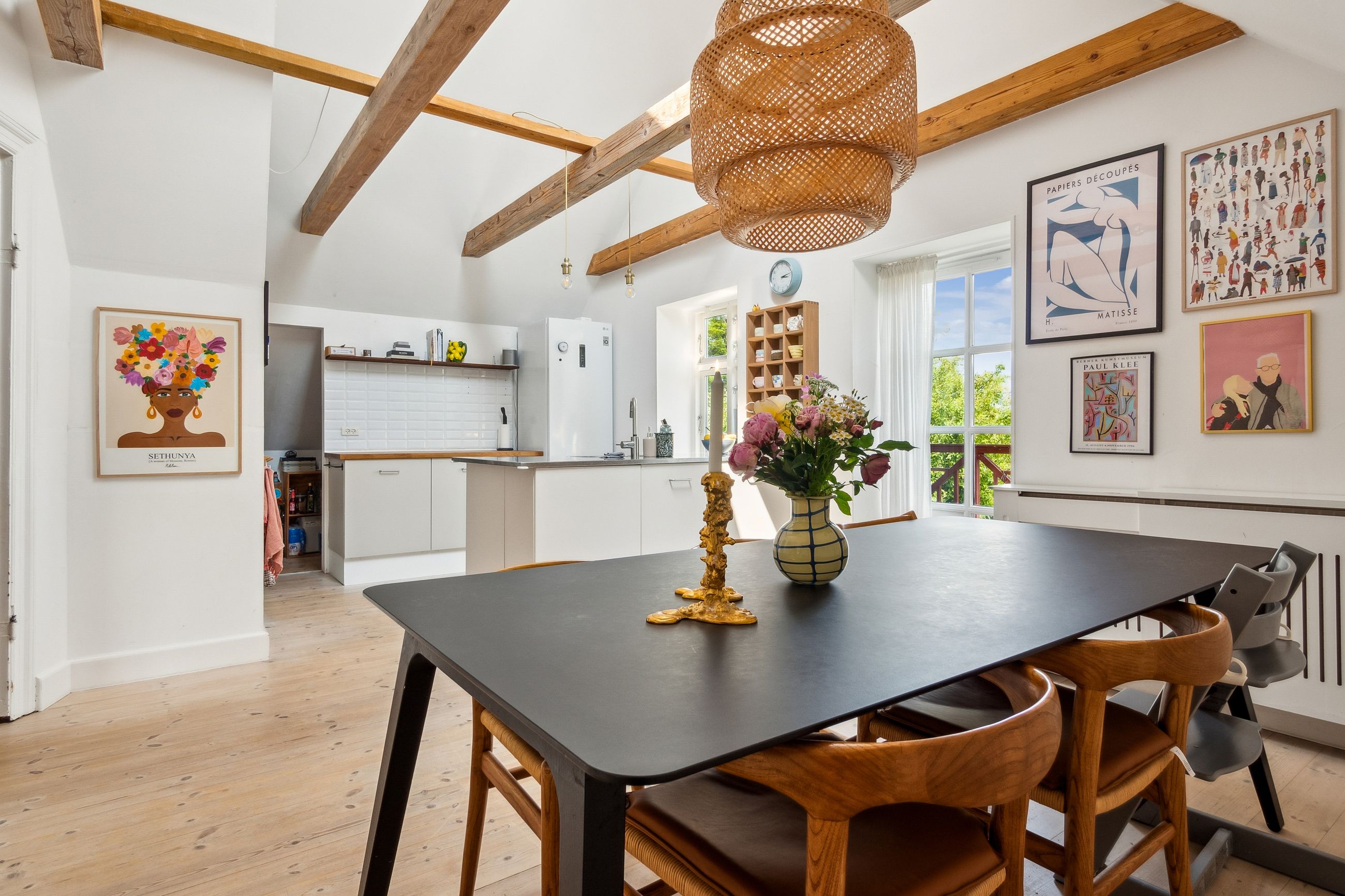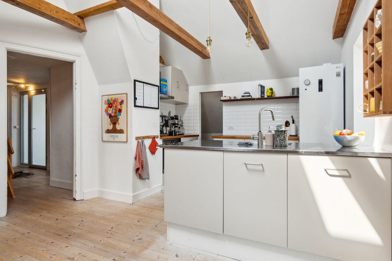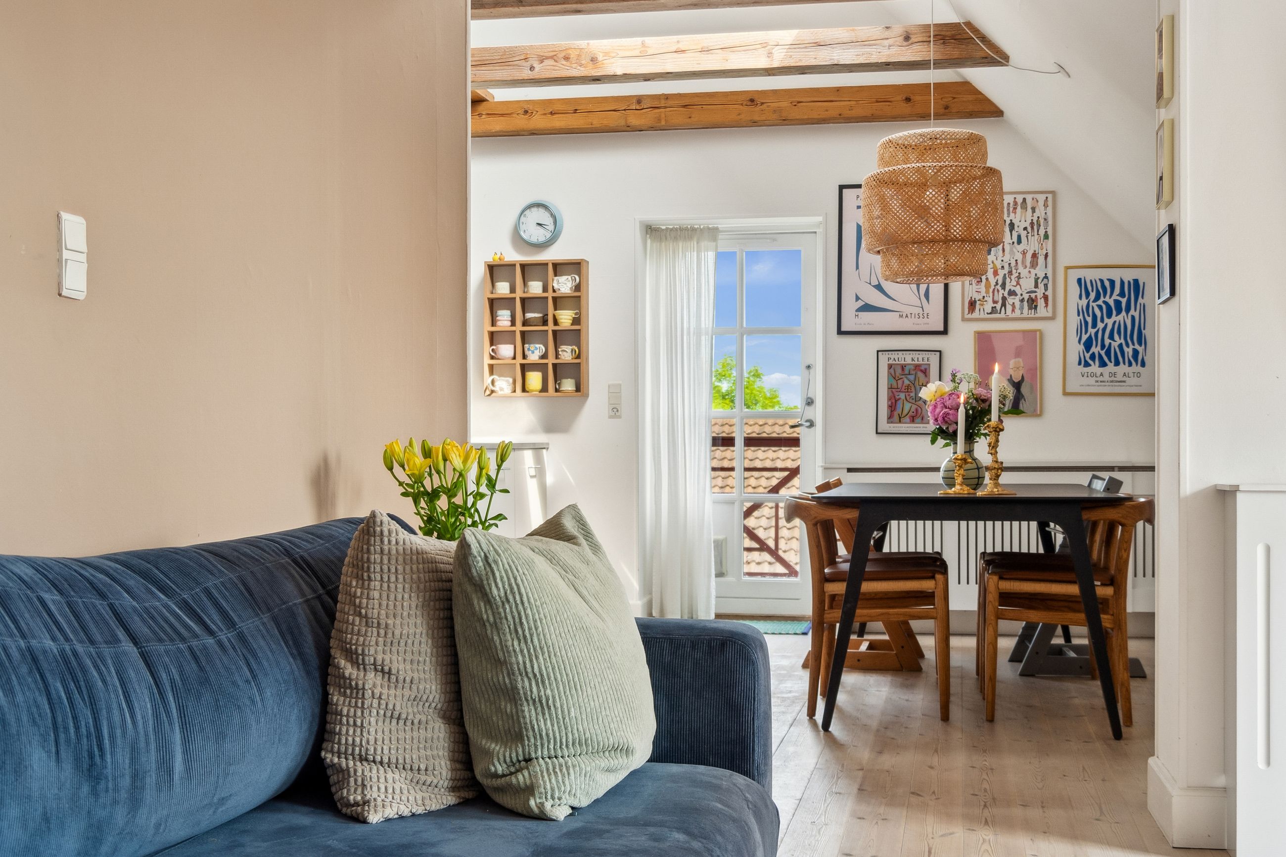 Villalejligheden består af det mest magiske køkken alrum med loft til kip, fritlagte bjælker, ovenlysvindue - samt et lille viktualierum. I køkken alrummet findes den ene adgang til boligen. Videre er en meget hyggelig stue, med to døre ud til den fine balkon. Ydermere er der to rigtig gode værelser, samt et stort, flot badeværelse - i ægte new yorker stil, med stor bruseniche. Til lejligheden hører en helt fantastisk og hyggelig hems, som tilføjer over 30 virkelig brugbare kvadratmeter, til boligen - hvilken på fineste vis, supplerer med plads til familien eller overnattende gæster. Et kæmpe aktiv for lejligheden.