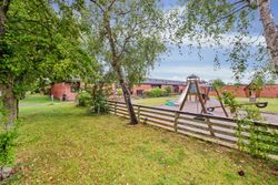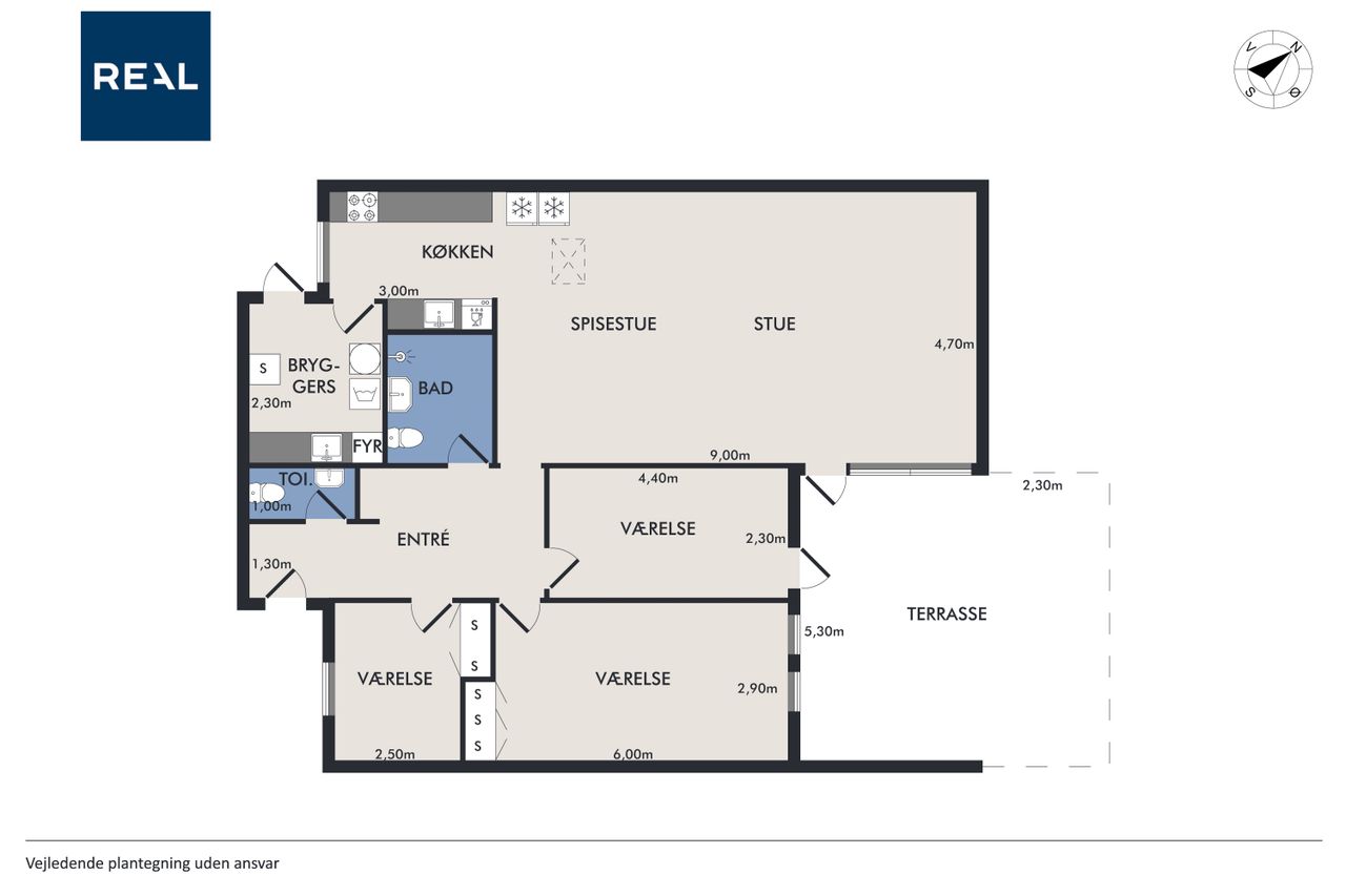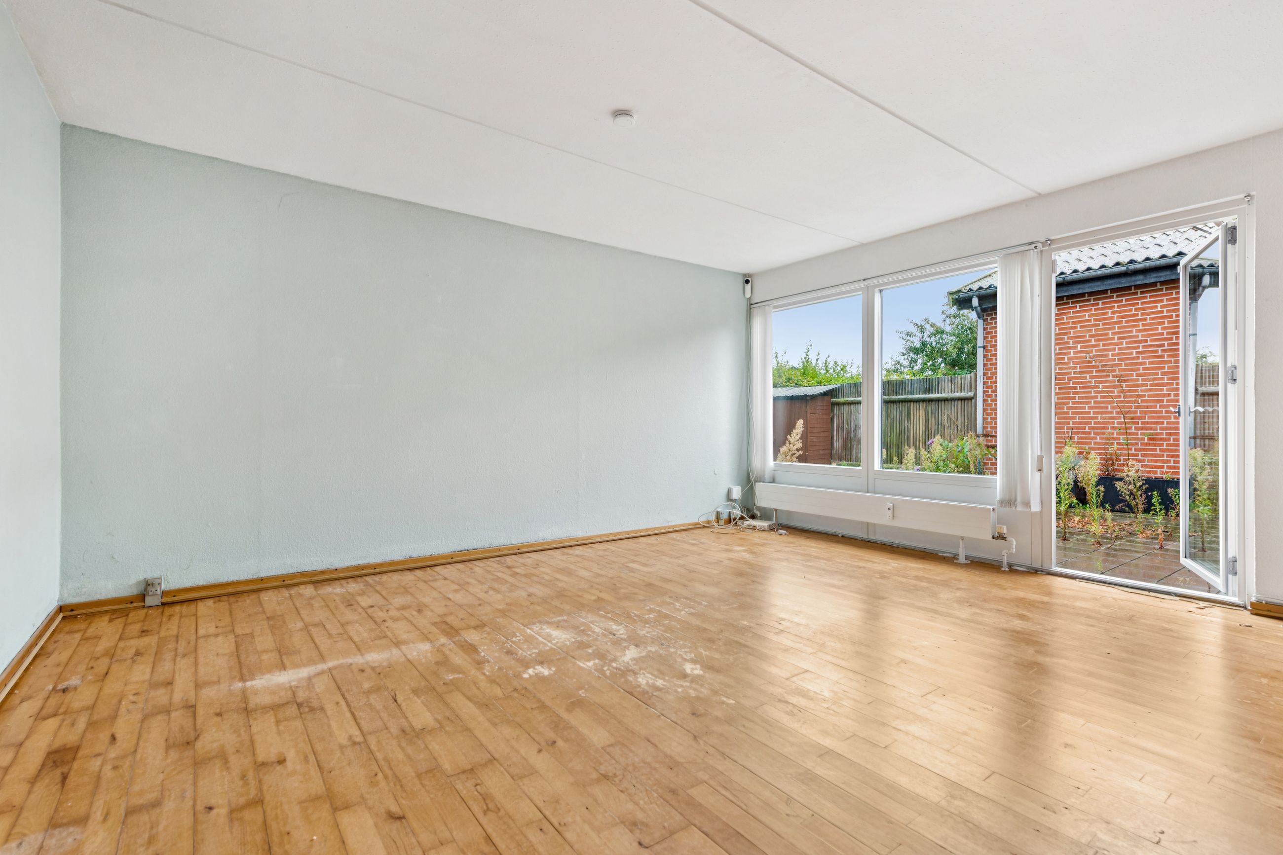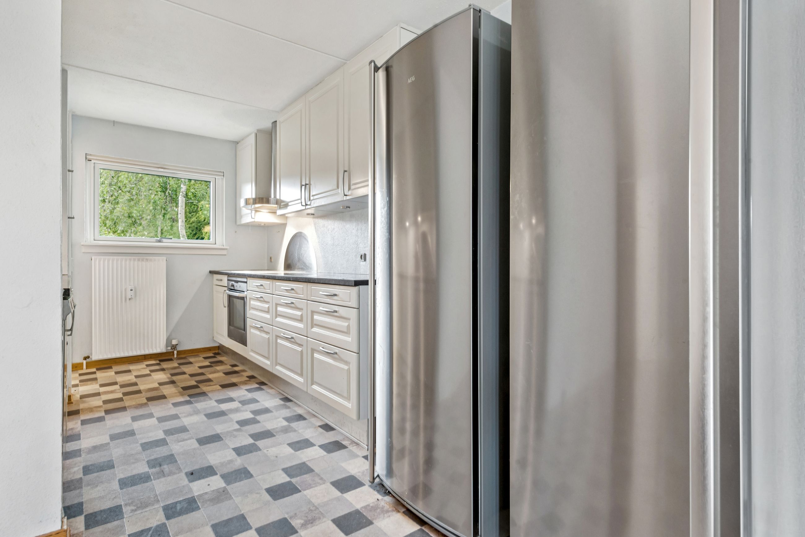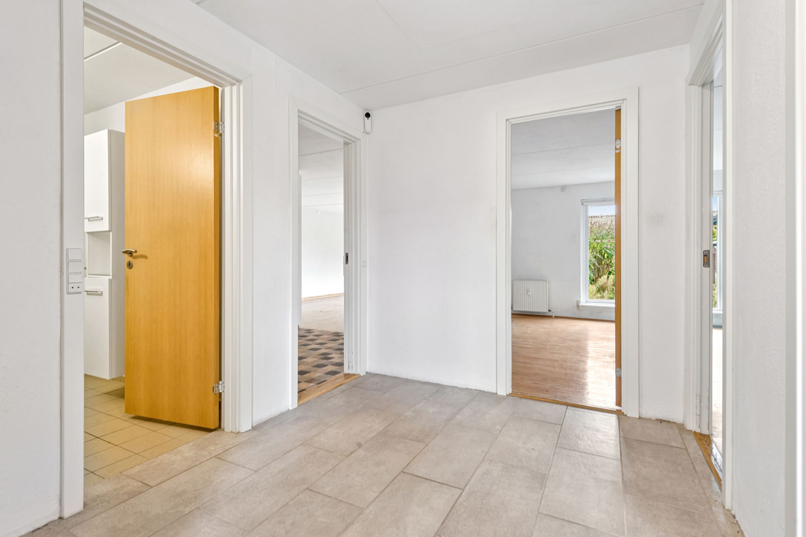 Denne fine bolig byder på en rummelig fordelingsentré. Pænt køkken med god bord- og skabsplads og fin plads til spisebord. Køkkenet ligger i åben forbindelse med stuen, hvor de store vinduespartier efterlader et skønt herligt lysindfald. Fra stuen er der udgang til en dejlig flisebelagt terrasse og have. Stort badeværelse med lyse fliser og bruseniche. Mulighed for at etablere et ekstra gæstetoilet. Tre gode værelser der kan fordeles efter behov. Praktisk bryggers med separat ind- og udgang.