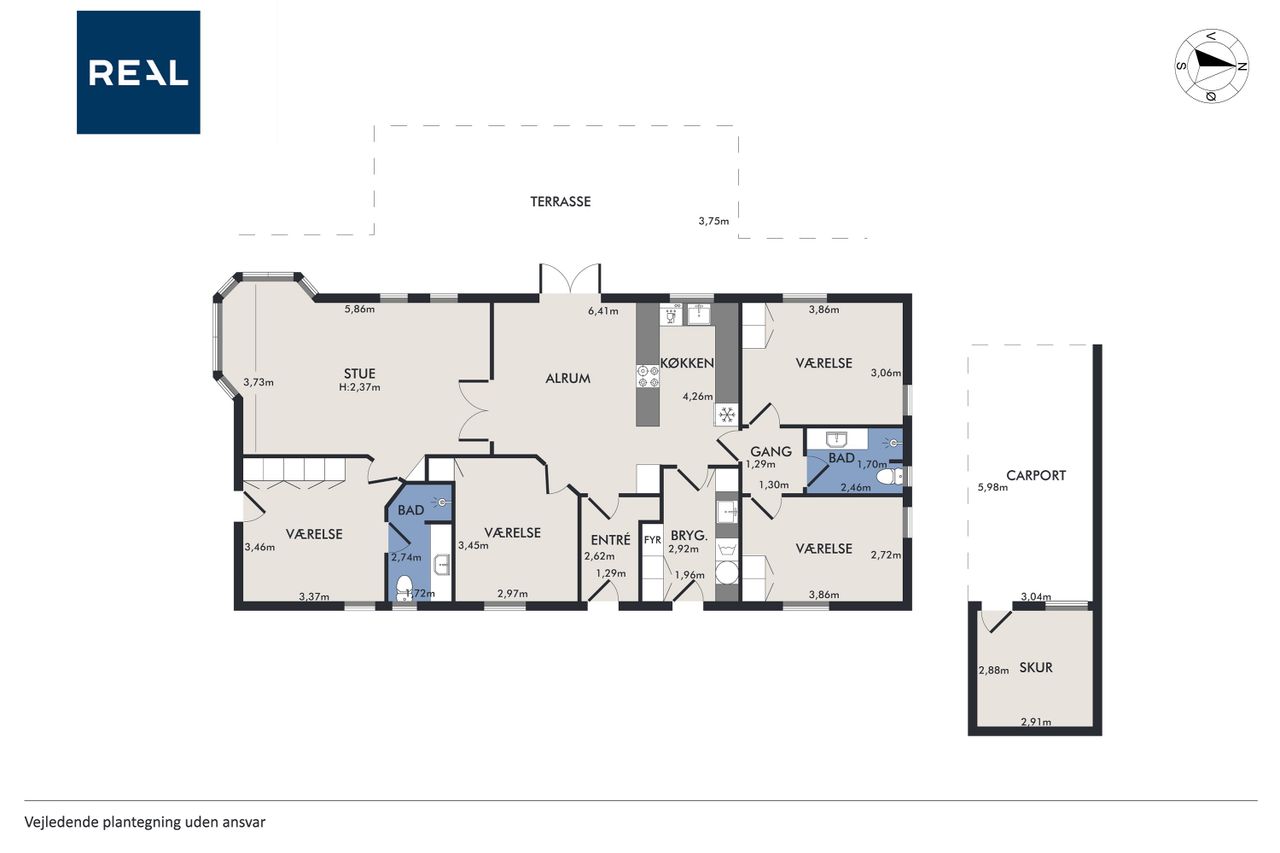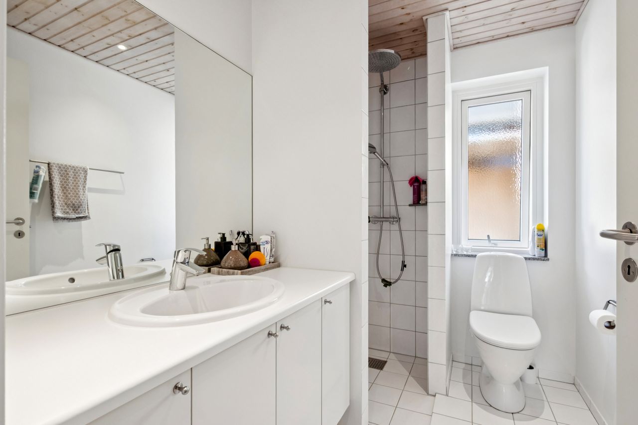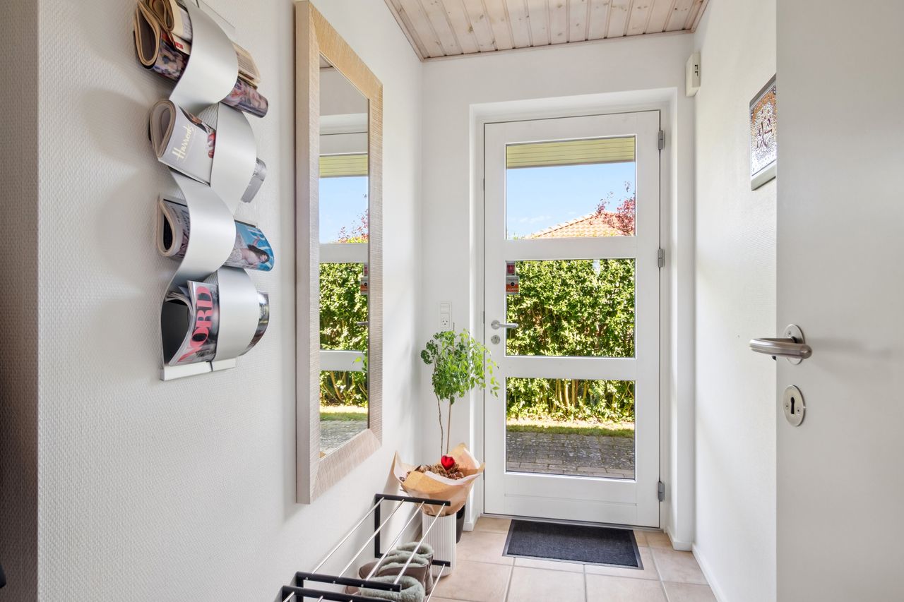 Boligen indeholder en lys og rummelig entré. Et lækkert og praktisk bryggers, hvor der findes fin aflæggerplads samt både vaskemaskine og tørretumbler. Stort og dejligt køkken/alrum med lyse elementer og hårde hvidevarer i høj kvalitet. Fra køkkenet er der udgang til solrig terrasse. Stor stue med store vinduespartier samt udgang til solrig terrassen og skøn have. I får derudover hele 4 værelser, der kan fordeles efter behov. 2 flotte badeværelser med bruseniche - det ene med direkte adgang fra forældresoveværelset.