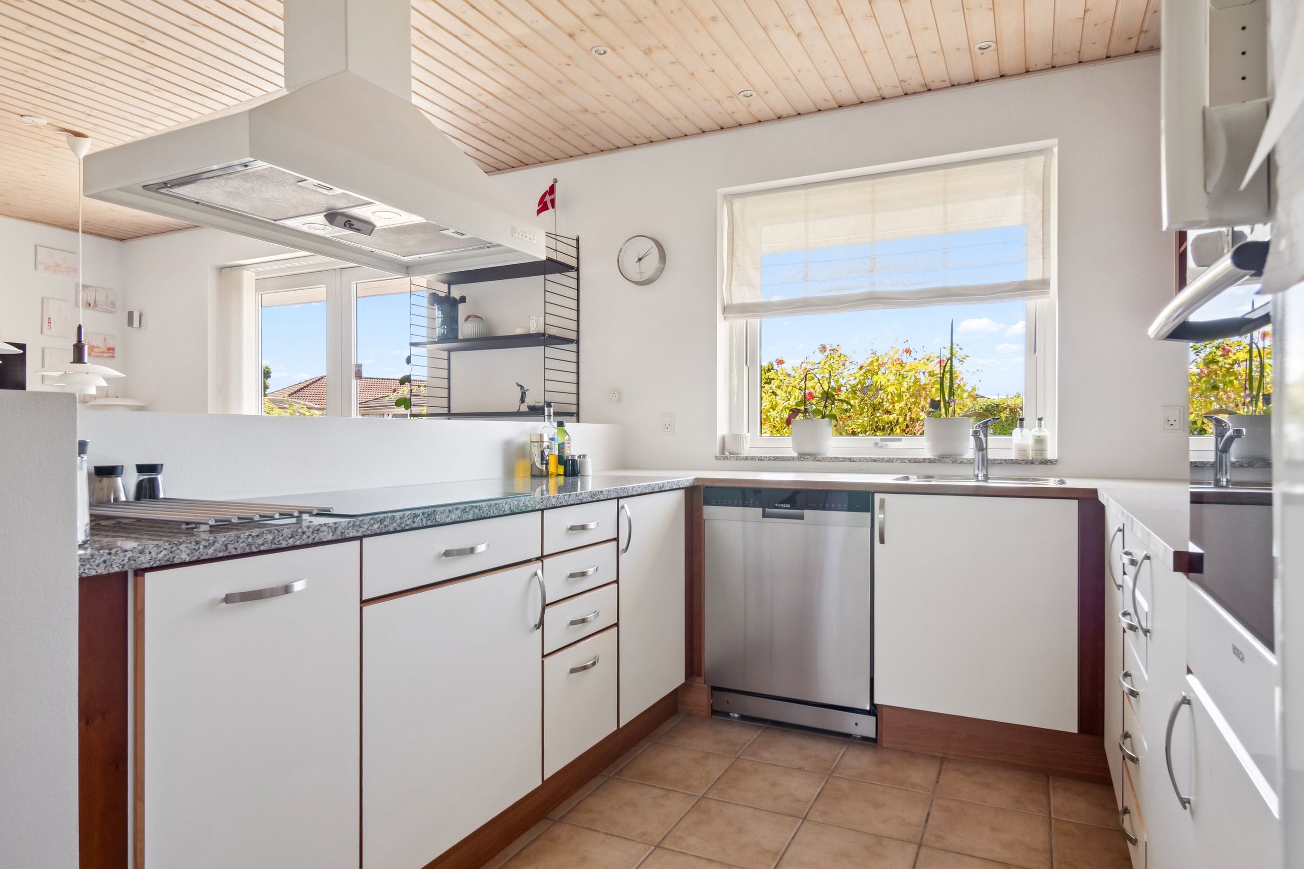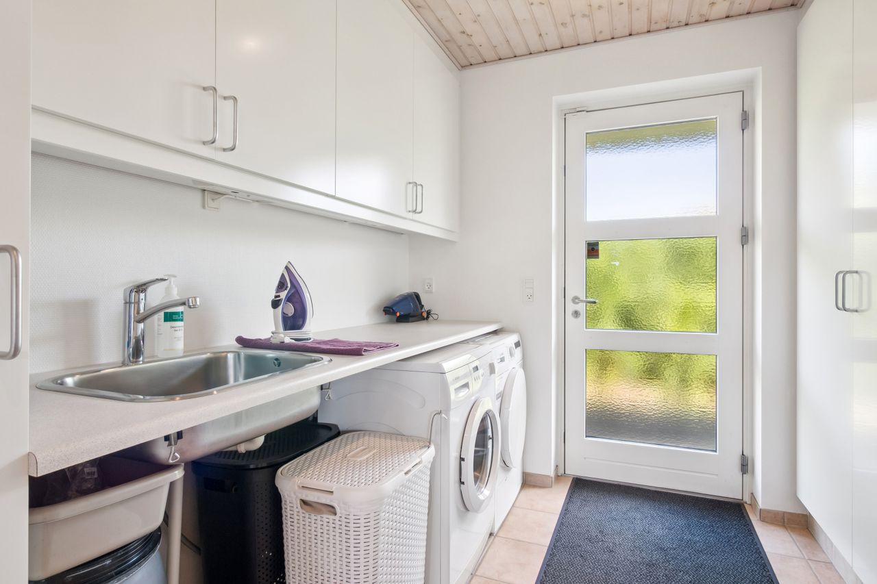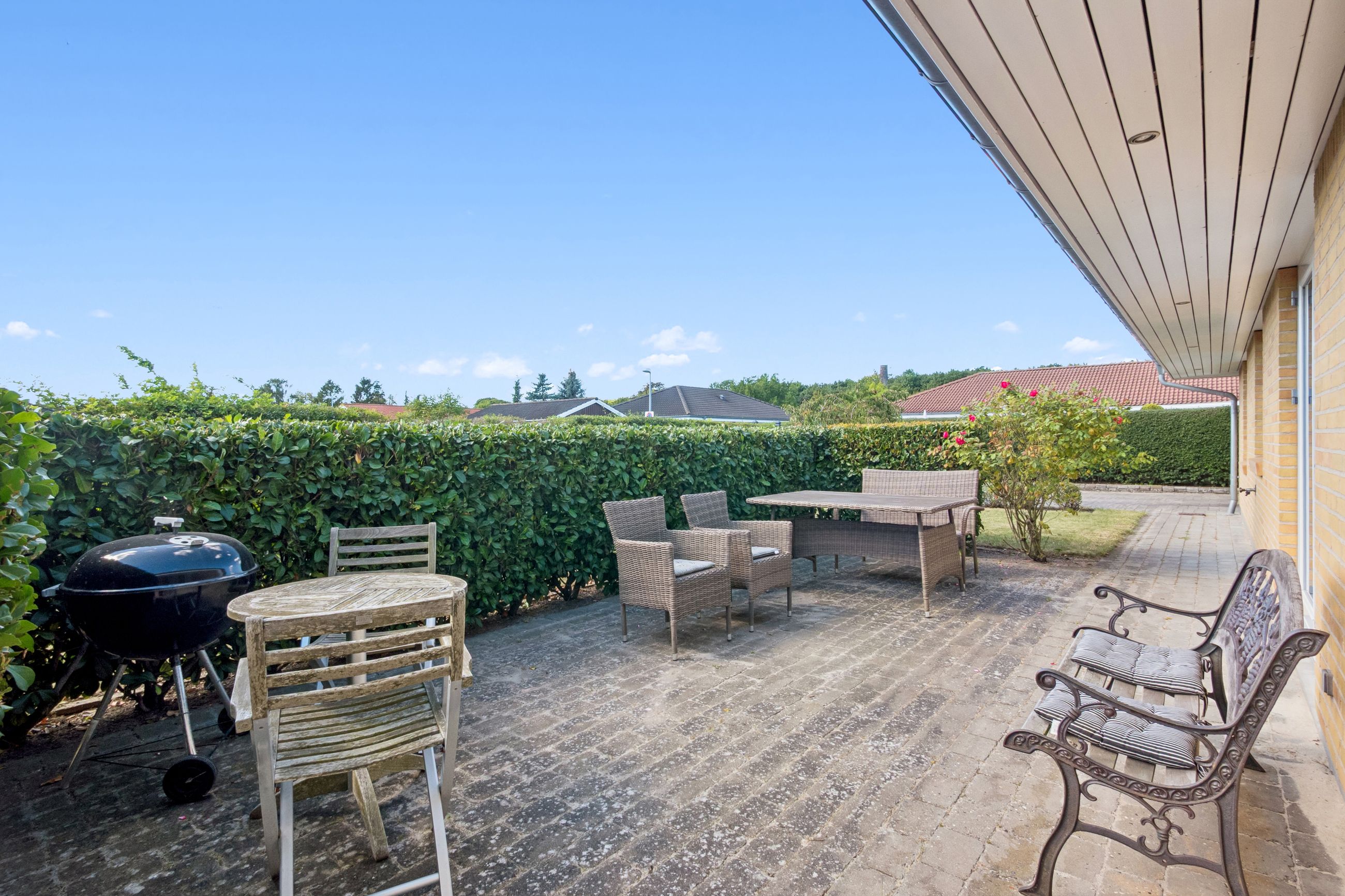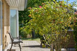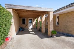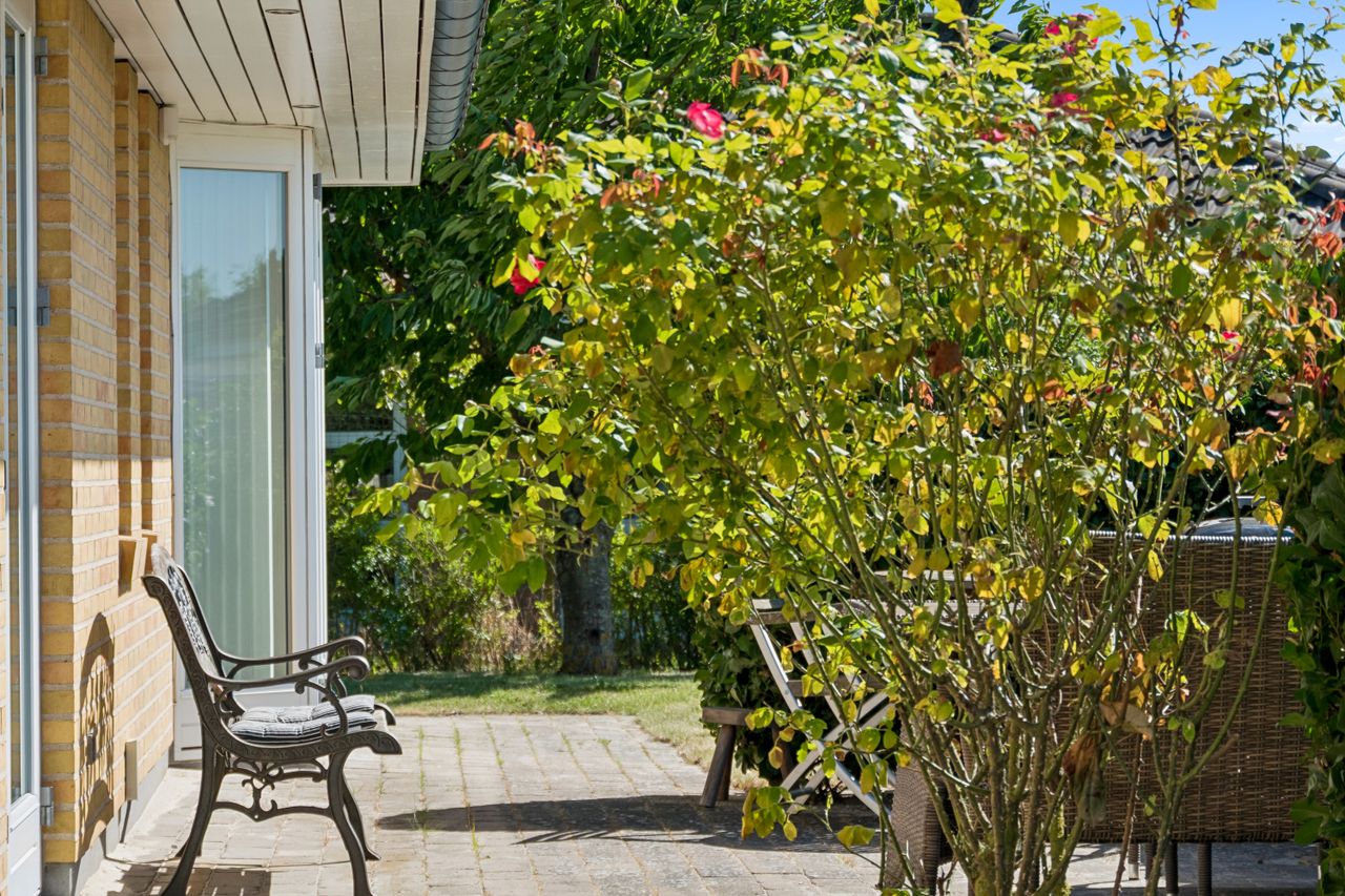 Både haven og terrassen er yderst ugeneret og her kan I nyde solen hele dagen. Foran huset findes desuden en stor flisebelagt indkørsel og med i købet I får også både muret carport og flot muret udhus til opbevaring, så de indvendige kvadratmeter udnyttes optimalt.