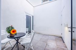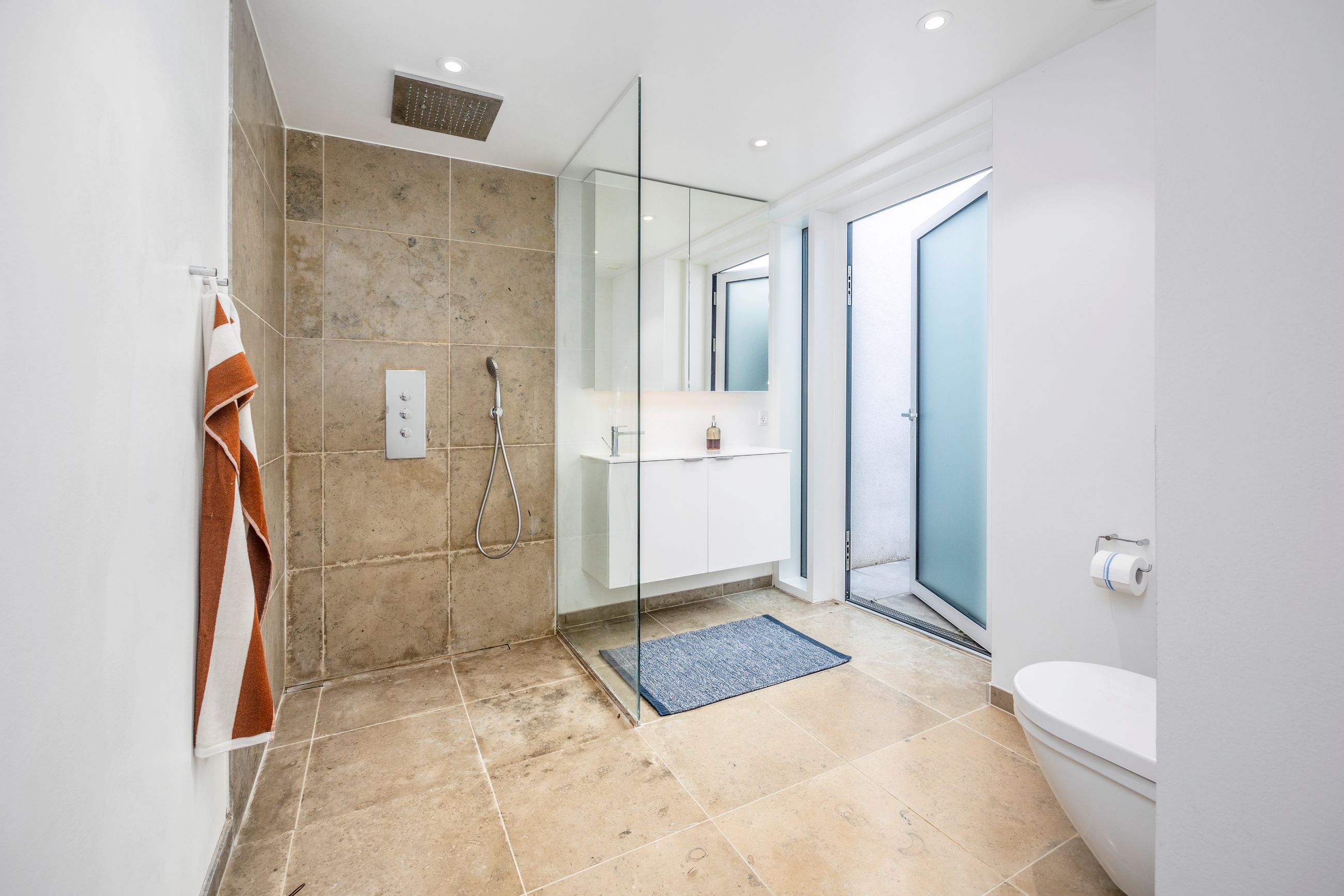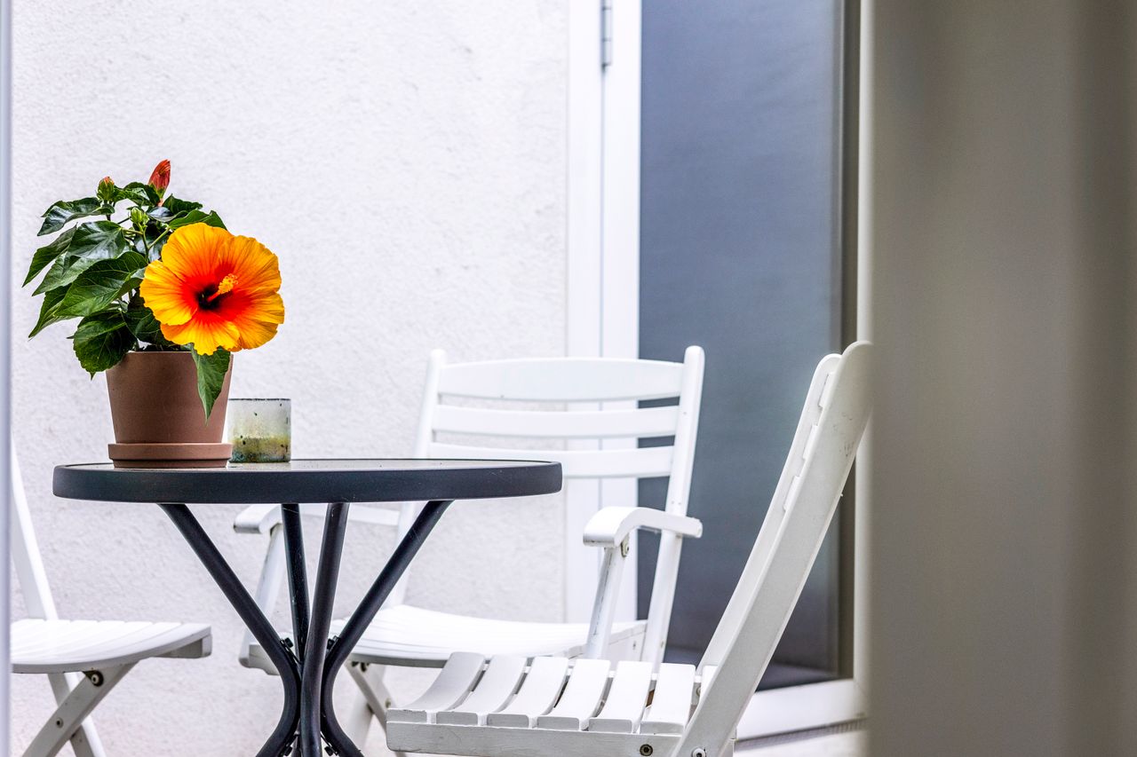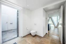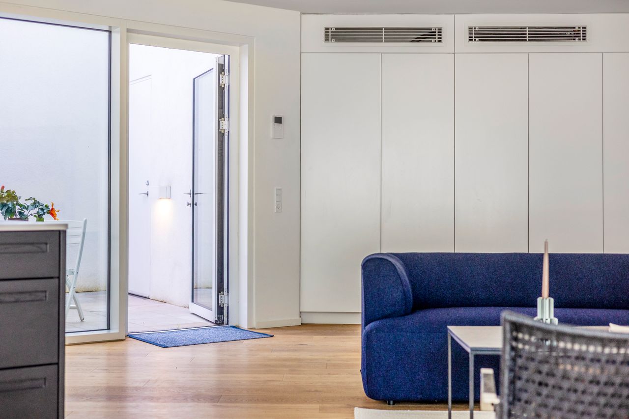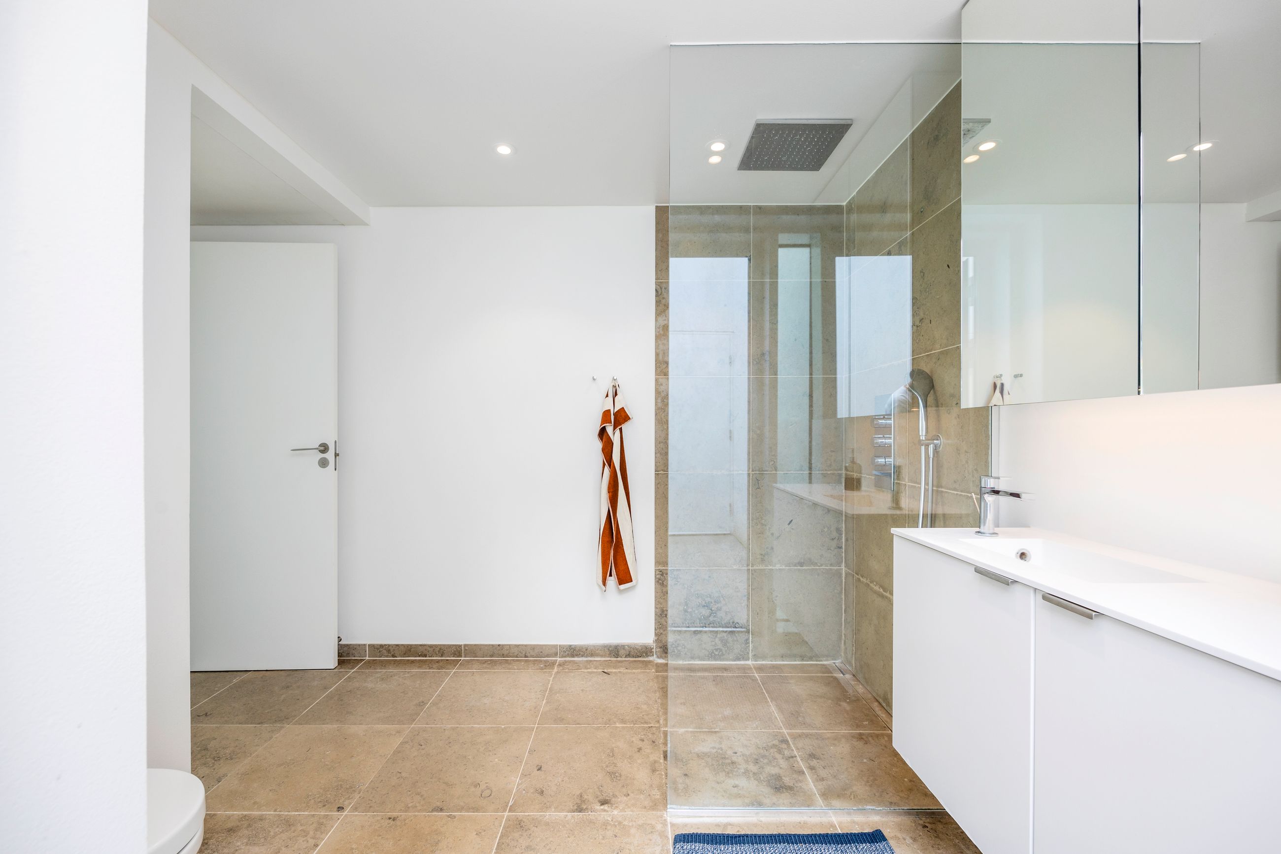 Badeværelset fremstår stilrent og indbydende med naturstensfliser, regnbruser og glasafskærmning, mens soveværelset byder på god opbevaringsplads og direkte adgang til boligens private terrasse. Den lukkede terrasse er lejlighedens skjulte perle – et roligt og uforstyrret uderum, perfekt til afslapning under åben himmel.