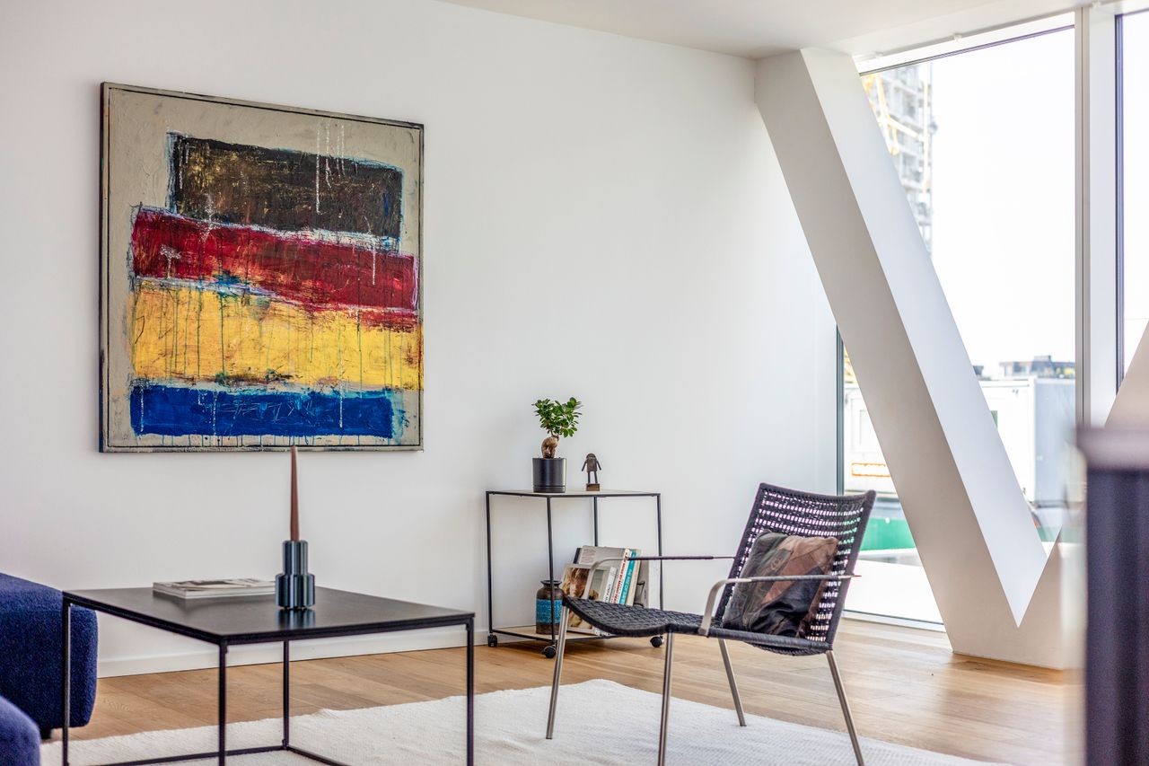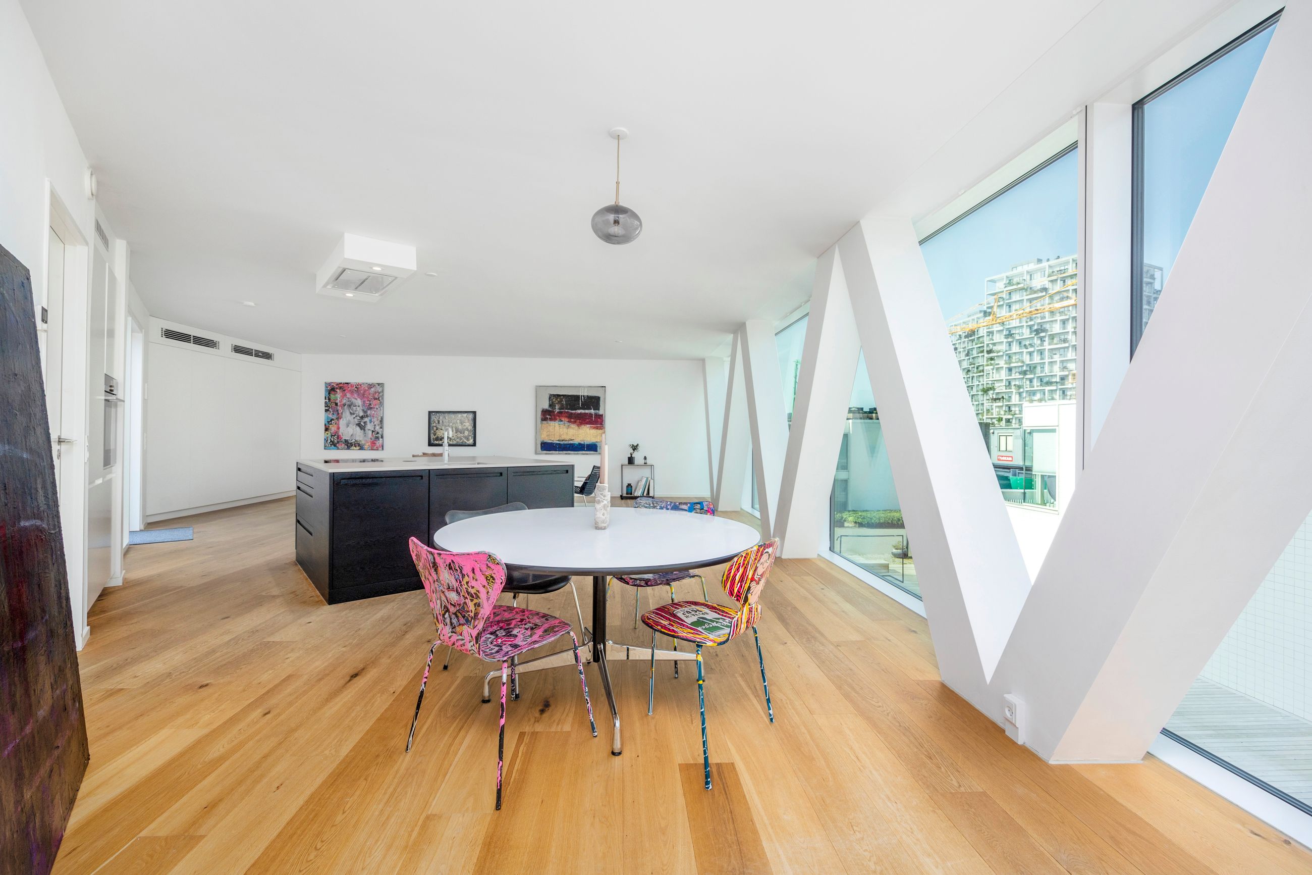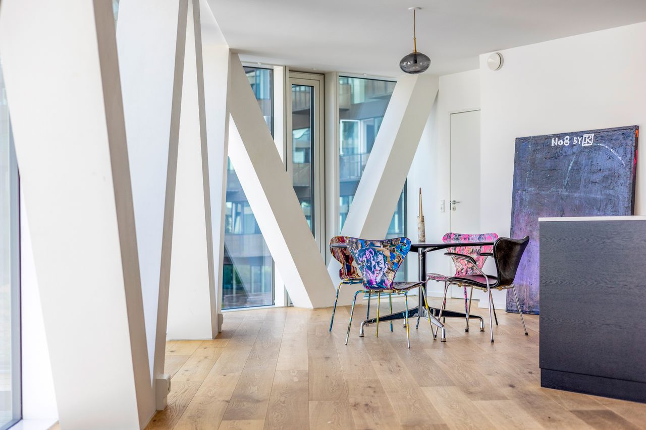 Indretningen er gennemtænkt og elegant med store, gulv-til-loft vinduer, der inviterer dagslyset helt ind og skaber en let og luftig atmosfære. De markante V-formede søjler i facaden tilfører rummet arkitektonisk karakter og fornemmelsen af at bo midt i et moderne mesterværk.