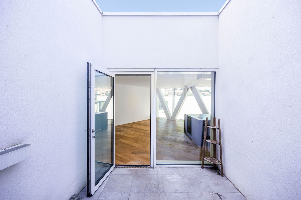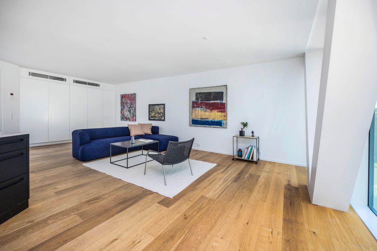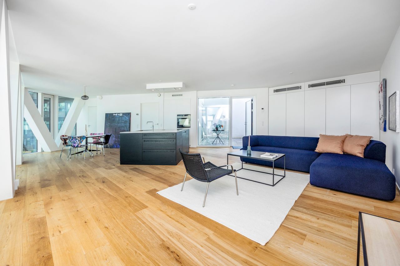 Indretningen er gennemtænkt og elegant med store, gulv-til-loft vinduer, der inviterer dagslyset helt ind og skaber en let og luftig atmosfære. De markante V-formede søjler i facaden tilfører rummet arkitektonisk karakter og fornemmelsen af at bo midt i et moderne mesterværk.
