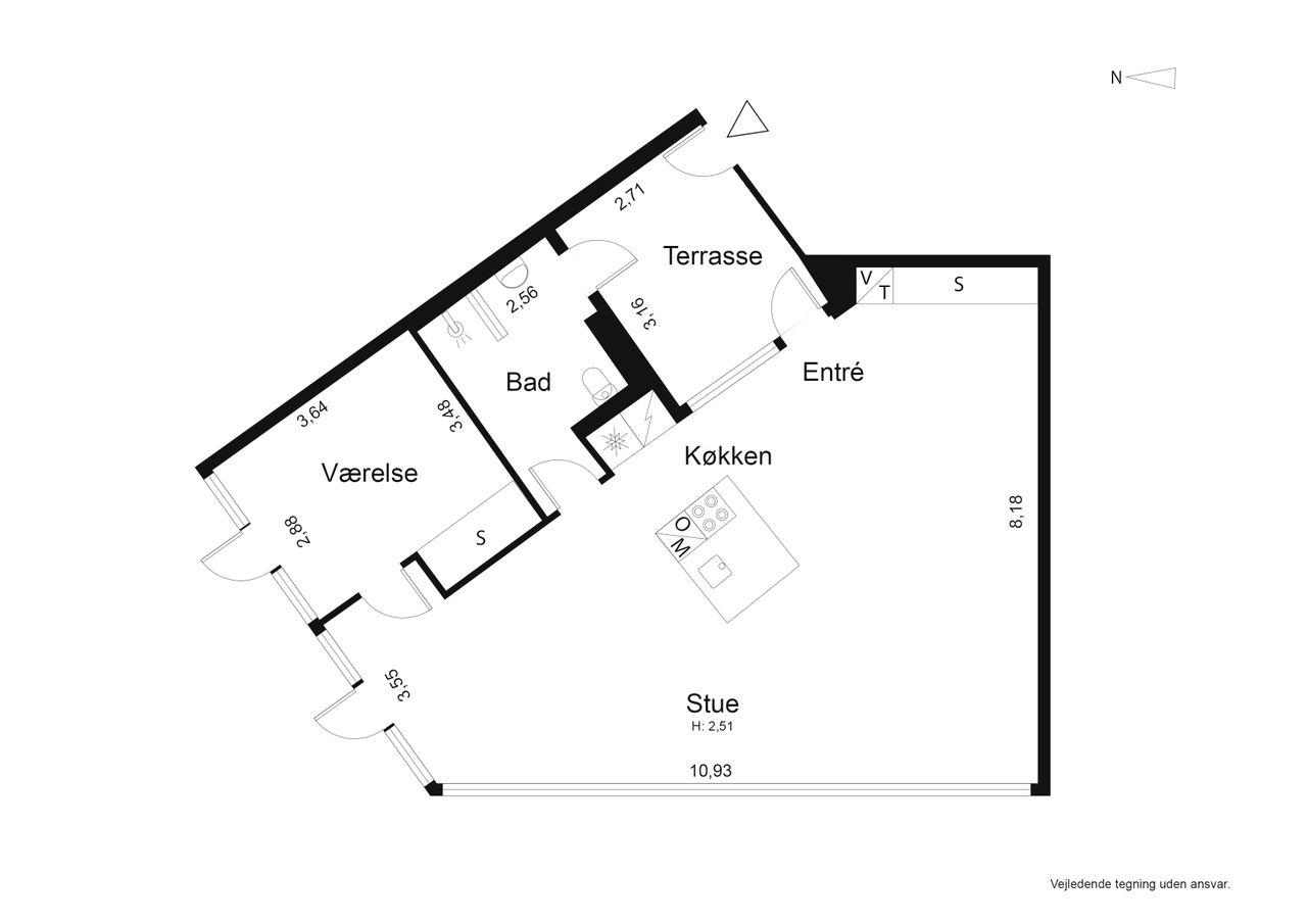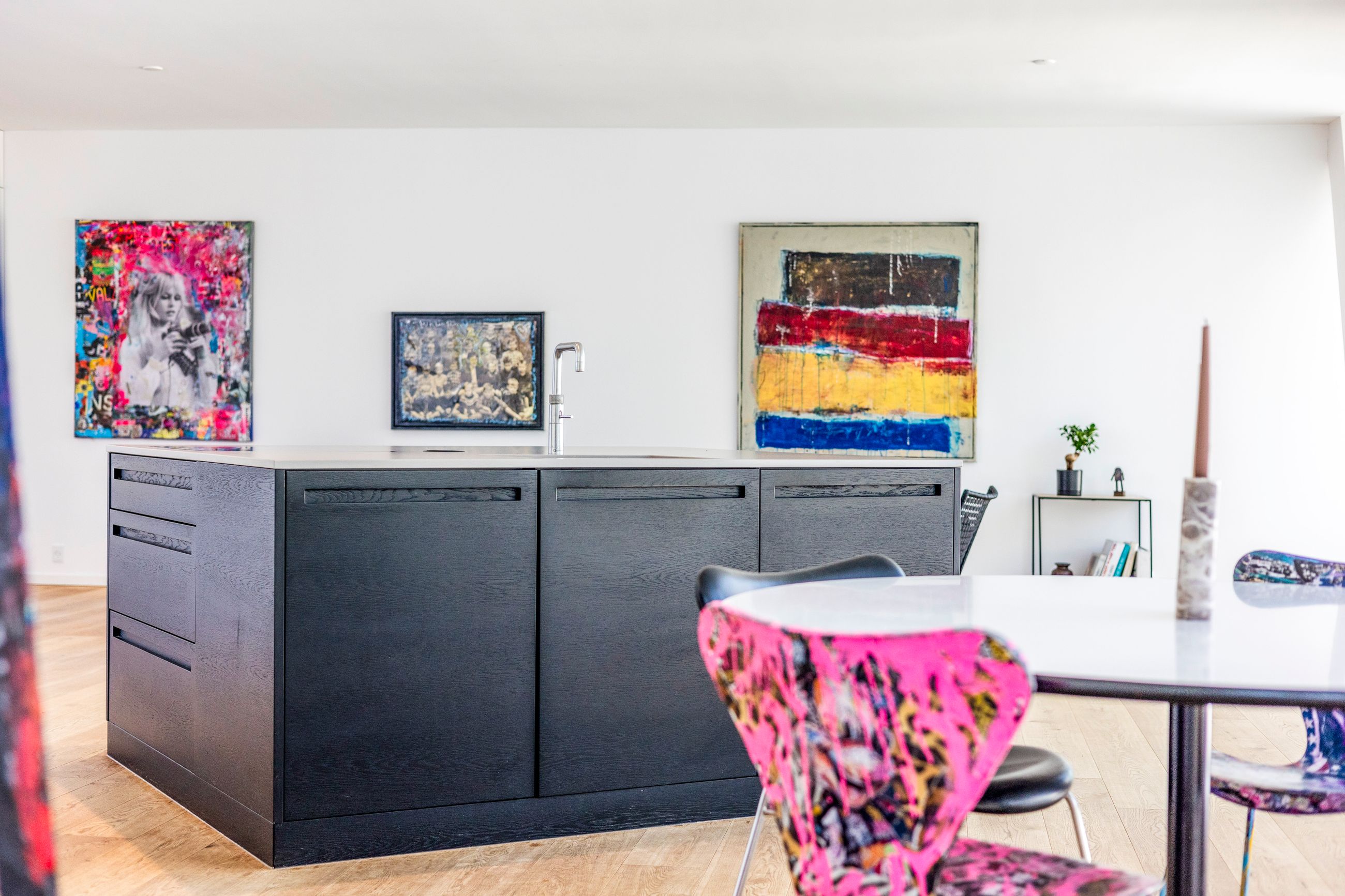 Det åbne opholdsrum er lejlighedens naturlige samlingspunkt med køkken og stue i ét. Køkkenet er udført med integrerede hvidevarer og en central ø med plads til både madlavning og samvær – ideelt til både hverdag og gæster.
