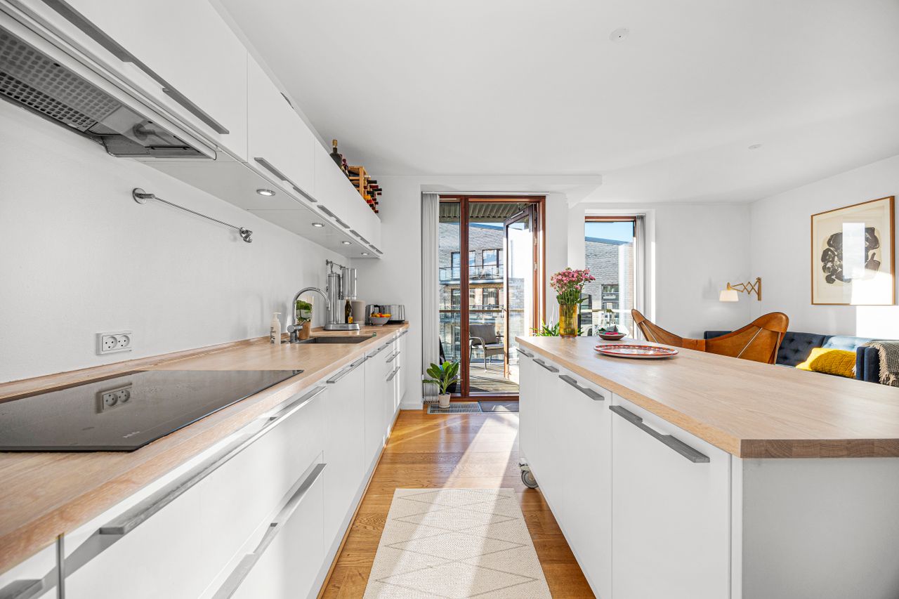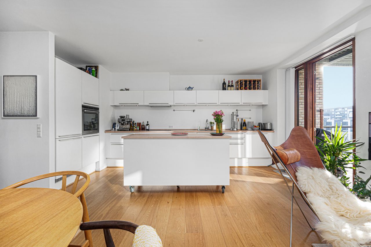 Boligens hjerte er det lyse, åbne køkken-alrum, der forener funktionalitet og atmosfære. Her er der god plads til både madlavning, afslapning og hyggelige middage med venner og familie. Fra stuen er der direkte udgang til en skøn vestvendt altan, hvor du kan nyde udsigten til det pulserende havnemiljø.