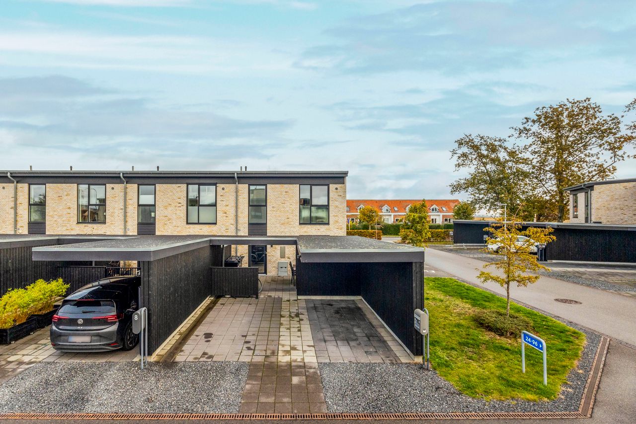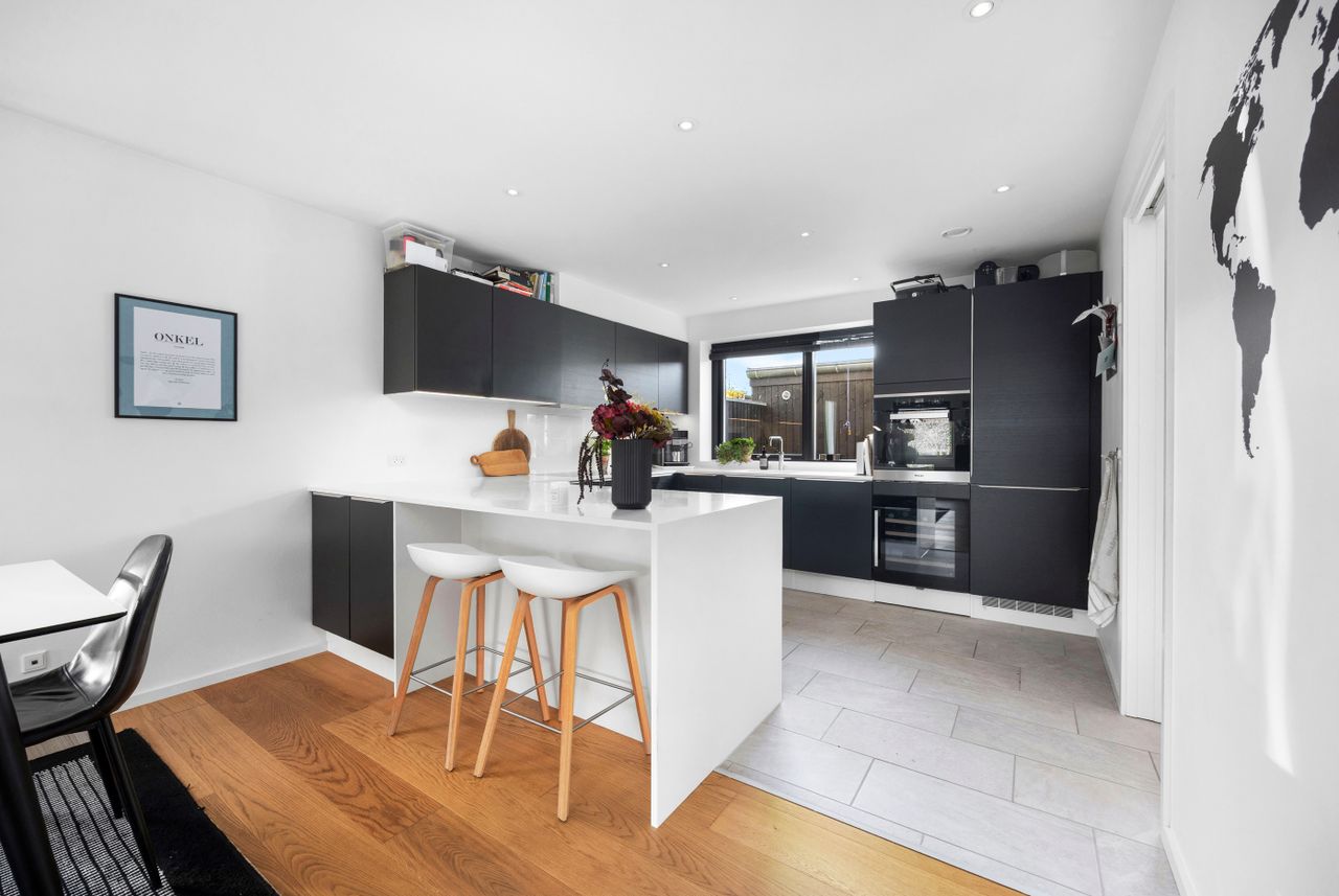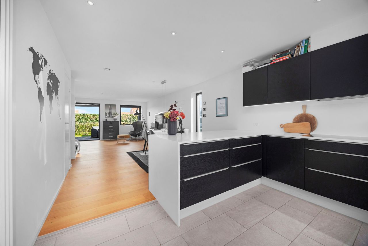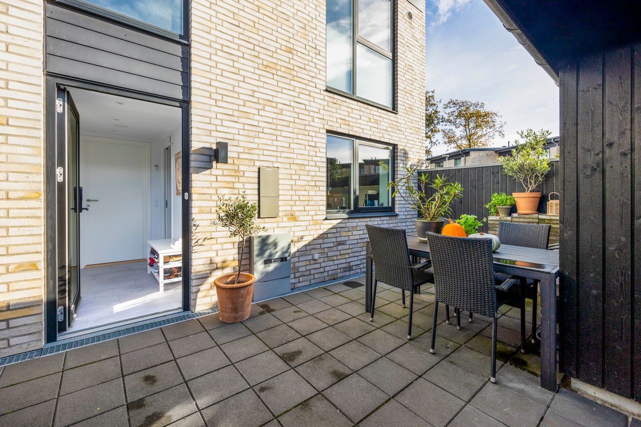 Rækkehuset er opført i rene linjer og tidløse materialer i et byggeri fra 2019. Indgangen samler husets praktiske zone med gæstebad, depot og adgang til den hyggelige forhave. Køkken/alrum er hjemmets hjerte: sorte fronter, hvid bordplade og plads til barstole. De store glaspartier trækker lyset ind og åbner mod den solrige, afskærmede terrasse og den grønne have giver et naturligt flow mellem inde og ude.