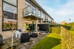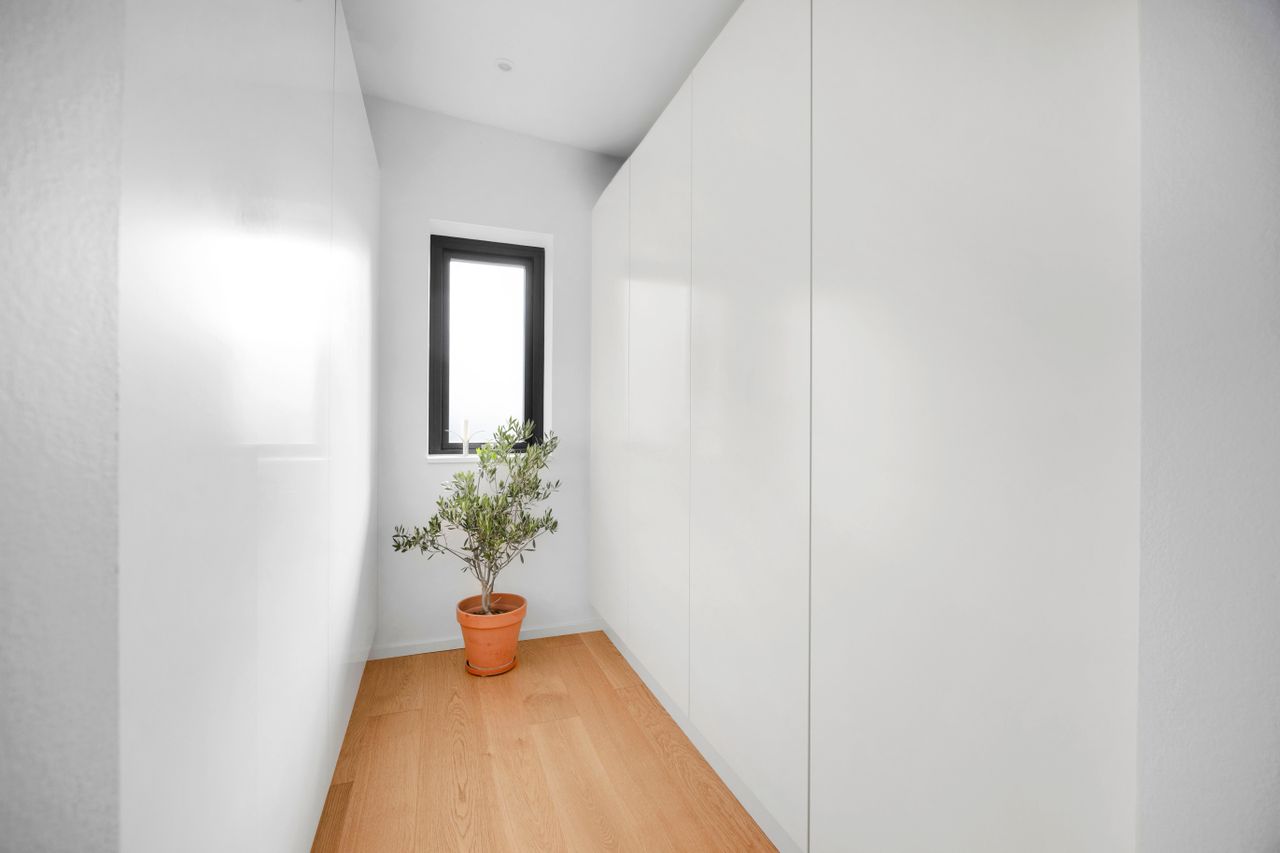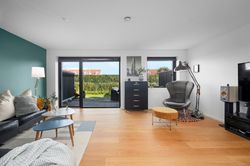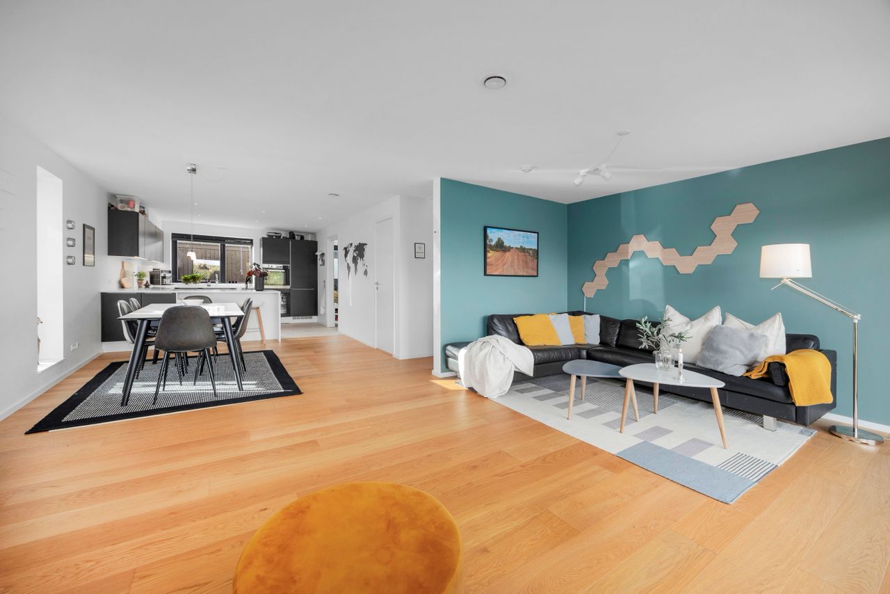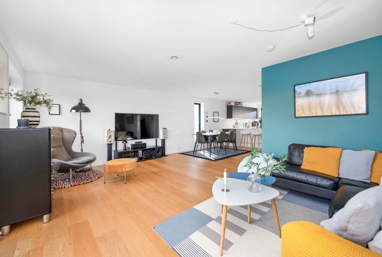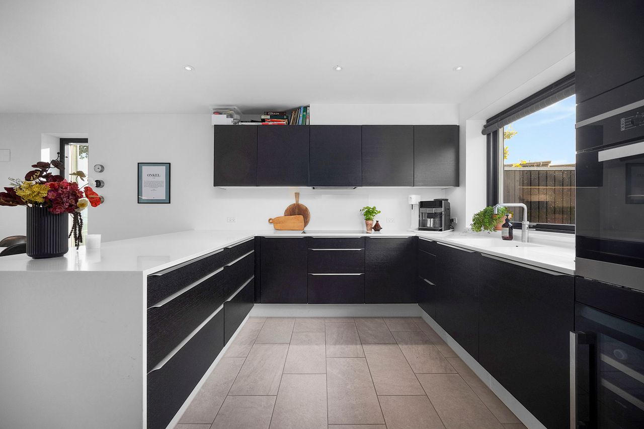 Rækkehuset er opført i rene linjer og tidløse materialer i et byggeri fra 2019. Indgangen samler husets praktiske zone med gæstebad, depot og adgang til den hyggelige forhave. Køkken/alrum er hjemmets hjerte: sorte fronter, hvid bordplade og plads til barstole. De store glaspartier trækker lyset ind og åbner mod den solrige, afskærmede terrasse og den grønne have giver et naturligt flow mellem inde og ude.