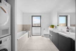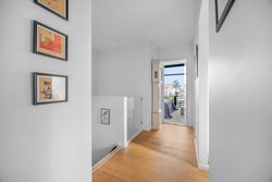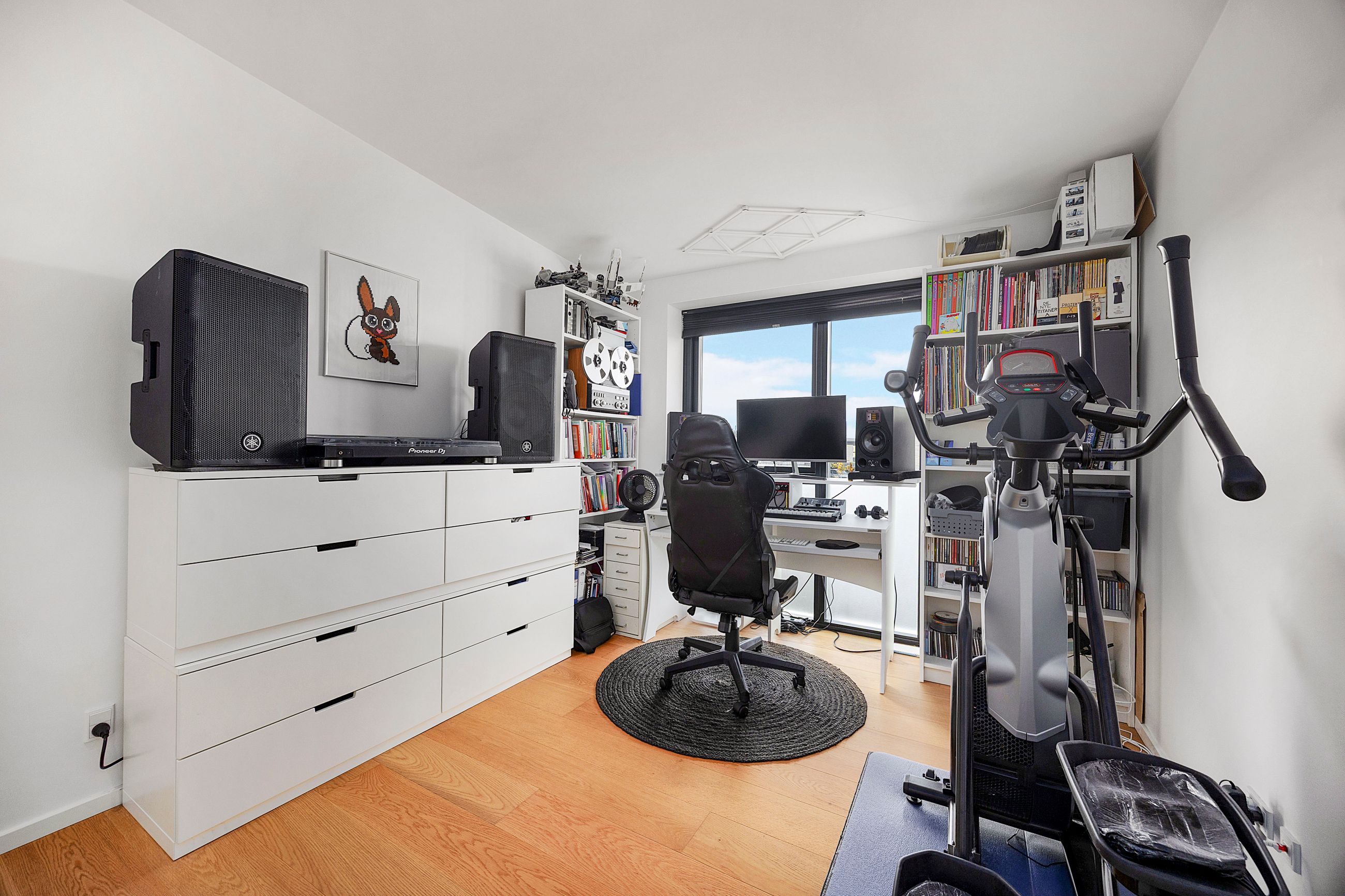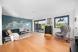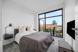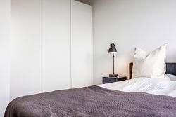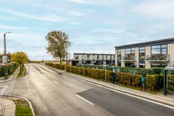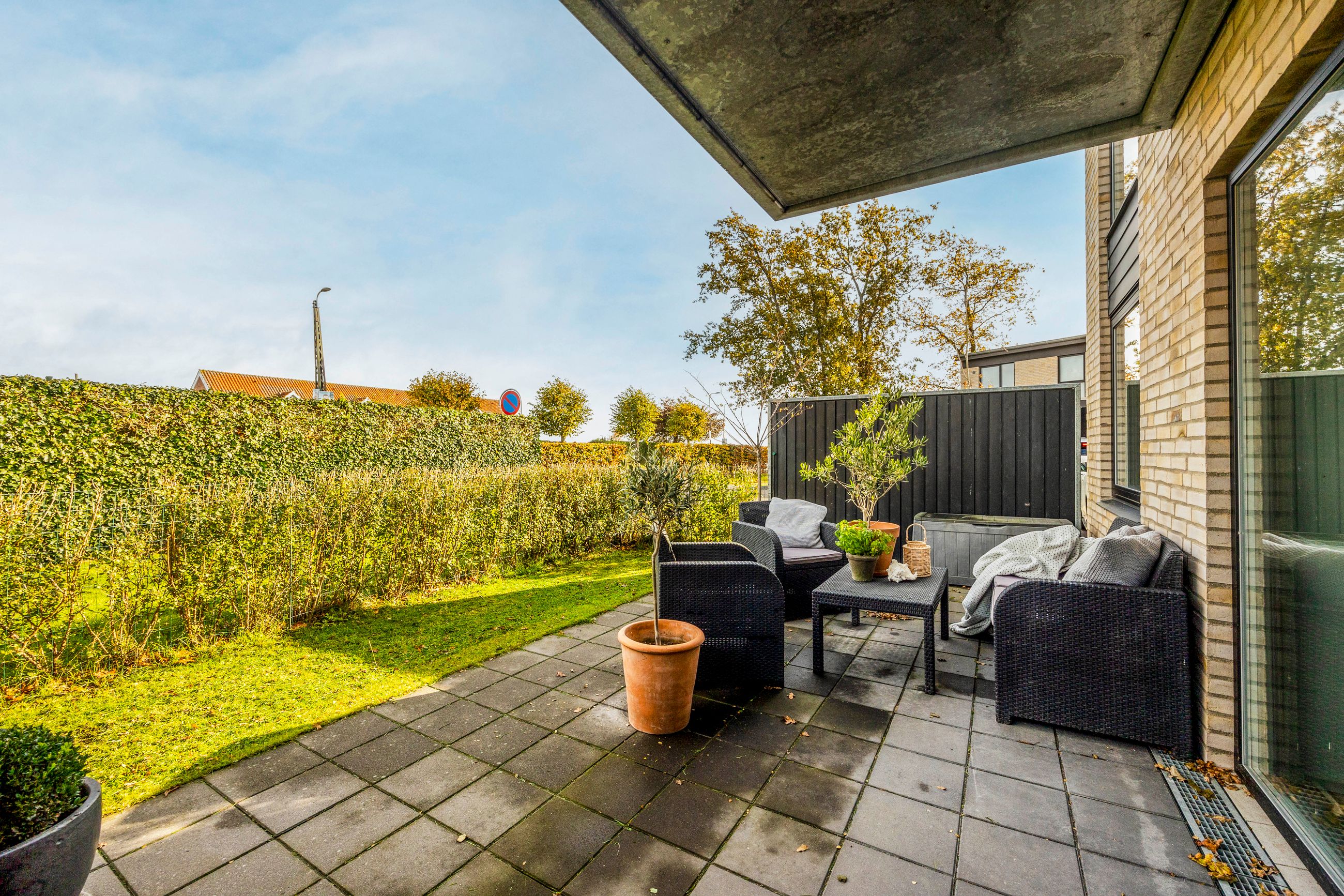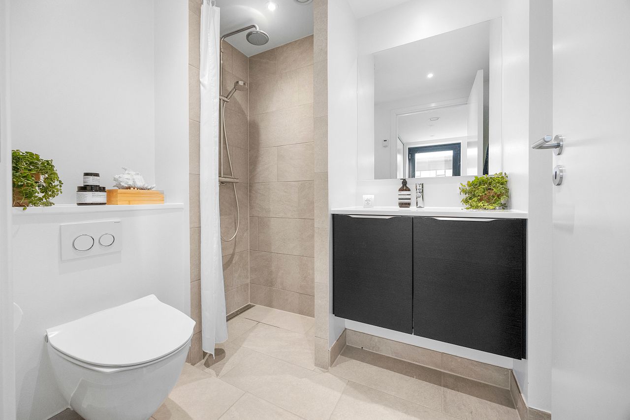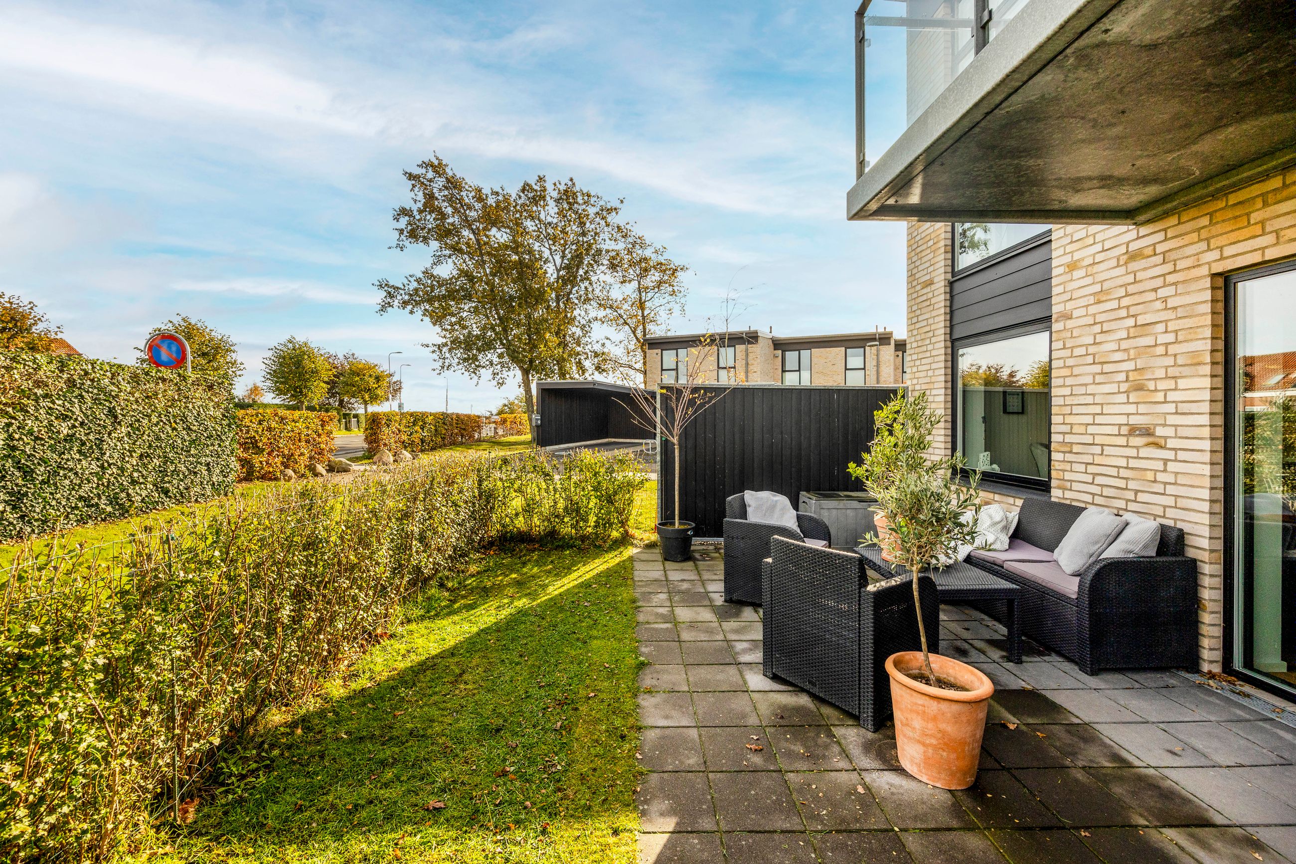Rækkehuset er opført i rene linjer og tidløse materialer i et byggeri fra 2019. Indgangen samler husets praktiske zone med gæstebad, depot og adgang til den hyggelige forhave. Køkken/alrum er hjemmets hjerte: sorte fronter, hvid bordplade og plads til barstole. De store glaspartier trækker lyset ind og åbner mod den solrige, afskærmede terrasse og den grønne have giver et naturligt flow mellem inde og ude.