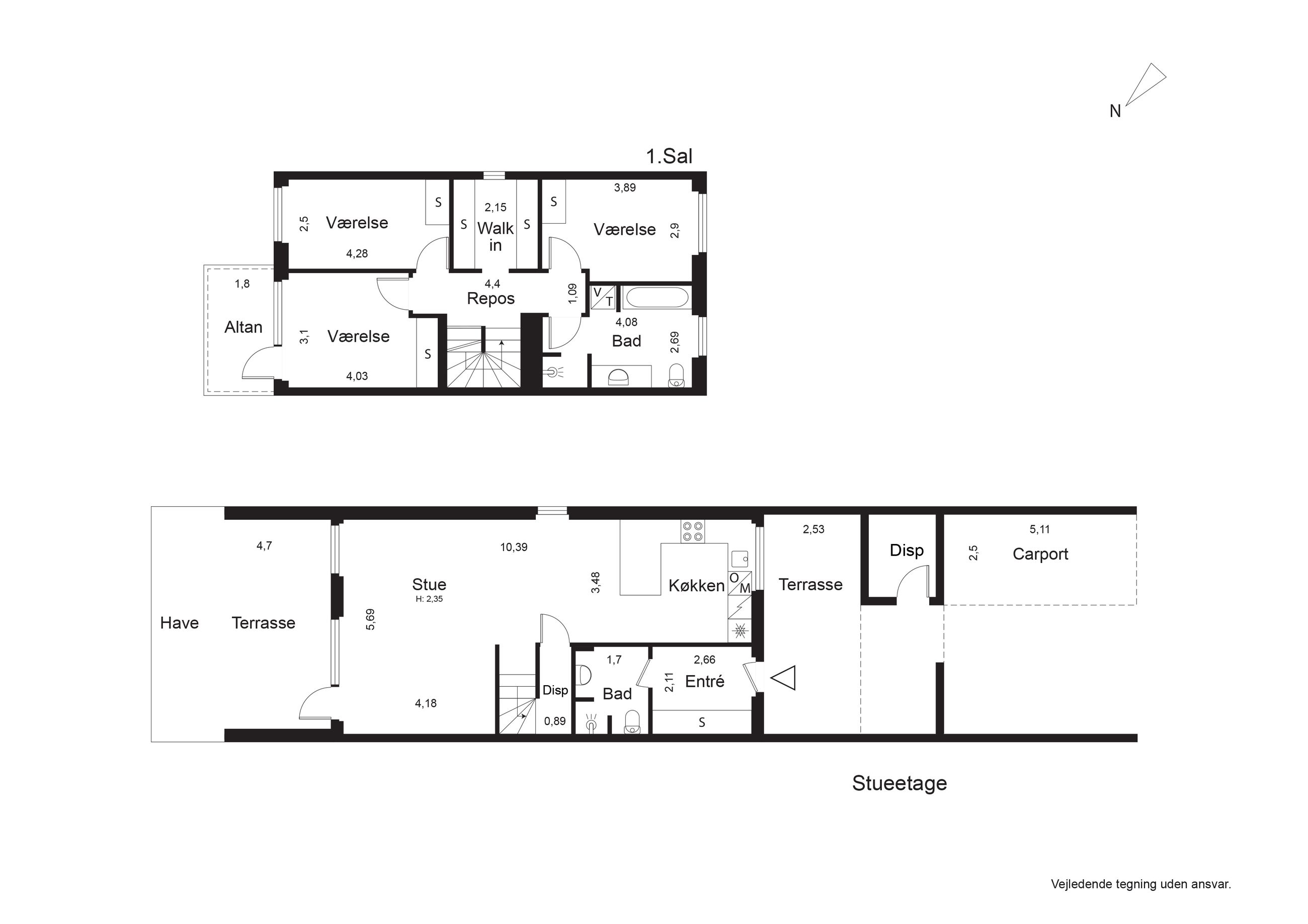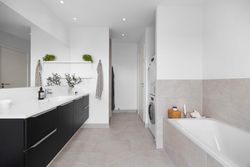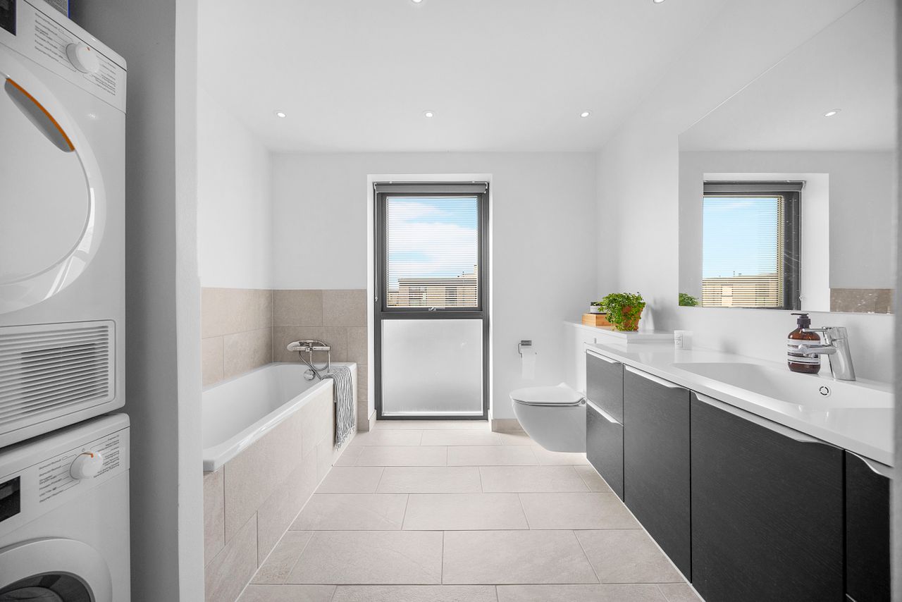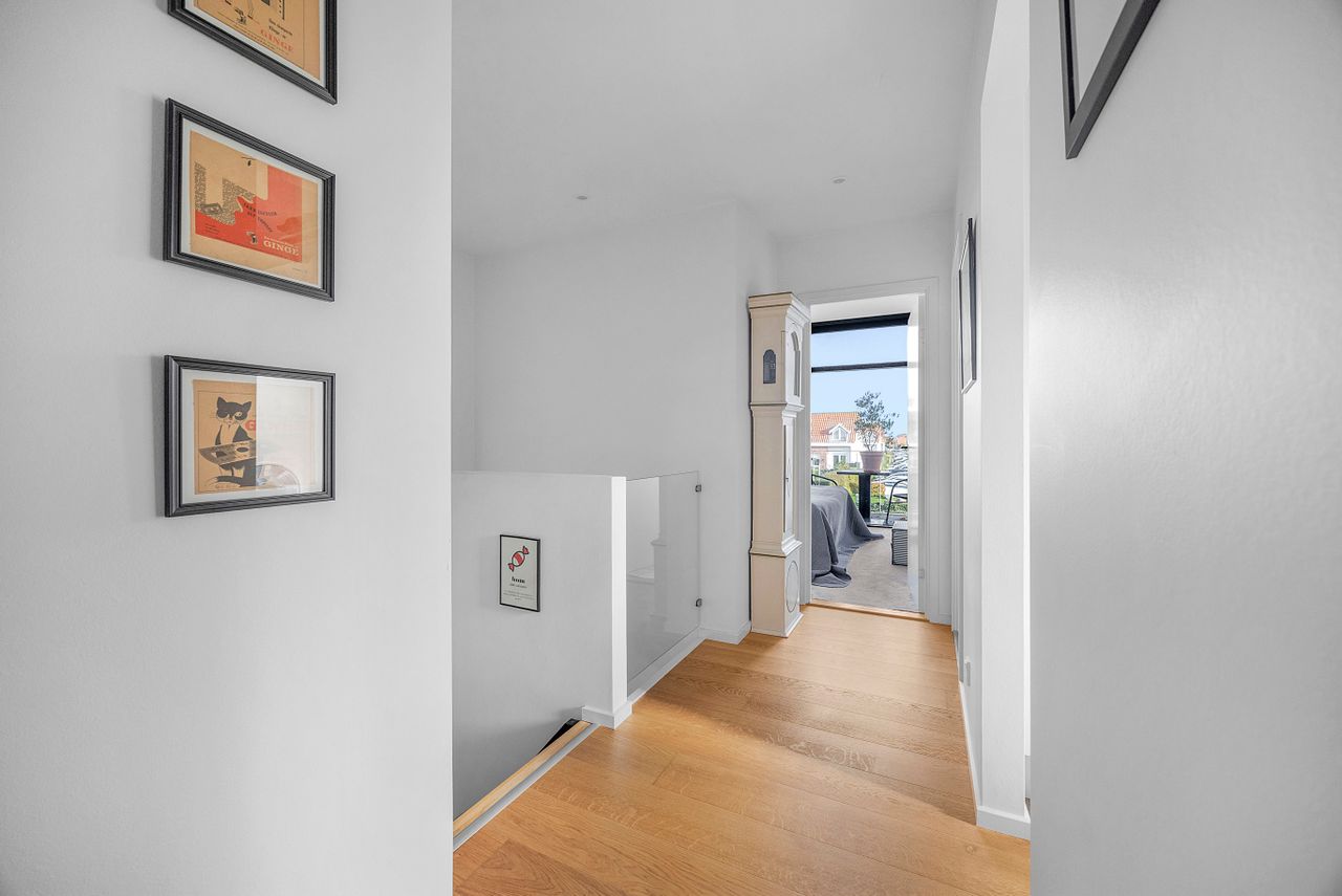 Stuen er generøs og indretningsvenlig med direkte udgang til terrassen. Ovenpå binder et lyst repos etagen sammen. Her ligger tre gode værelser, hvoraf det ene har egen altan til de stille morgenstunder. Walk in garderoben samler garderoben elegant. Badeværelset på 1. sal er indrettet med kar, brede klinker og vaskesøjle; i stueplan får du et ekstra brusebad, som giver ekstra komfort i hverdagen.