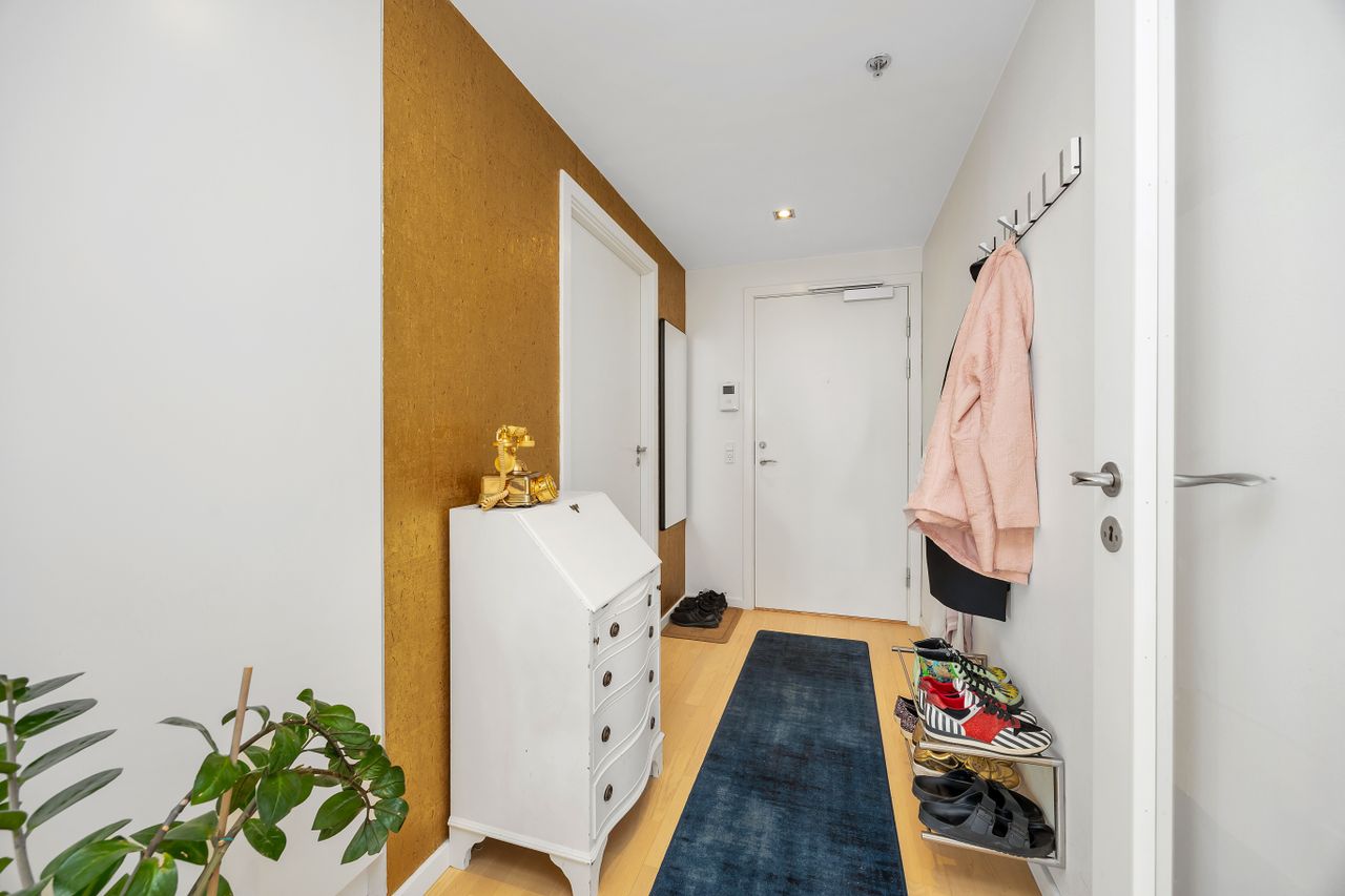 Badeværelset er moderne indrettet med en separat bruseniche og vaskesøjle. Altanen tilbyder god plads til både loungemøbler, grill og spisebord – perfekt til afslapning og lange sommeraftener. Lejligheden kombinerer funktionalitet og æstetik på en måde, der skaber et hjem, der både er praktisk og indbydende. Med sin fantastiske beliggenhed, rummelige opholdsområder og private altan er dette et ideelt sted at nyde livet – både inde og ude. Alt, hvad du behøver, er lige ved hånden, og med egen parkeringsplads i kælderen, er bekvemmelighed og komfort sikret. Denne lejlighed skal opleves!