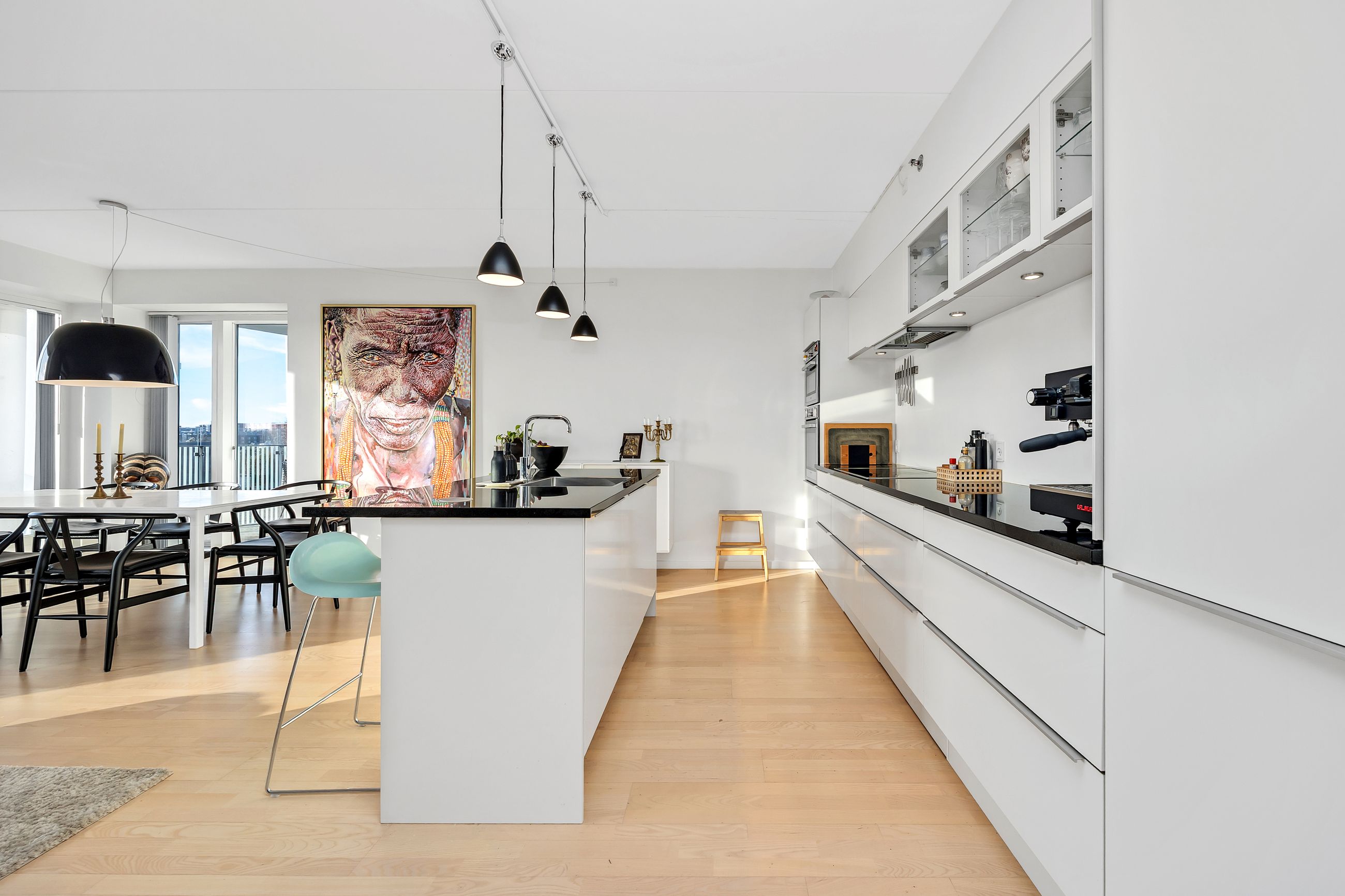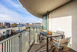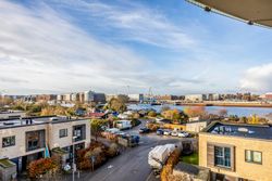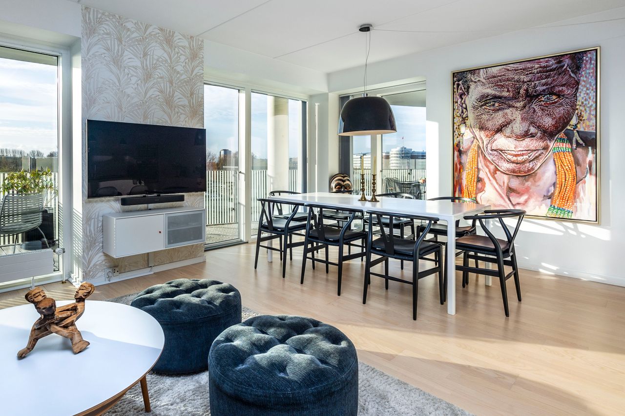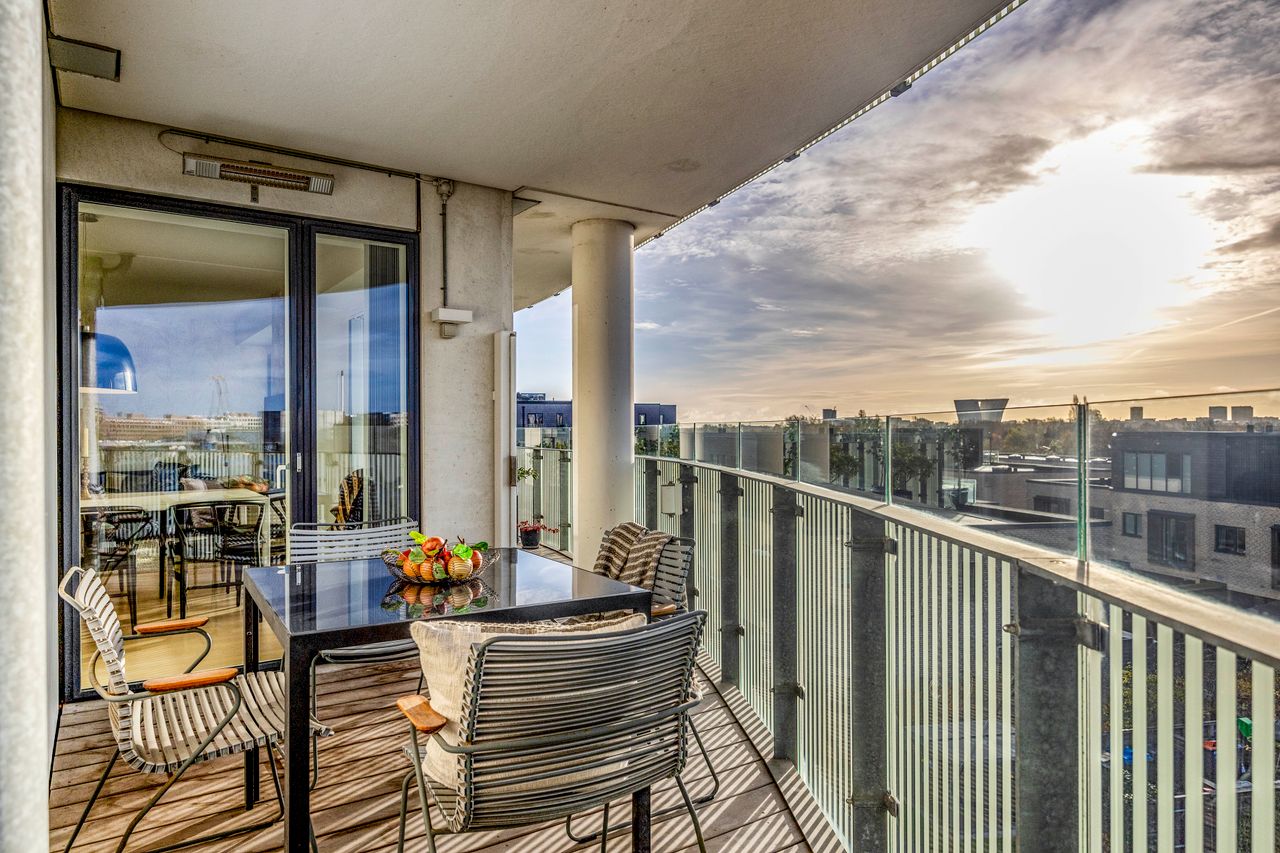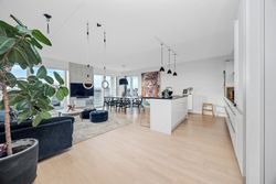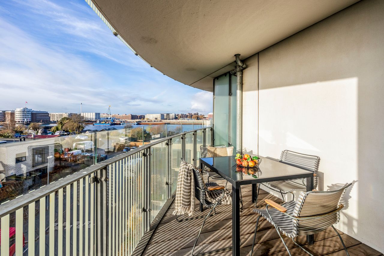 Lejligheden ligger på 3. sal og byder på en imponerende udsigt over vand, by og natur. Den åbne planløsning er optimalt udnyttet med et stort køkken-alrum, der glider over i opholdsstuen, hvorfra du træder ud på en sydvestvendt altan, der strækker sig langs hele lejligheden. Køkkenet er enkelt og stilrent med grebsfrie, hvide fronter og en funktionel køkkenø. De store vinduer og de gennemgående gulve skaber en lys og harmonisk stemning i hele boligen. De tre soveværelser er rummelige, og to af dem har direkte udgang til altanen.