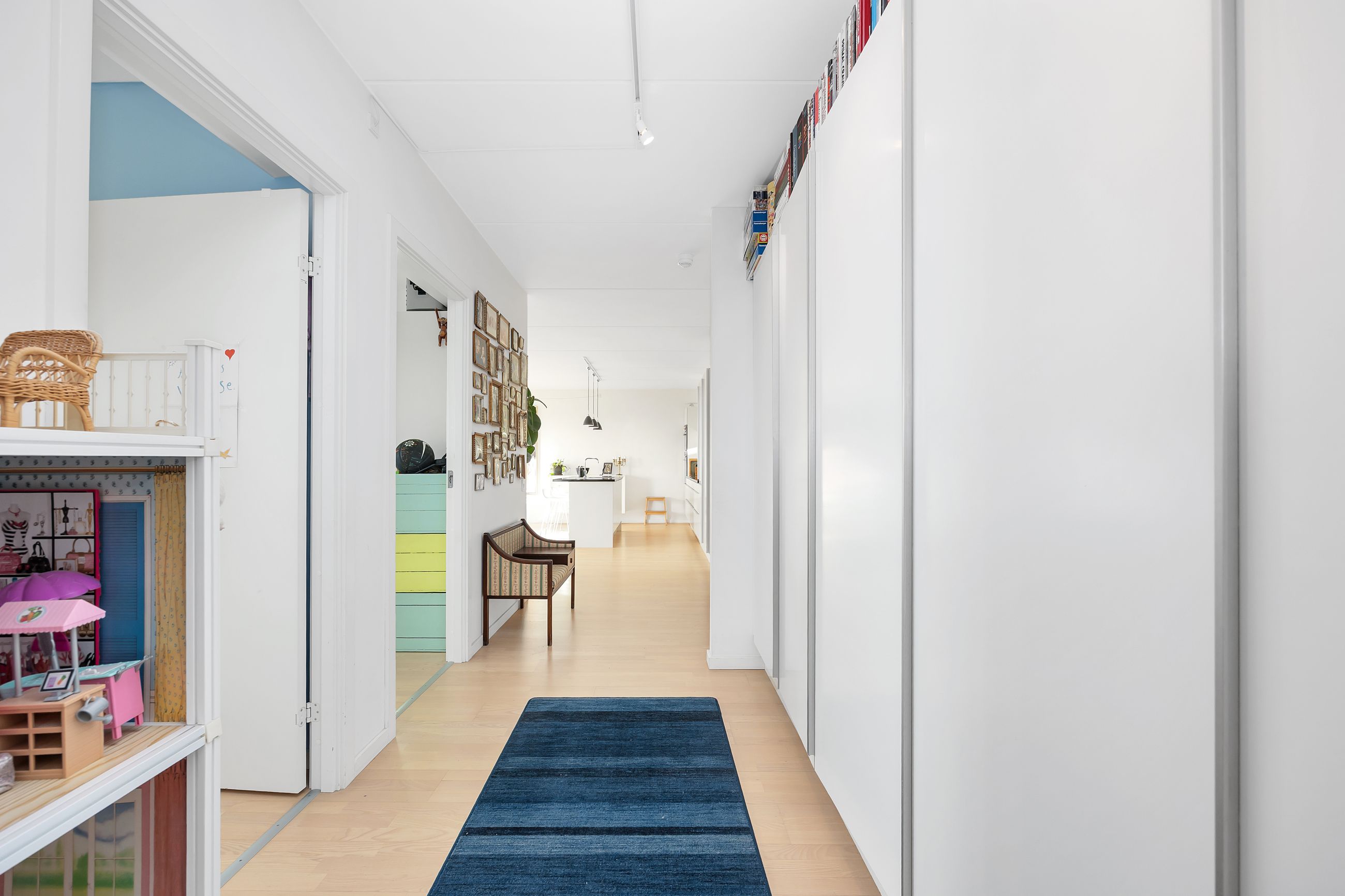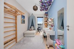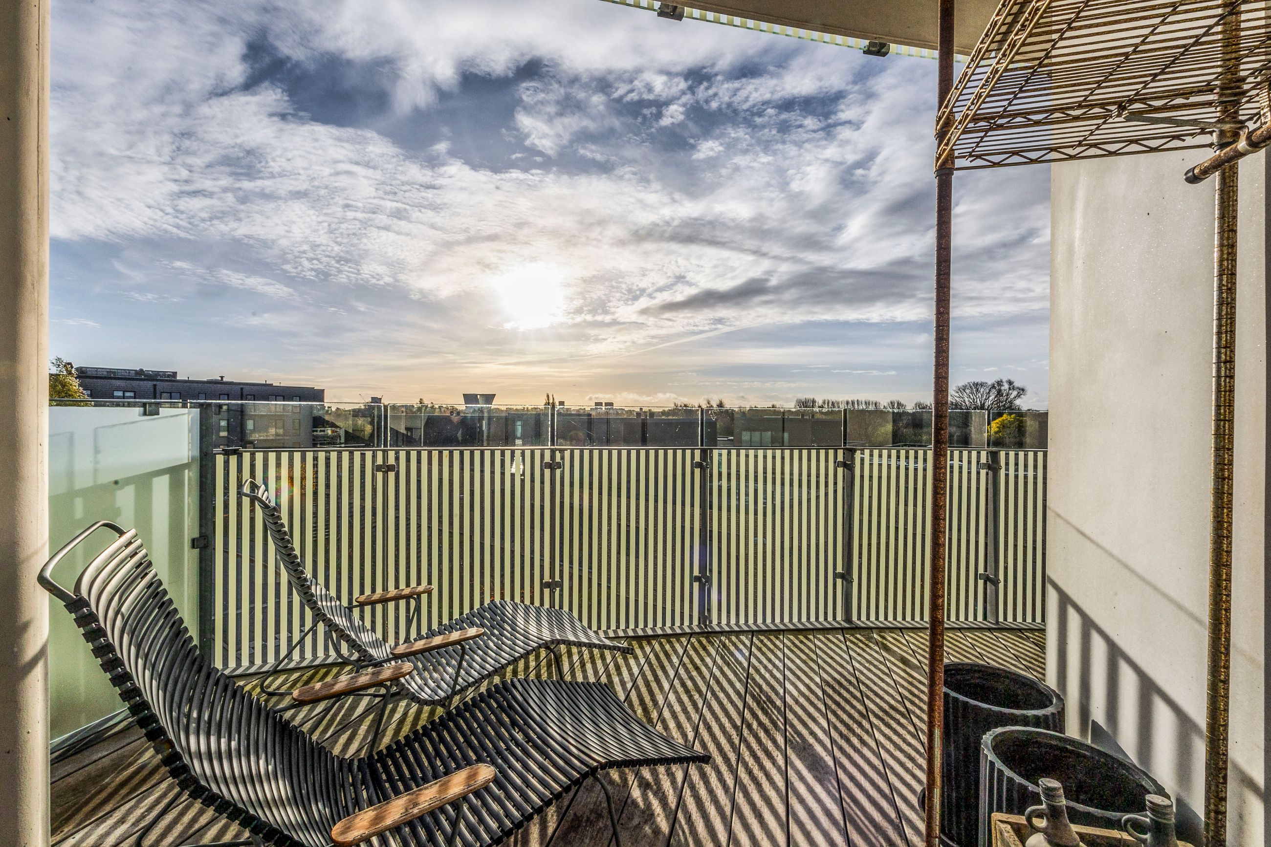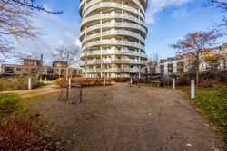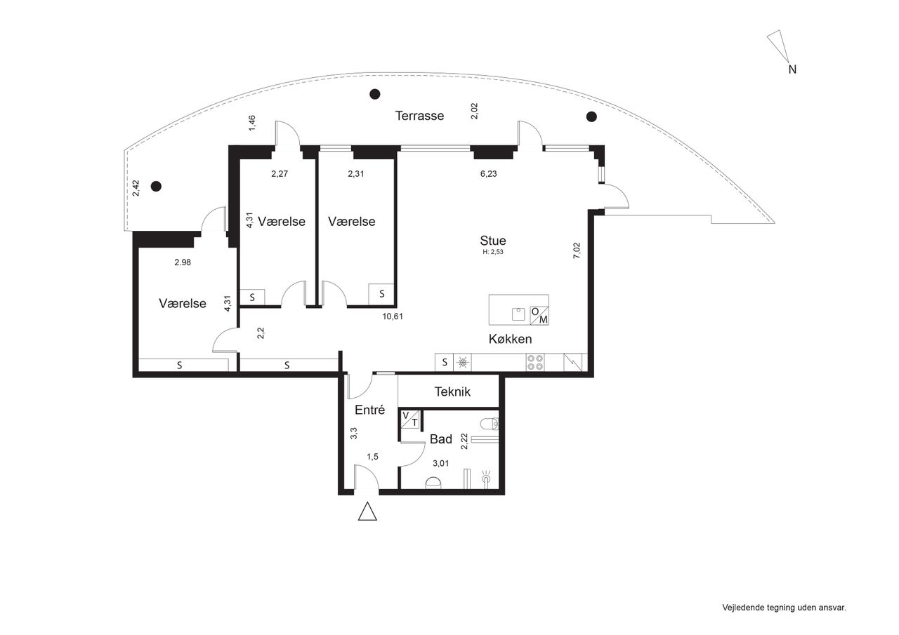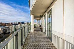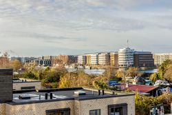 Lejligheden ligger på 3. sal og byder på en imponerende udsigt over vand, by og natur. Den åbne planløsning er optimalt udnyttet med et stort køkken-alrum, der glider over i opholdsstuen, hvorfra du træder ud på en sydvestvendt altan, der strækker sig langs hele lejligheden. Køkkenet er enkelt og stilrent med grebsfrie, hvide fronter og en funktionel køkkenø. De store vinduer og de gennemgående gulve skaber en lys og harmonisk stemning i hele boligen. De tre soveværelser er rummelige, og to af dem har direkte udgang til altanen.