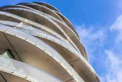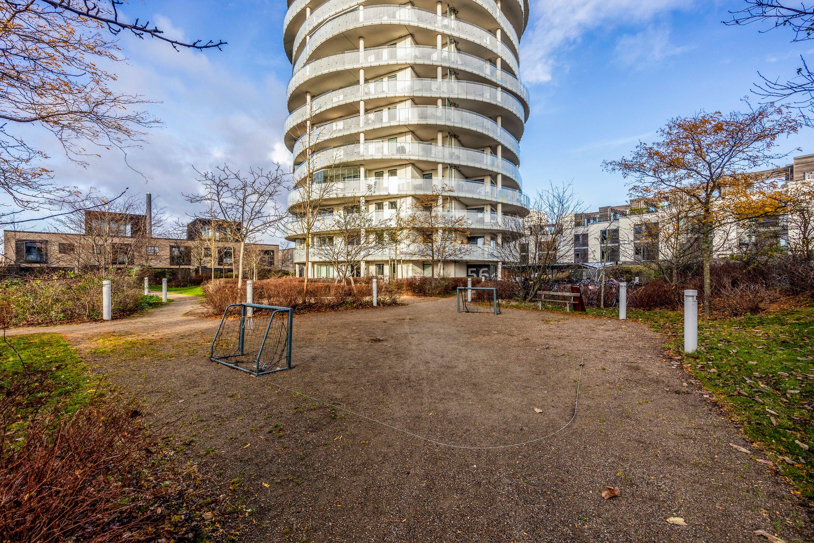 Ejendommen, opført i 2014, fremstår moderne og velholdt med et tidløst, arkitektonisk design. Bygningen er udstyret med elevator, der sikrer nem adgang til både bolig og kælder. I kælderen findes en parkeringsplads, der tilhører lejligheden – en stor fordel i området. De velplejede fællesarealer med grønne områder bidrager til en behagelig og indbydende atmosfære omkring ejendommen.
