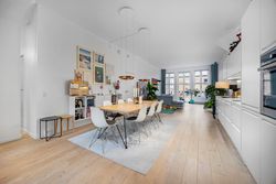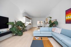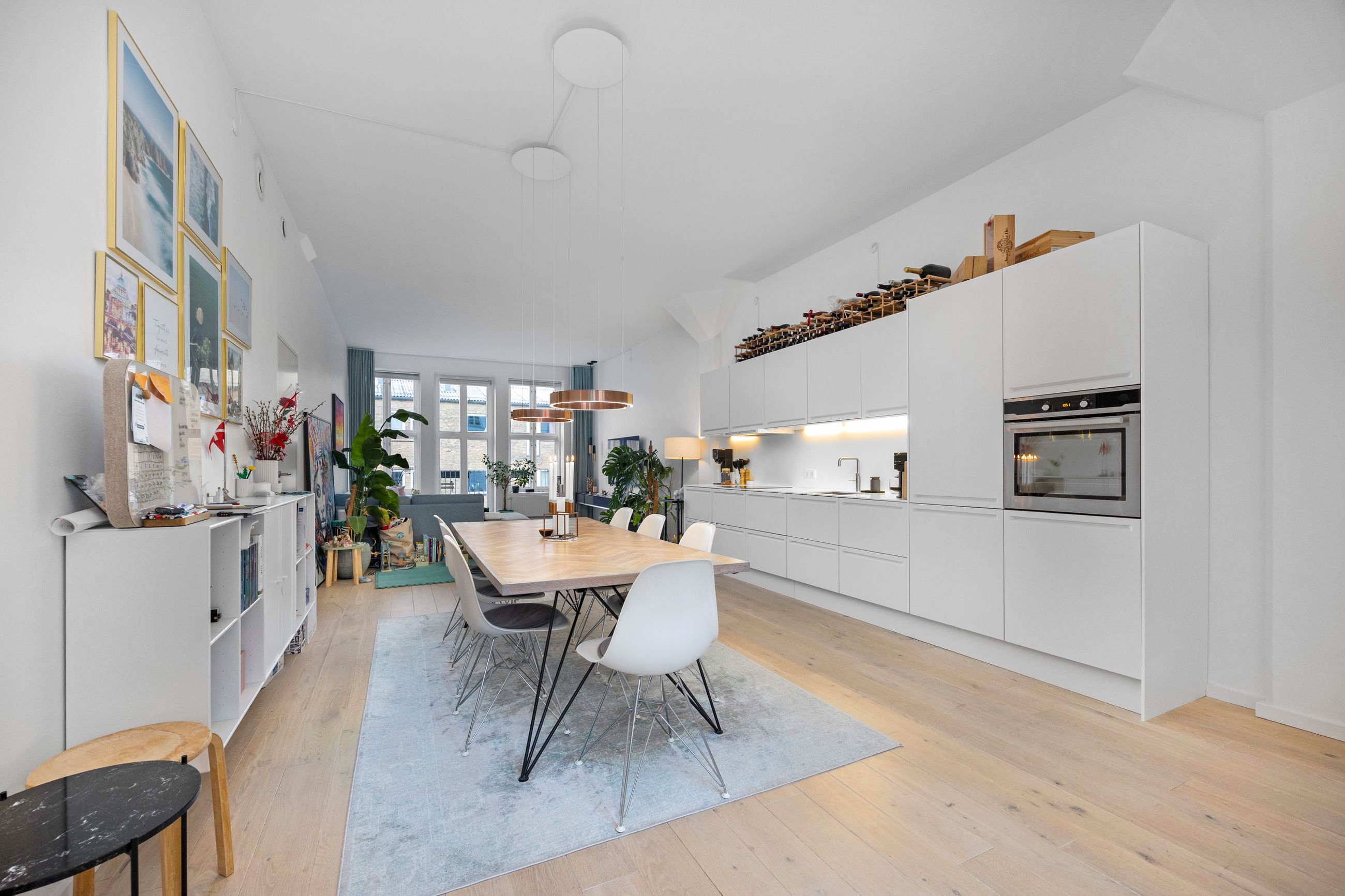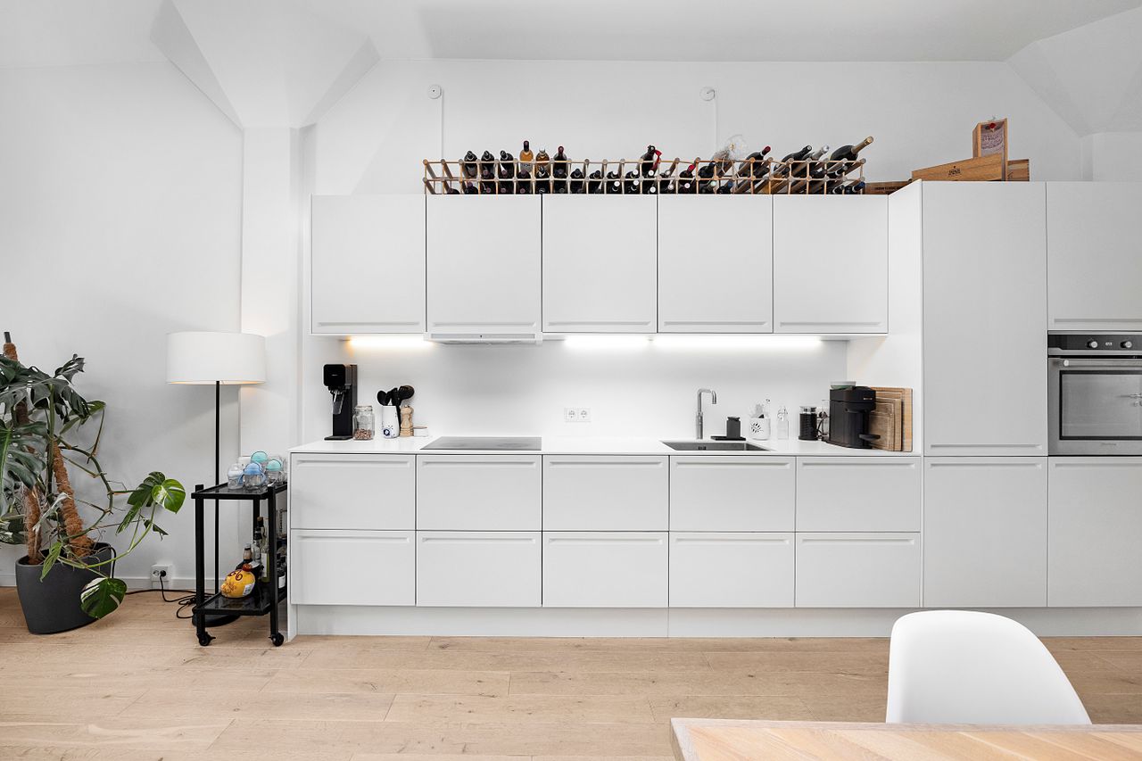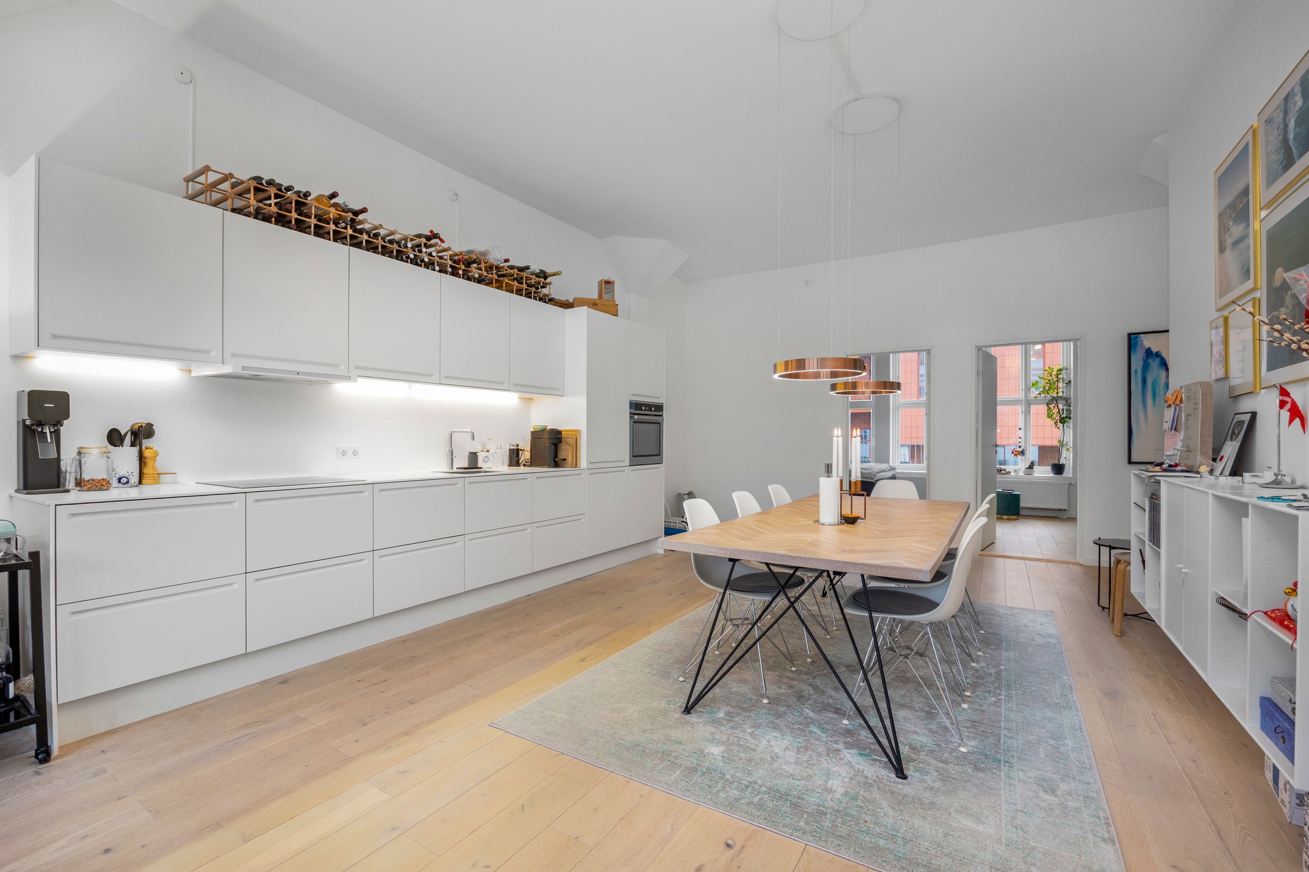 Boligens naturlige samlingspunkt er det store opholdsrum med køkken og stue i åben forbindelse. Det stilrene snedkerkøkken står knivskarpt med masser af skabs- og bordplads, og rummet bindes smukt sammen af de lyse gulve, de store vinduespartier og den ekstra loftshøjde, der giver en skøn rumfornemmelse. Her er der god plads til både et stort spisebord og en hyggelig sofaafdeling, så hjemmet fungerer lige godt til hverdage og gæster.