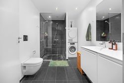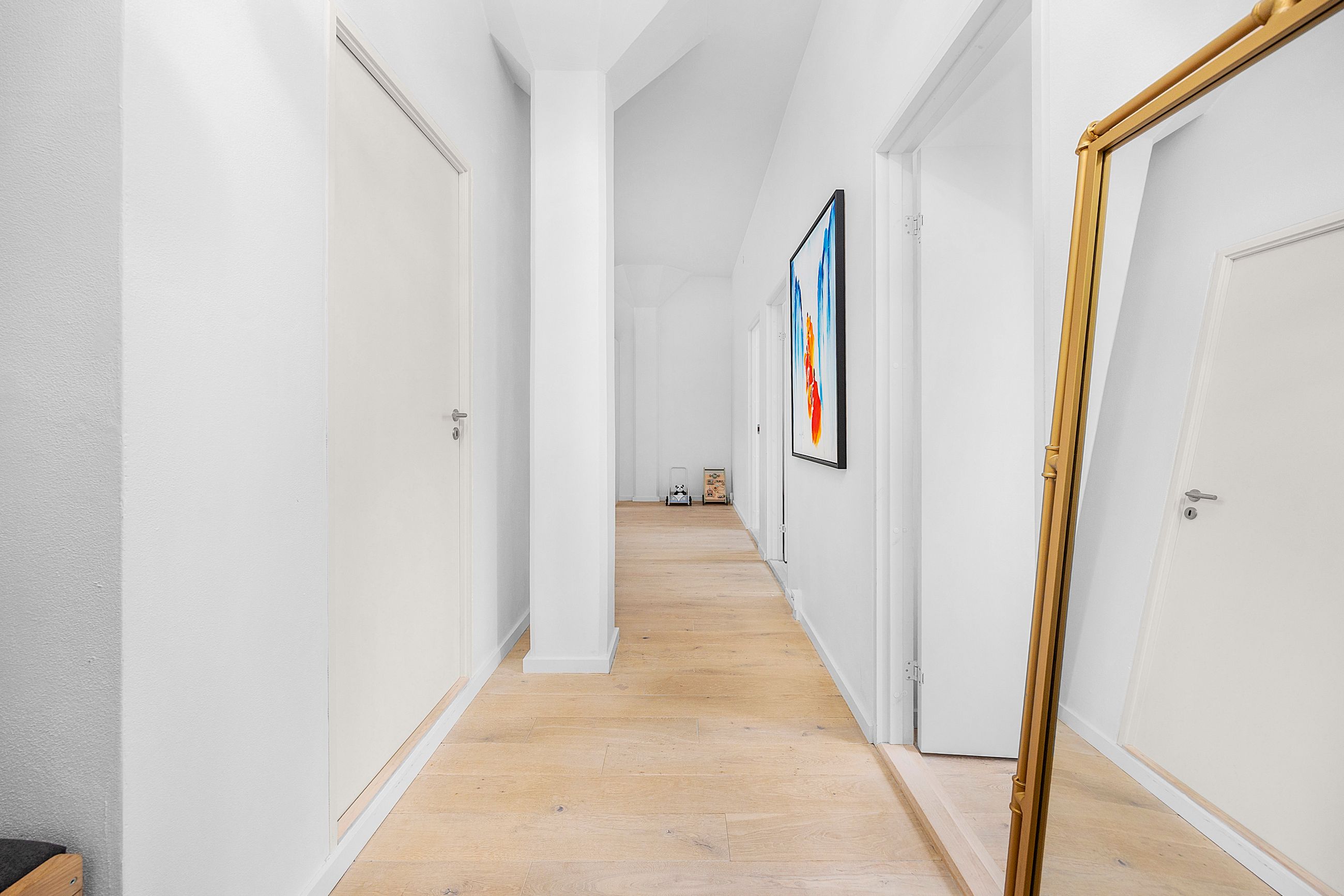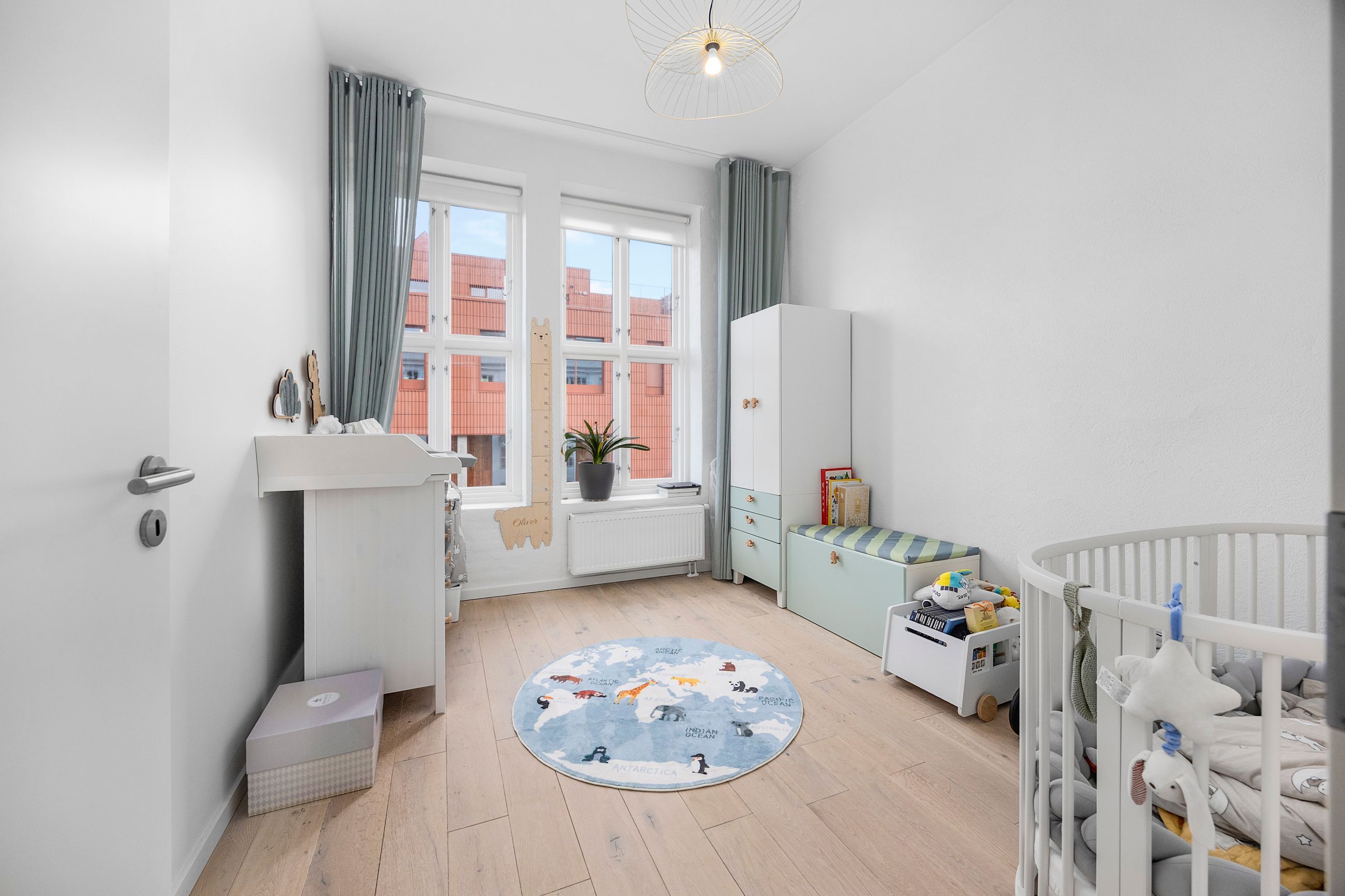 Planløsningen er virkelig god med tre regulære værelser, der kan indrettes efter behov som børneværelser, kontor eller gæsteværelse og samtidig er der fine opbevaringsmuligheder, så tingene kan gemmes væk. Badeværelset fremstår moderne og lækkert med separat bruseniche, to brusehoveder, vaskesøjle og gulvvarme, så komforten er helt i top.