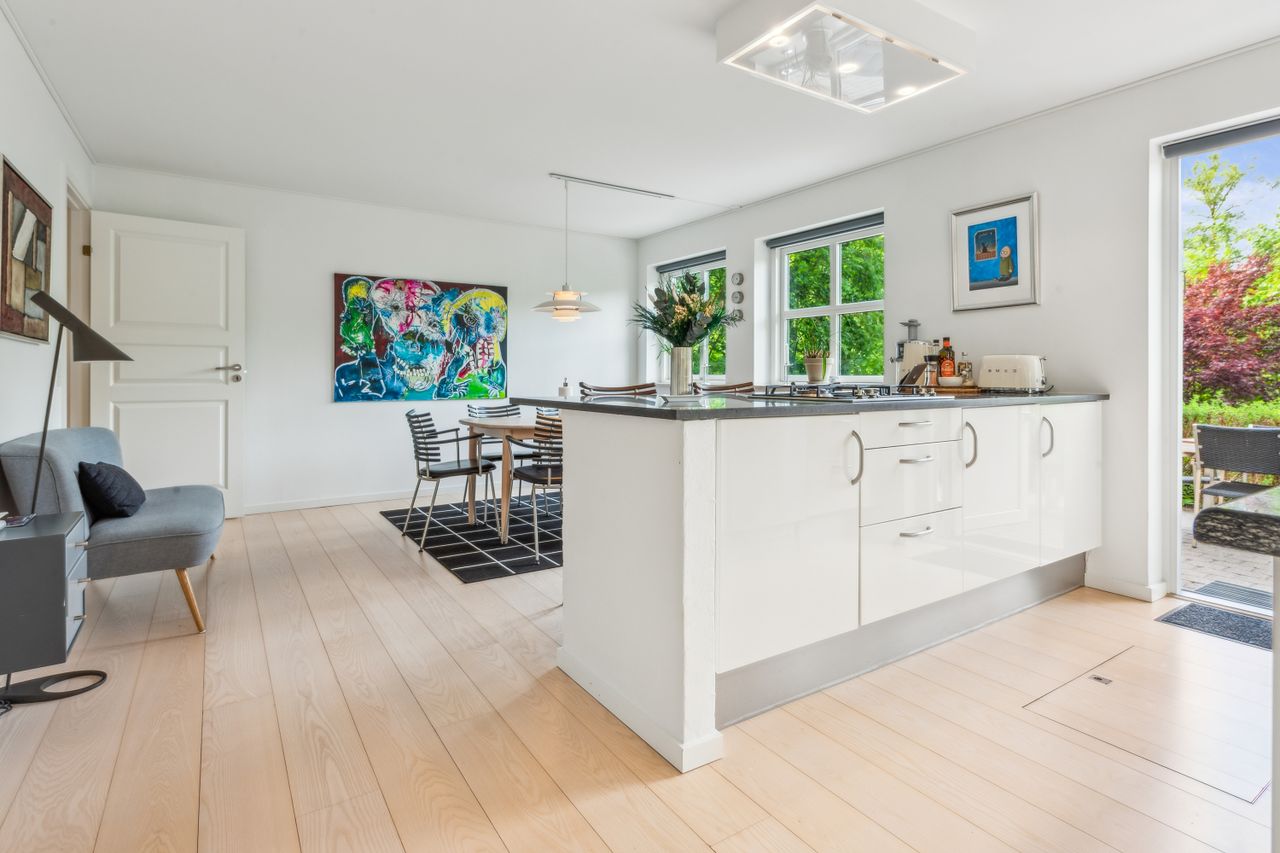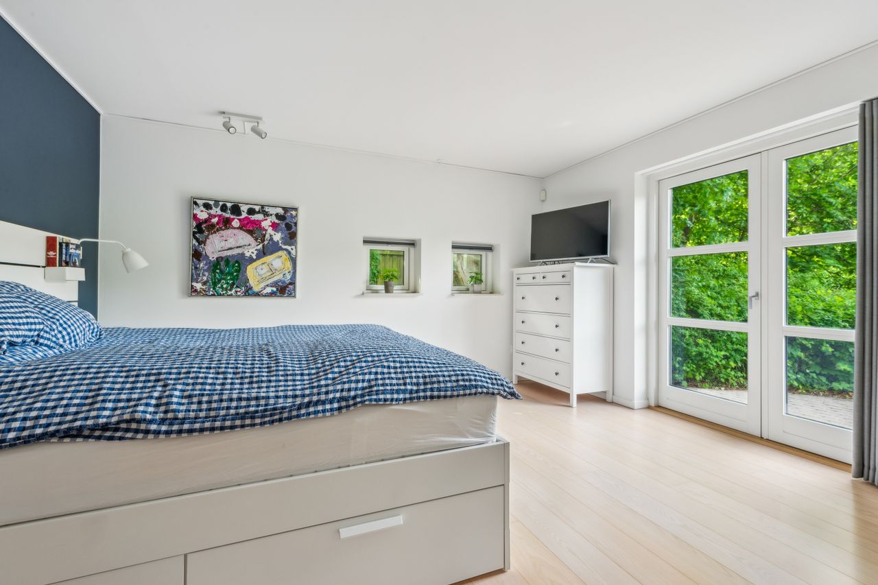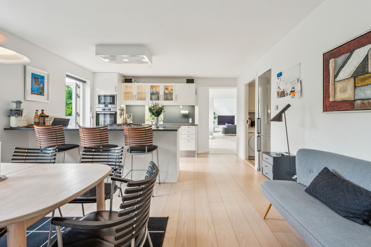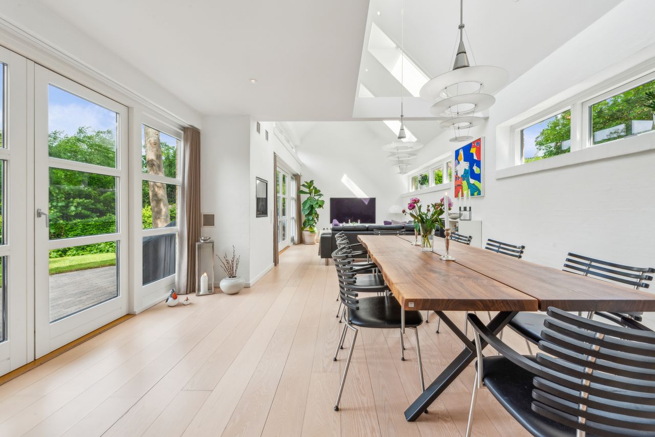 Køkken-alrummet åbner op mod en stor stue samt en ekstra spisestue med imponerende loft til kip og store vinduespartier. Fra disse rum kan du nyde den betagende udsigt over Sorgenfri Slotspark, hvor naturens skiftende årstider kan opleves på nærmeste hold. I stueetagen finder du også et badeværelse samt to soveværelser, herunder et stort masterbedroom, der tilbyder ro og komfort.