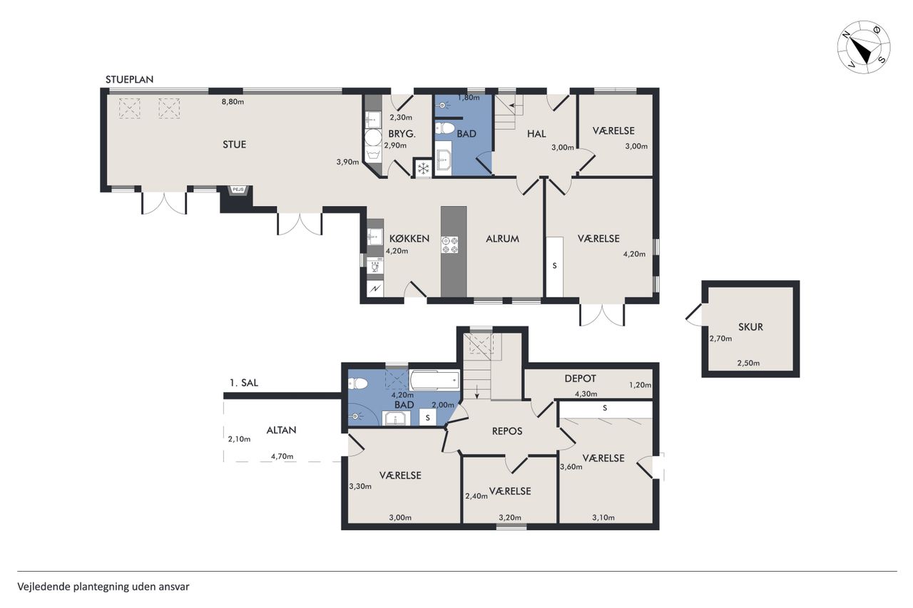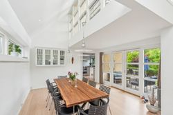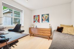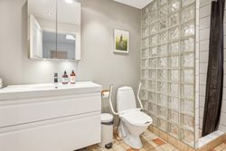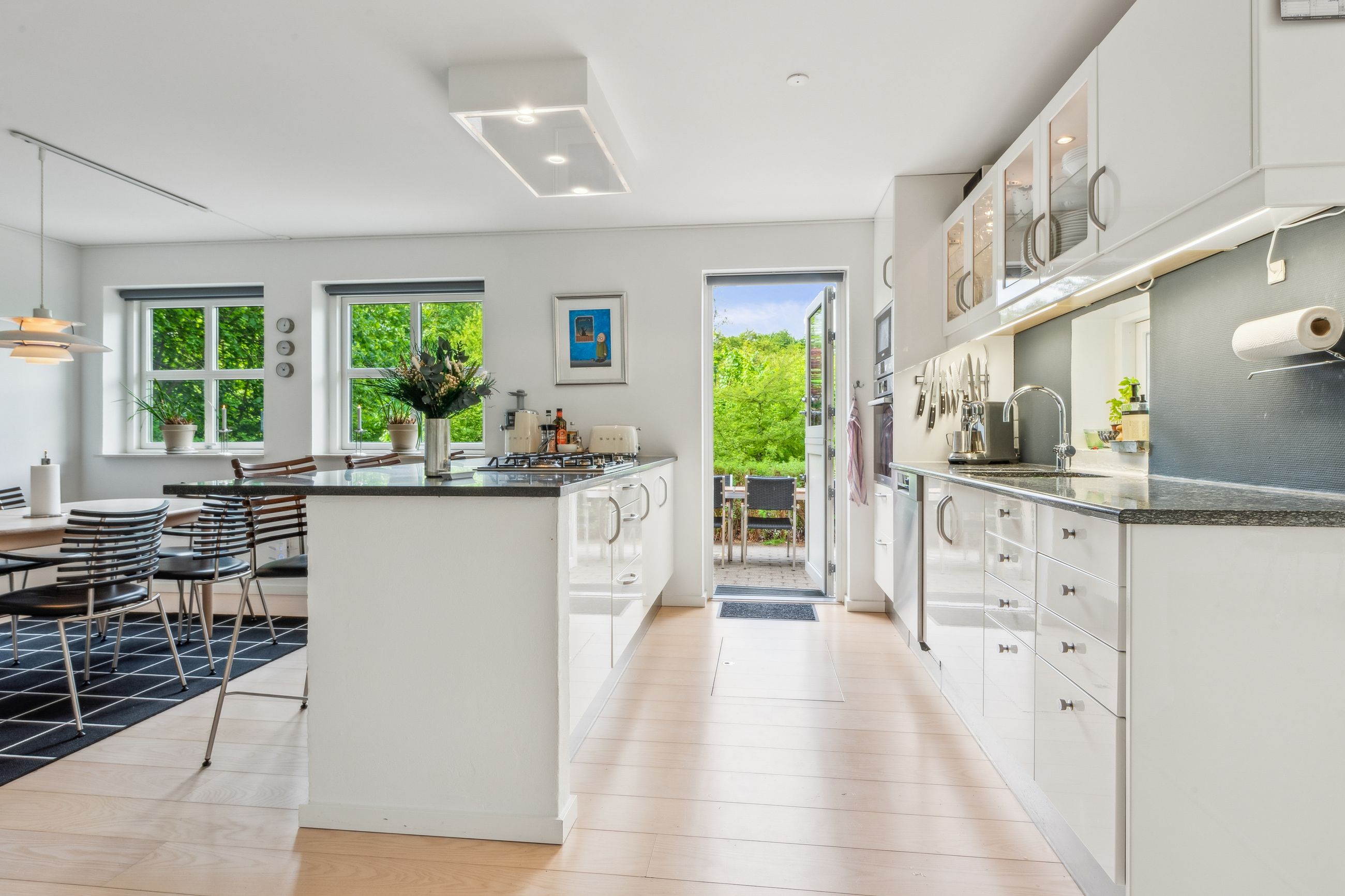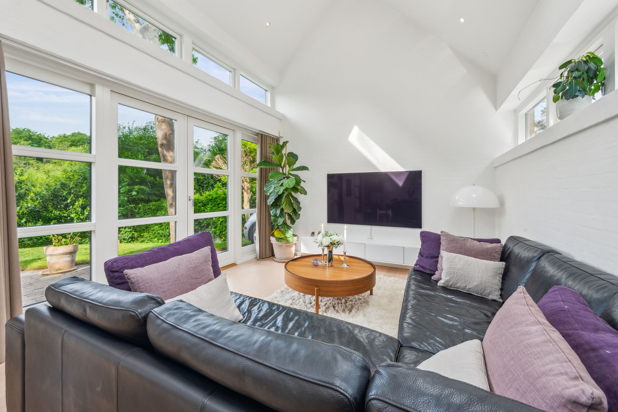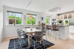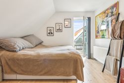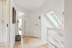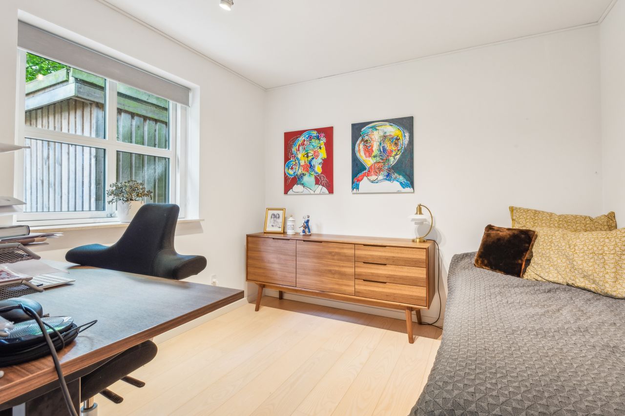 Køkken-alrummet åbner op mod en stor stue samt en ekstra spisestue med imponerende loft til kip og store vinduespartier. Fra disse rum kan du nyde den betagende udsigt over Sorgenfri Slotspark, hvor naturens skiftende årstider kan opleves på nærmeste hold. I stueetagen finder du også et badeværelse samt to soveværelser, herunder et stort masterbedroom, der tilbyder ro og komfort.