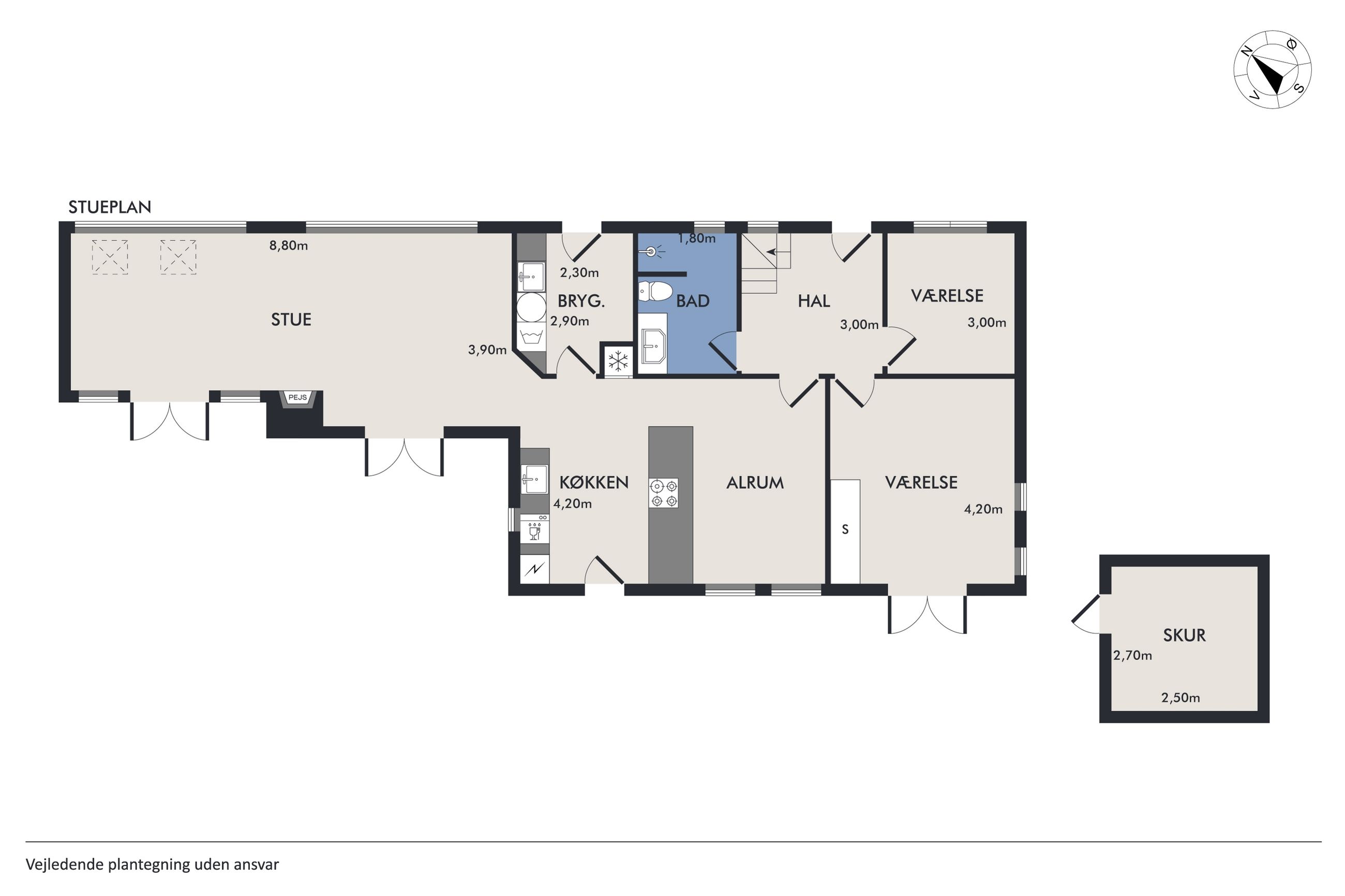 Velkommen til denne enestående villa, der kombinerer moderne komfort med naturskønne omgivelser. Ejendommen, der oprindeligt blev bygget i 1998 og tilbygget i 2009, byder på et rummeligt boligareal på hele 191 kvadratmeter. Når du træder ind i hjemmet, mødes du af et praktisk bryggers, som leder videre til det lyse køkken-alrum. Her er der god plads til både madlavning og hyggelige stunder omkring spisebordet.