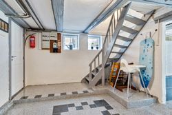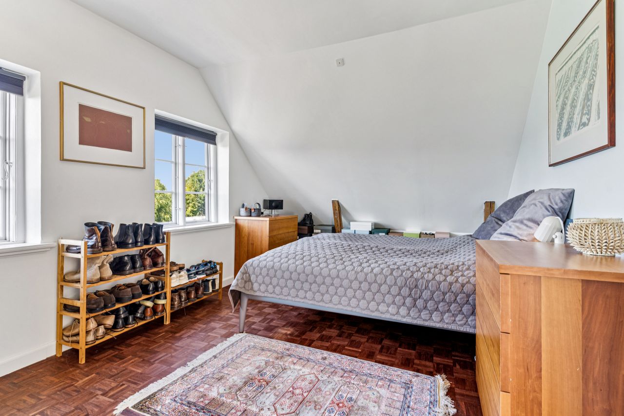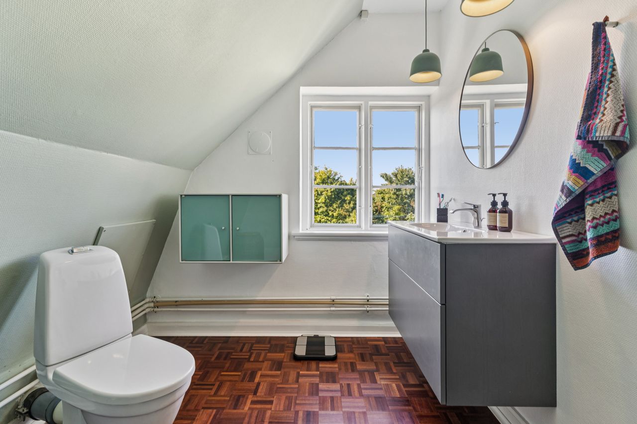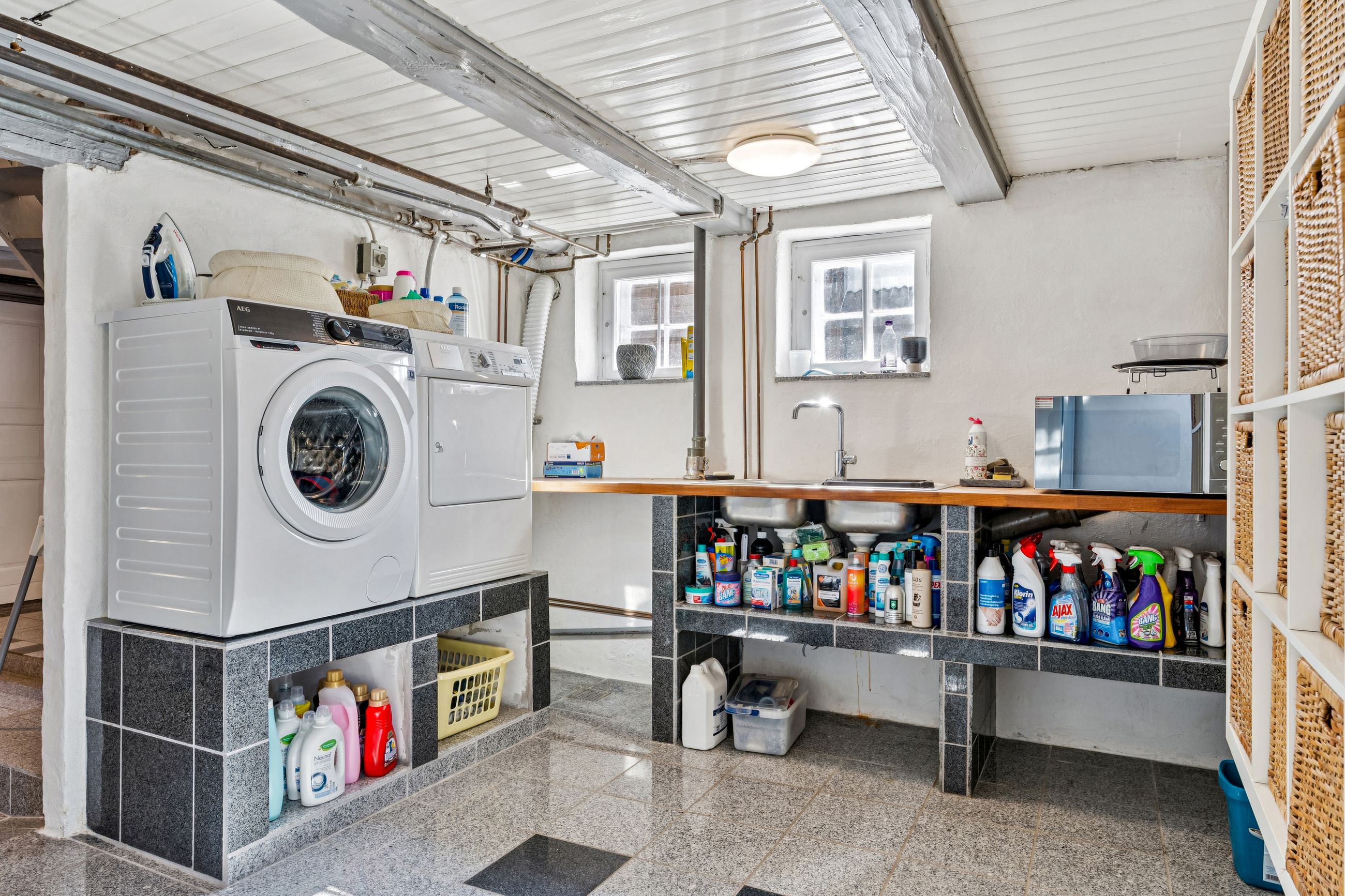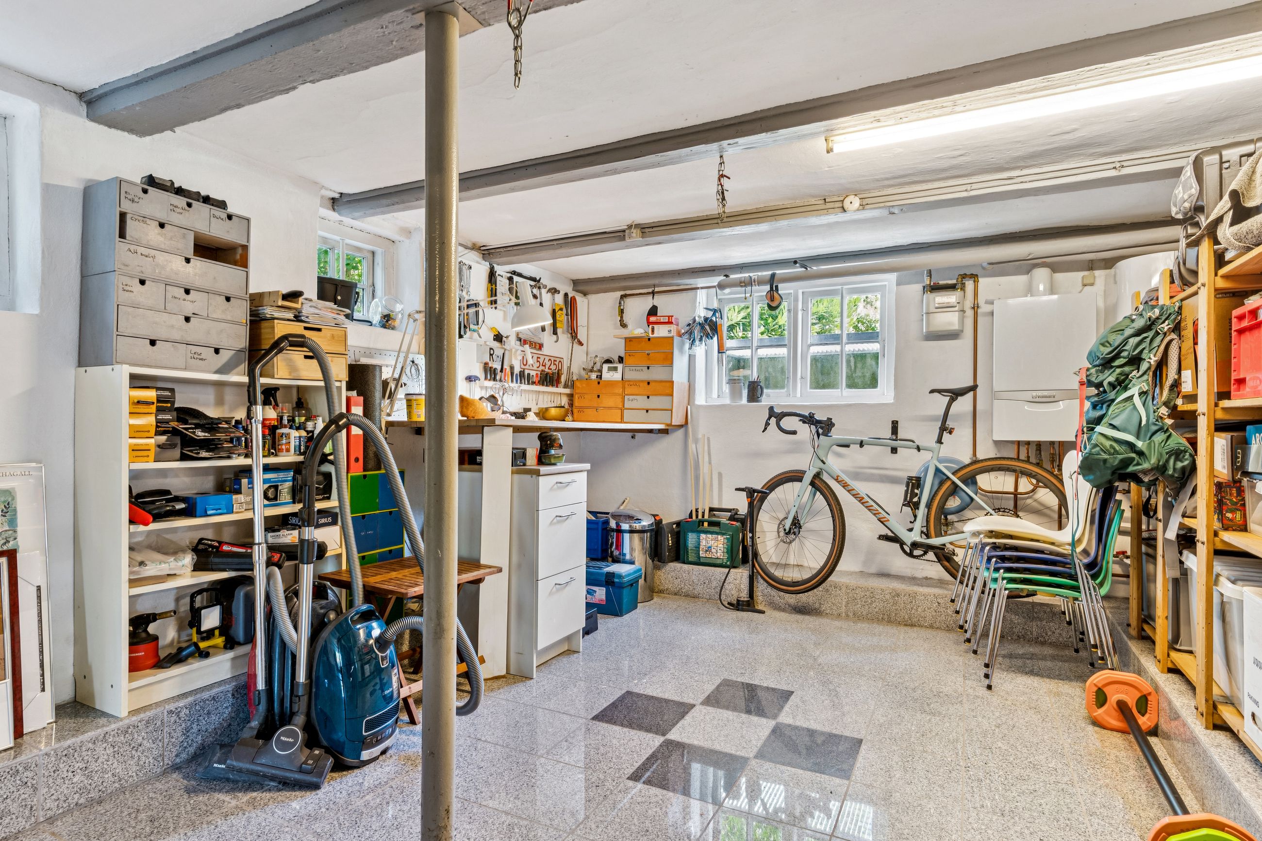 På første sal venter tre gode værelser samt et toilet. Den store repos kan let indrettes som en ekstra stue, kontor eller kreativt rum efter behov. Kælderen er højloftet og praktisk indrettet med flere rum – herunder et badeværelse med brus, vaskerum samt gode opbevaringsmuligheder. Derudover findes et gæsteværelse eller kontor med direkte udgang til haven.
