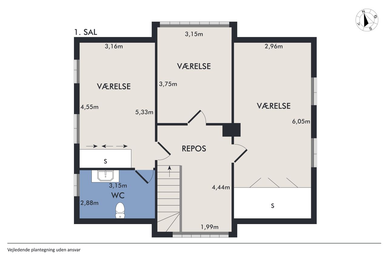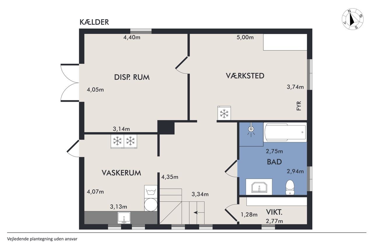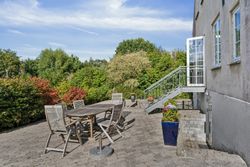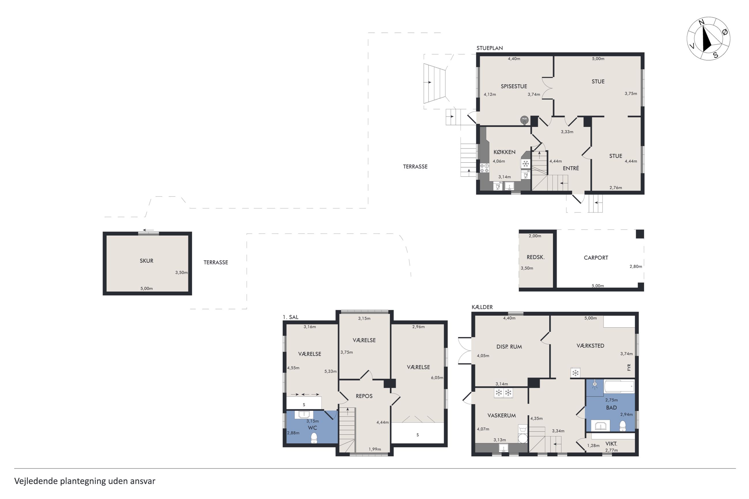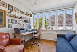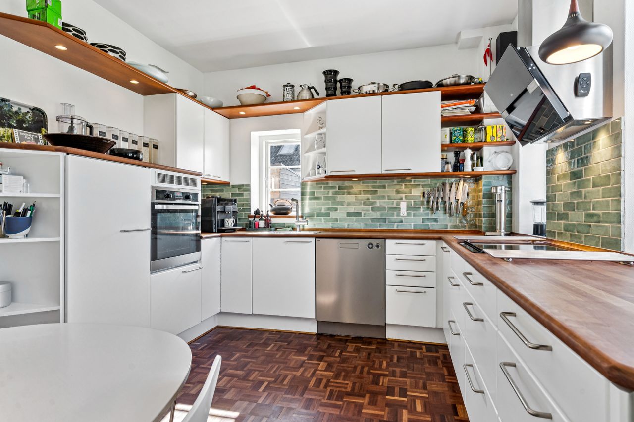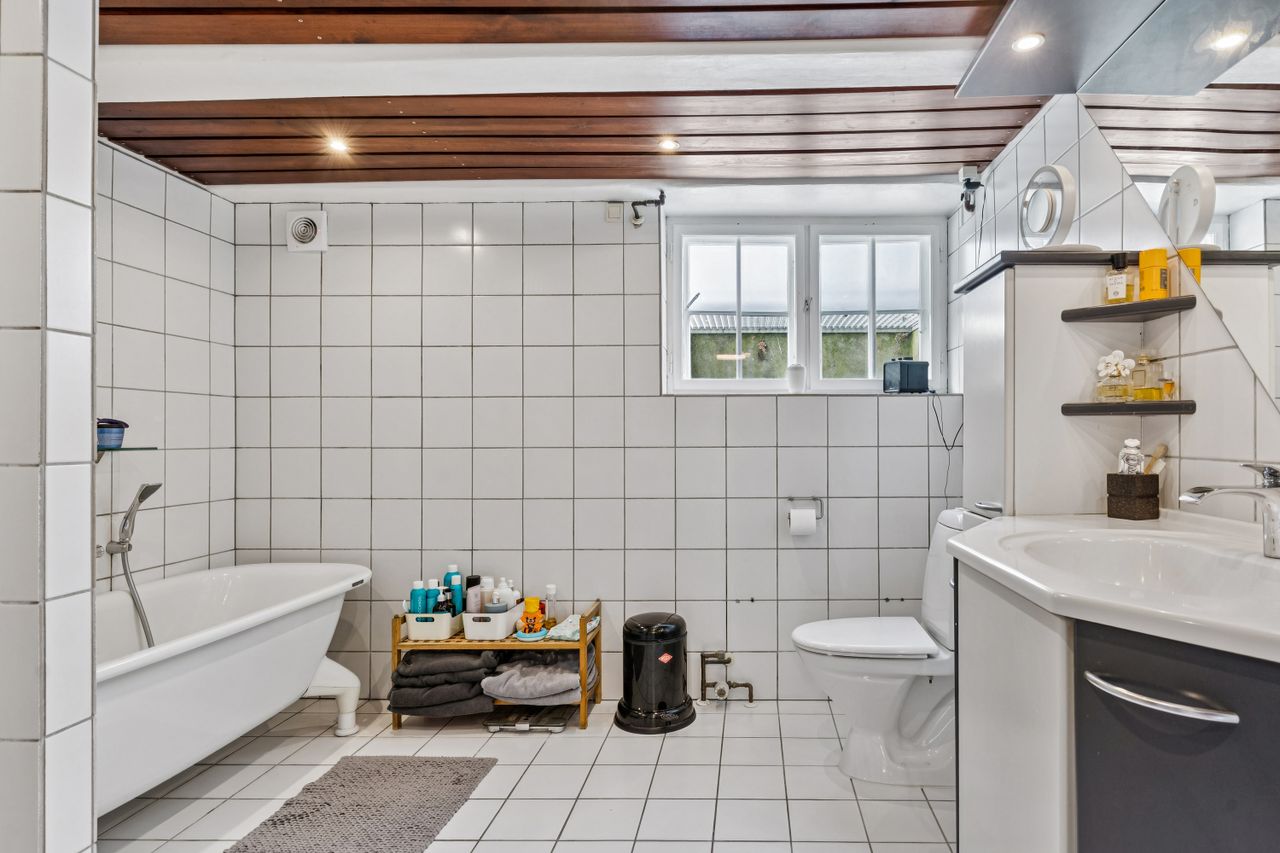 På første sal venter tre gode værelser samt et toilet. Den store repos kan let indrettes som en ekstra stue, kontor eller kreativt rum efter behov. Kælderen er højloftet og praktisk indrettet med flere rum – herunder et badeværelse med brus, vaskerum samt gode opbevaringsmuligheder. Derudover findes et gæsteværelse eller kontor med direkte udgang til haven.