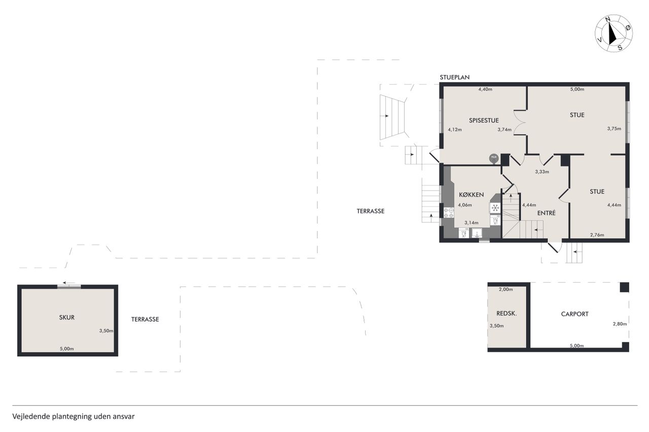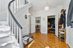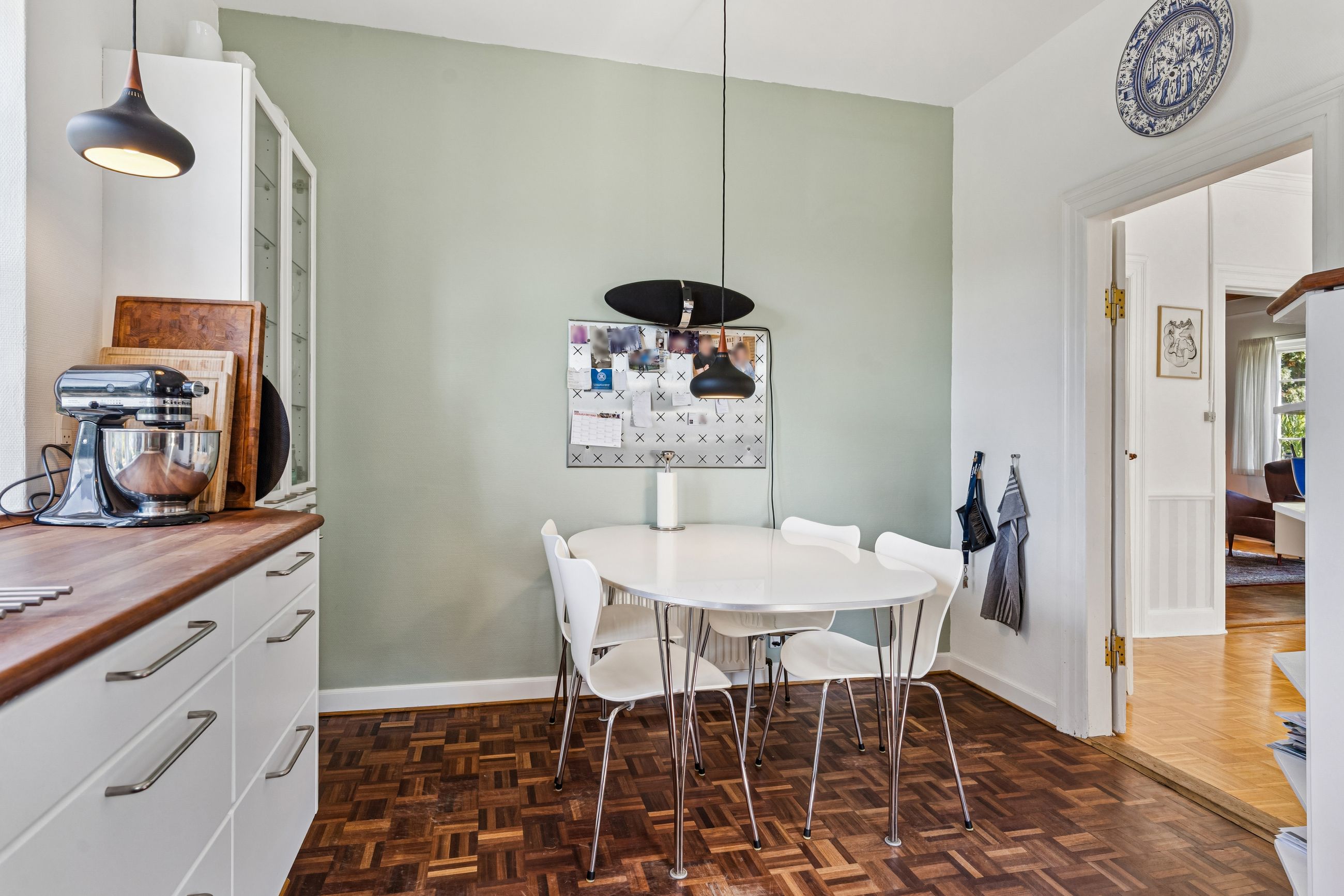 Når du træder ind gennem den store entré, bliver du mødt af en svungen trappe, der fører op til første sal. I stueetagen finder du et stort og lyst spisekøkken med masser af plads til både madlavning og samvær. De tre tilstødende stuer byder på rigelig plads til både afslapning og underholdning, mens de store vinduer giver et dejligt kig ud over grunden.