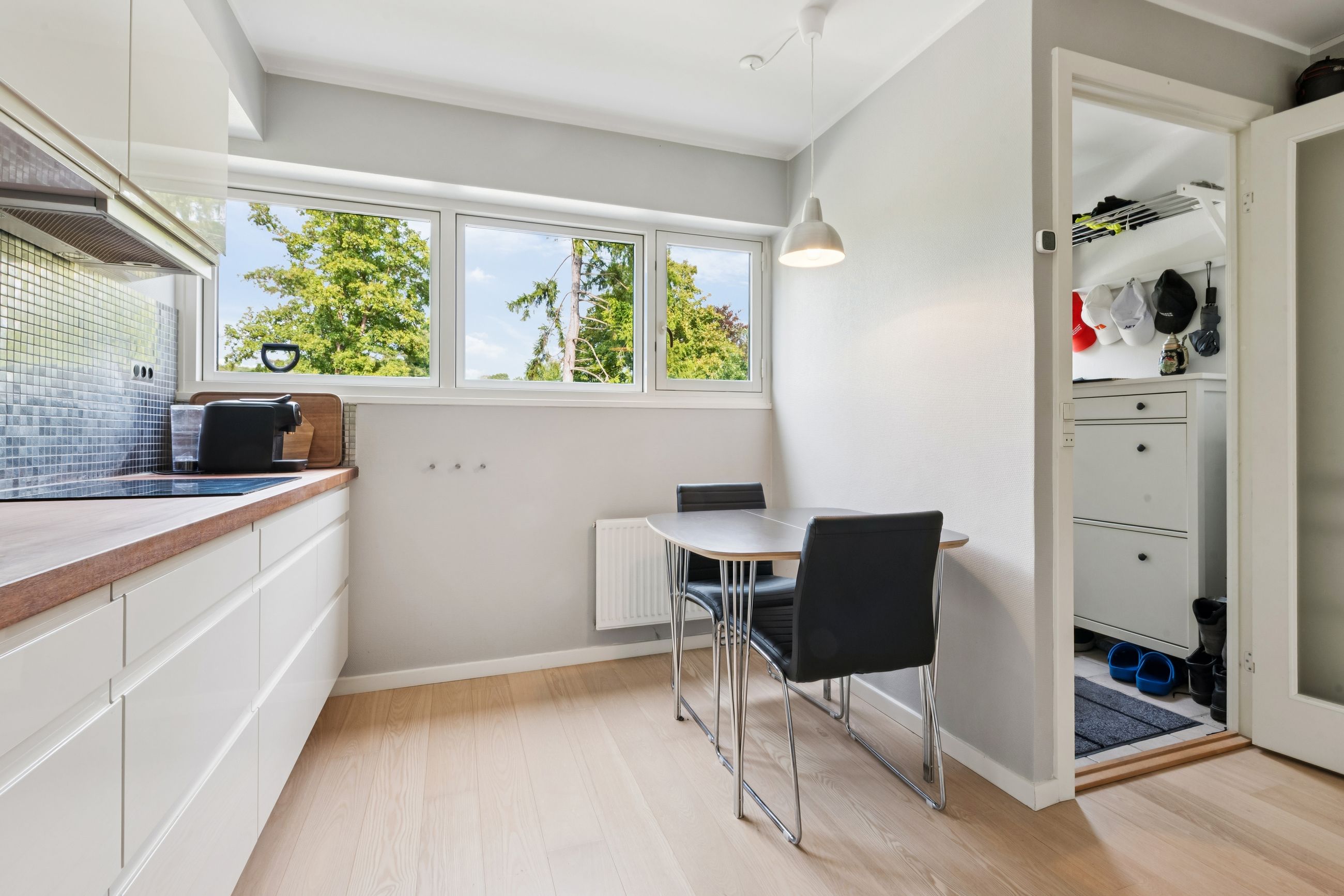 Velkommen til denne skønne ejerlejlighed, der byder på hele 88 kvadratmeter fordelt over to plan. Bygget i 1956, men opdateret med moderne bekvemmeligheder, er denne bolig perfekt for dem, der søger en kombination af klassisk charme og nutidig komfort. Når du træder ind gennem entreen eller vindfanget, mødes du af et nyere køkken udført i lyse elementer. Her er der plads til at nyde morgenkaffen ved spisepladsen, mens dagens første solstråler strømmer ind.
