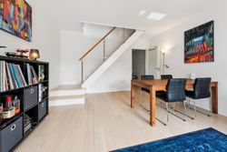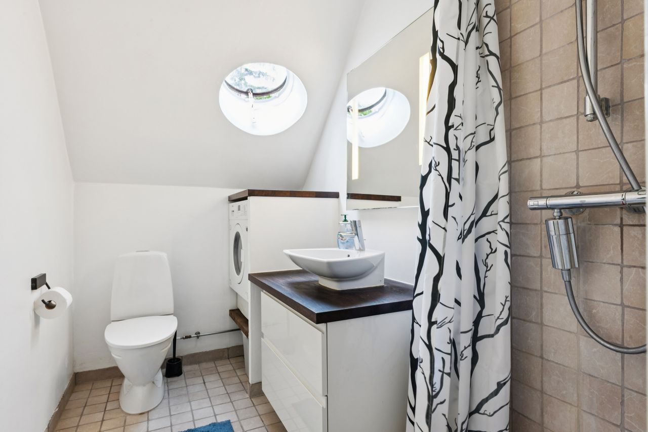Lejligheden har en rummelig stue/spisestue med et stort vinduesparti, som giver et smukt lysindfald og udsigt mellem bygningerne. Dette rum er ideelt til både afslapning og underholdning af gæster. På første sal finder du to gode værelser samt et nyere badeværelse udstyret med vaskemaskine – alt sammen designet for at gøre hverdagen så nem som muligt.