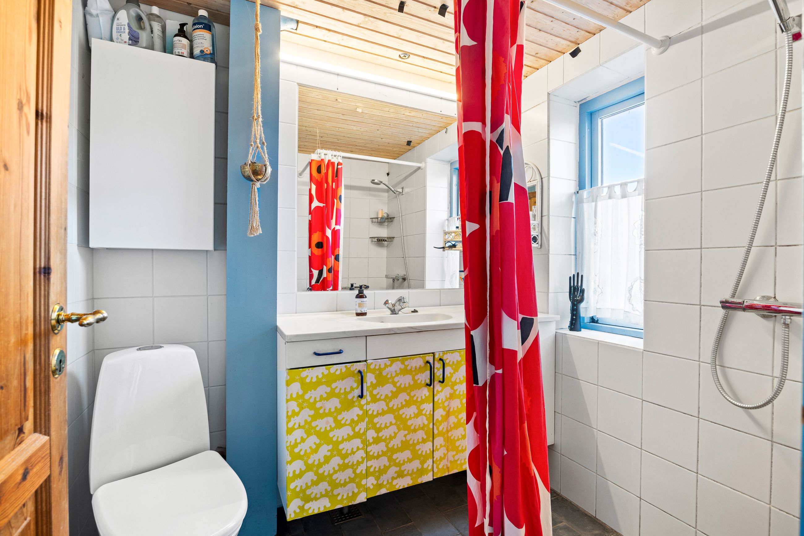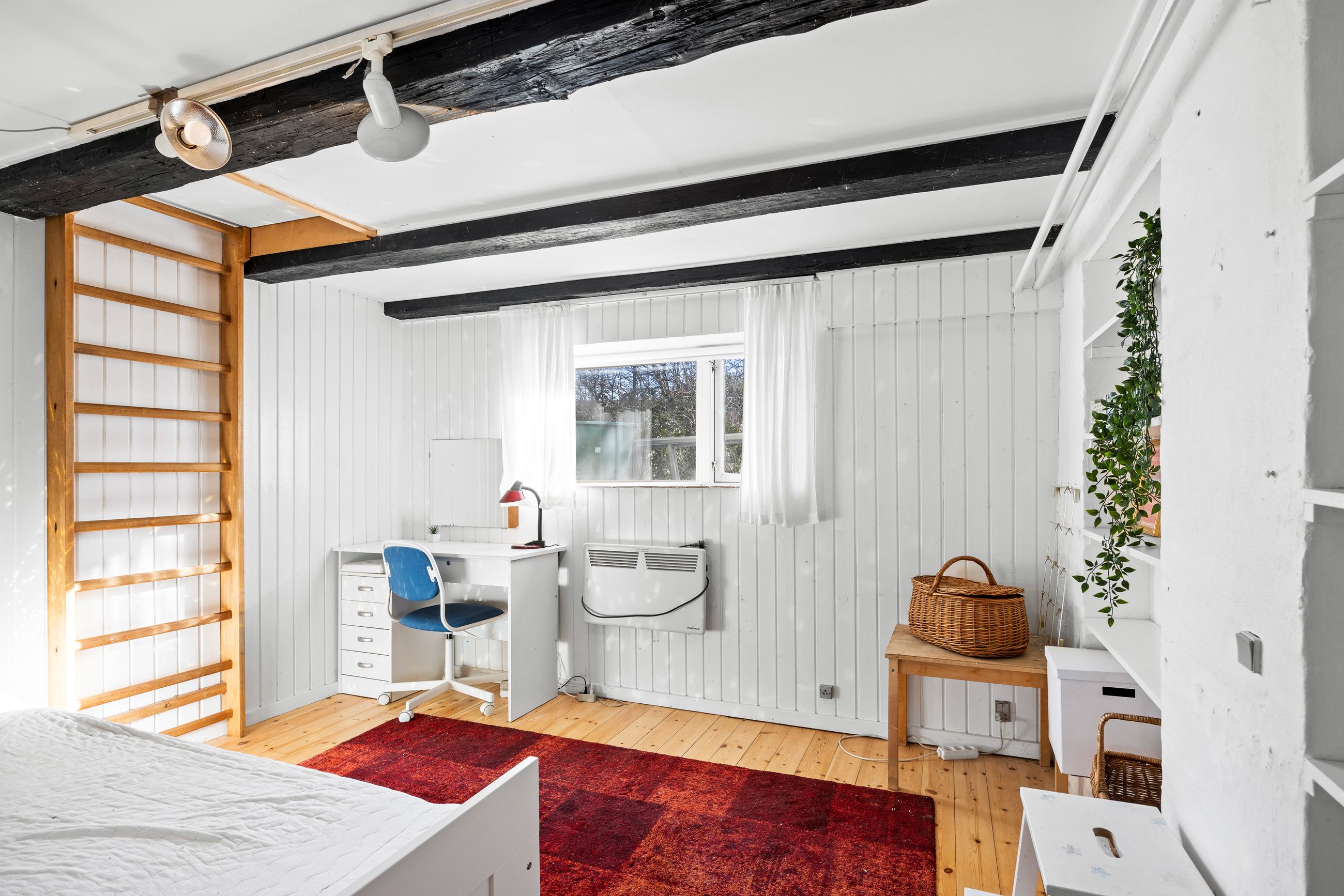 Badeværelset er funktionelt indrettet med brus og alt hvad du behøver for en nem hverdag. Ejendommen har også direkte adgang til kælderen, hvor der findes et disponibelt rum samt god opbevaringsplads – ideelt for dem der ønsker ekstra plads til hobbyprojekter eller opbevaring.