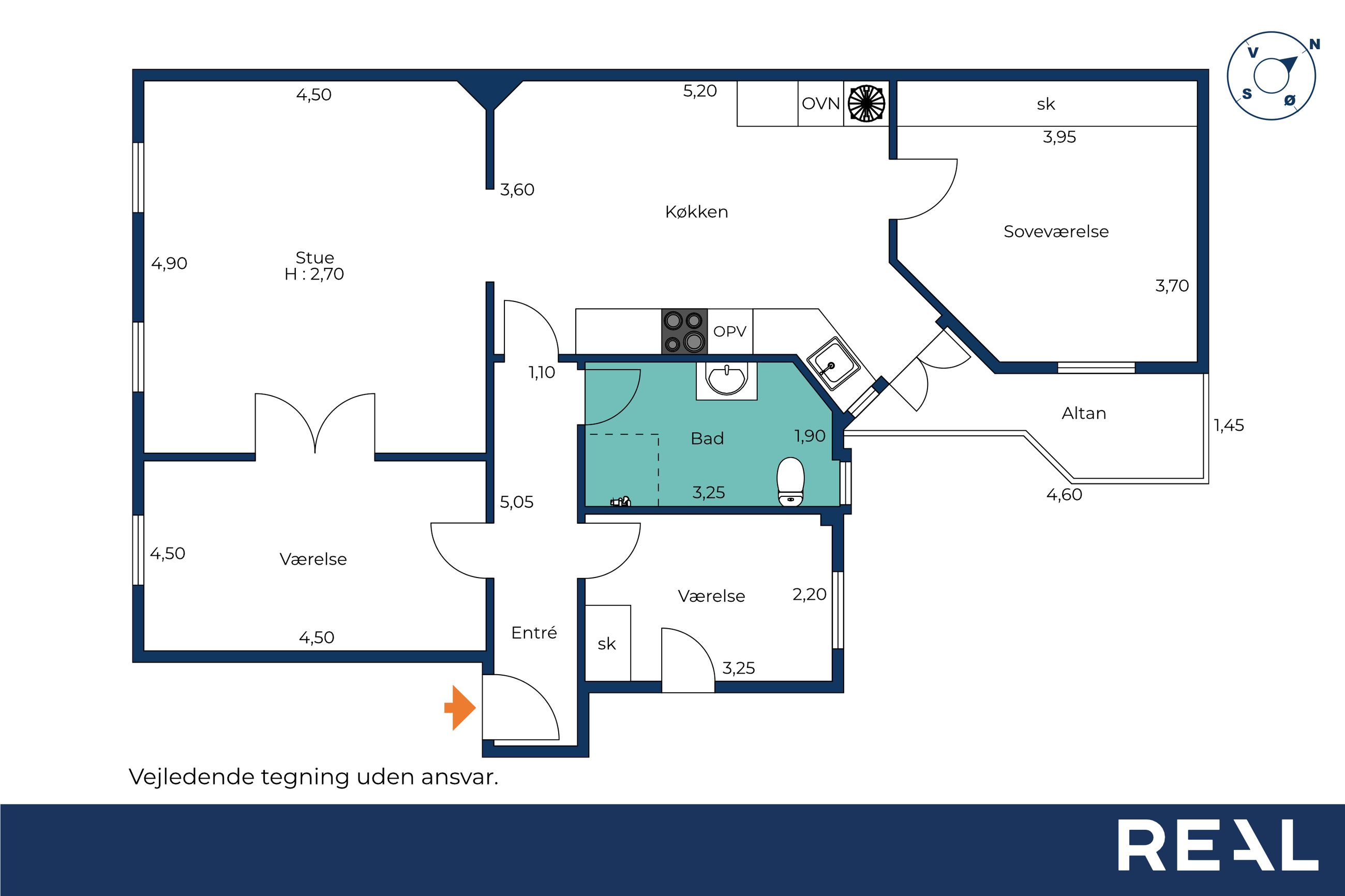 Denne lyse og solrige lejlighed byder på en rummelig entré og et stort, velholdt badeværelse med separat bruseniche. Det store køkken-alrum ligger en suite med den sydvendte opholdsstue. Dertil kommer et stort soveværelse og to børneværelser.