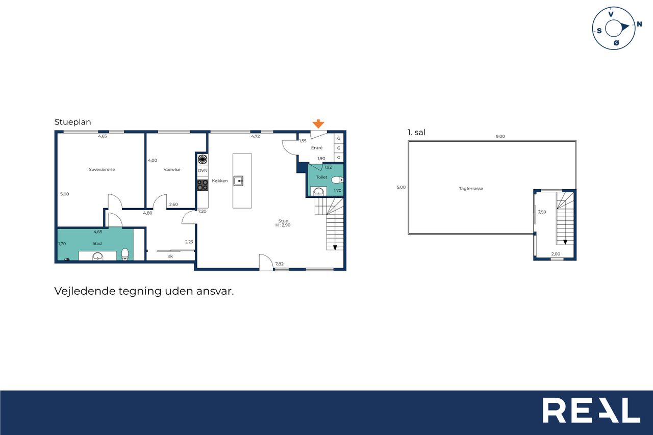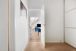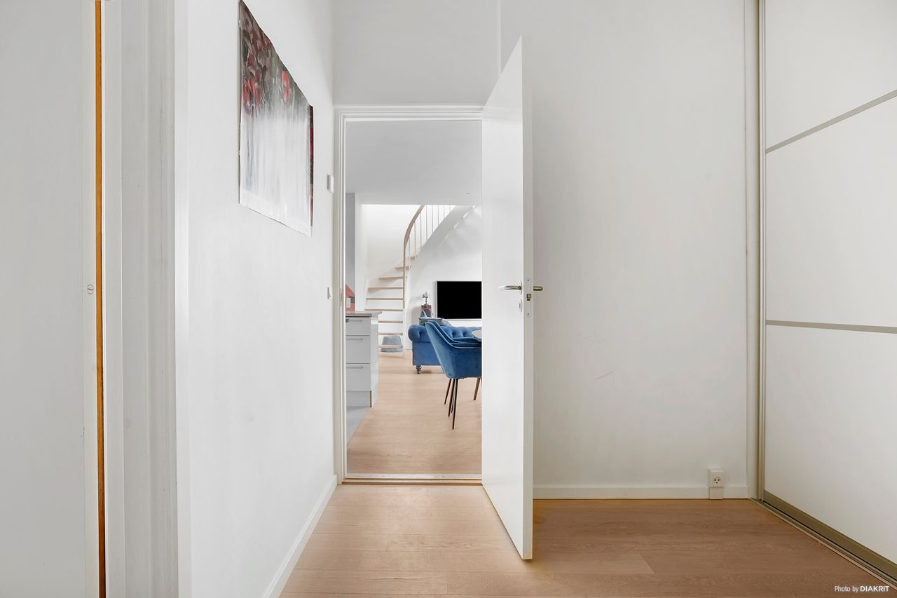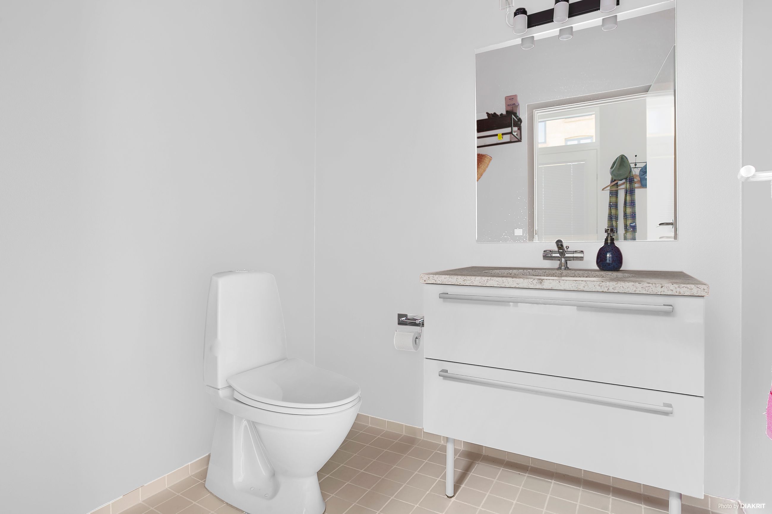 Boligen er praktisk indrettet med en entré med garderobeskab, et særdeles rummeligt gæstetoilet, mellemgang med skabe, Stort soveværelse, eksklusivt badeværelse med ovenlys, bruseniche og vaskesøjle. Ydermere et stort værelse med skabe, hvor det nemt kan opdeles i to, så der i alt kan etableres tre soveværelser.