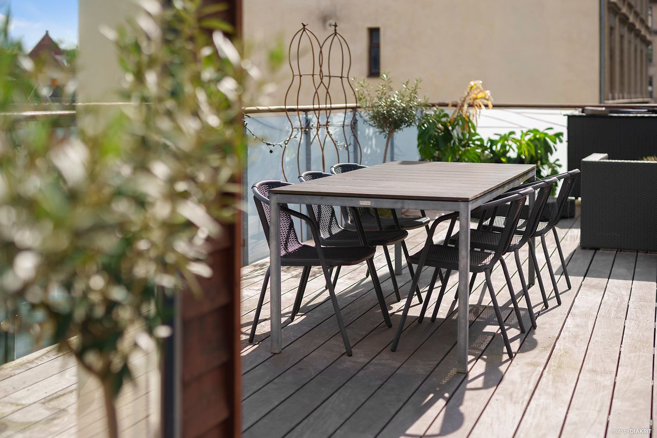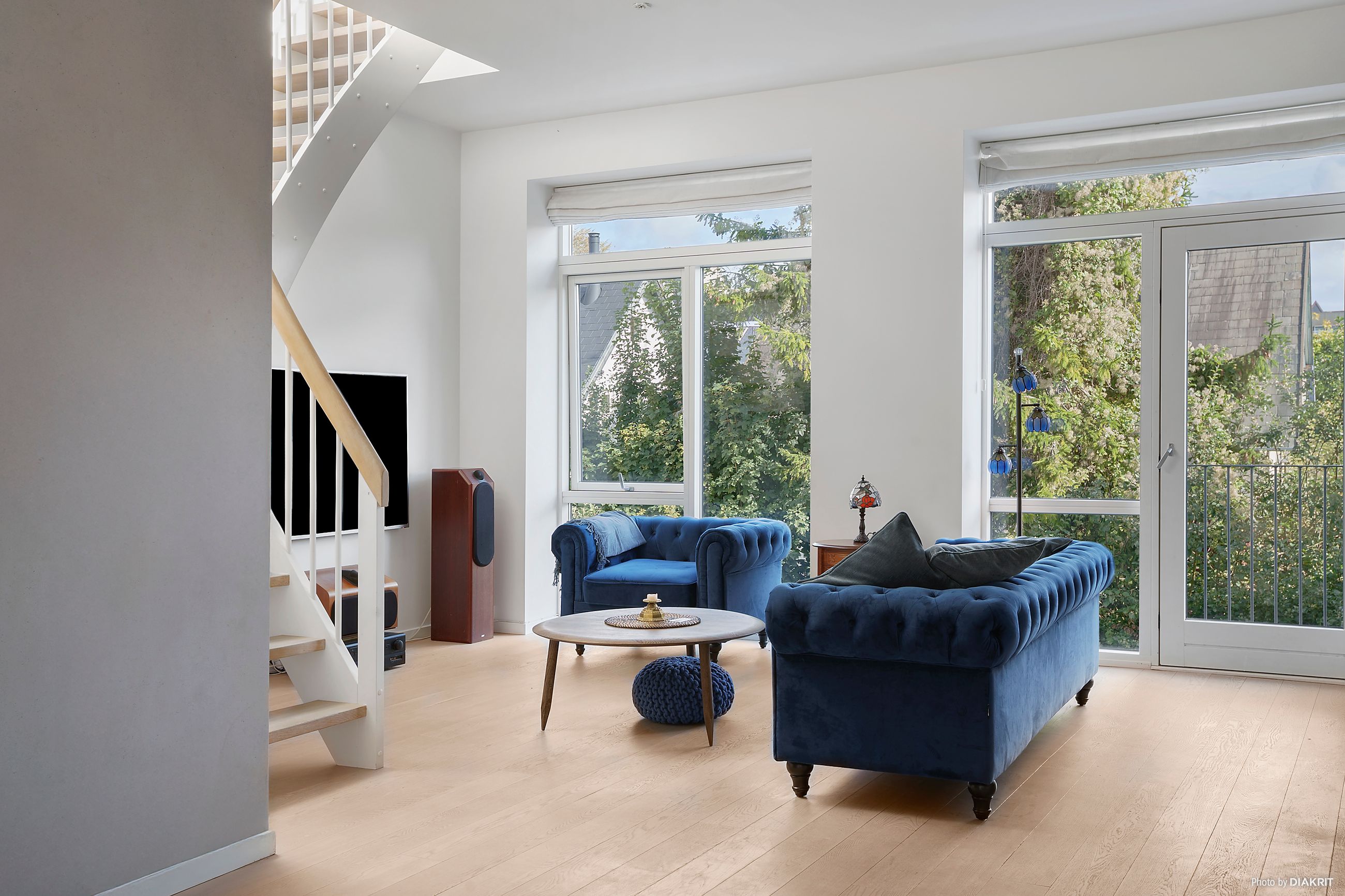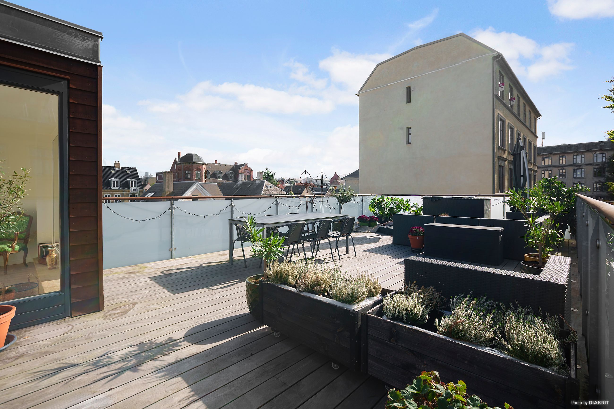 Fra stuen fører en trappe til reposen, som kan anvendes som kontor eller læsekrog, og herfra er der direkte udgang til den private tagterrasse på ca. 50 kvm. Her får du en enestående mulighed for at nyde udelivet og solen dagen igennem – en luksus, der sjældent ses på Frederiksberg.