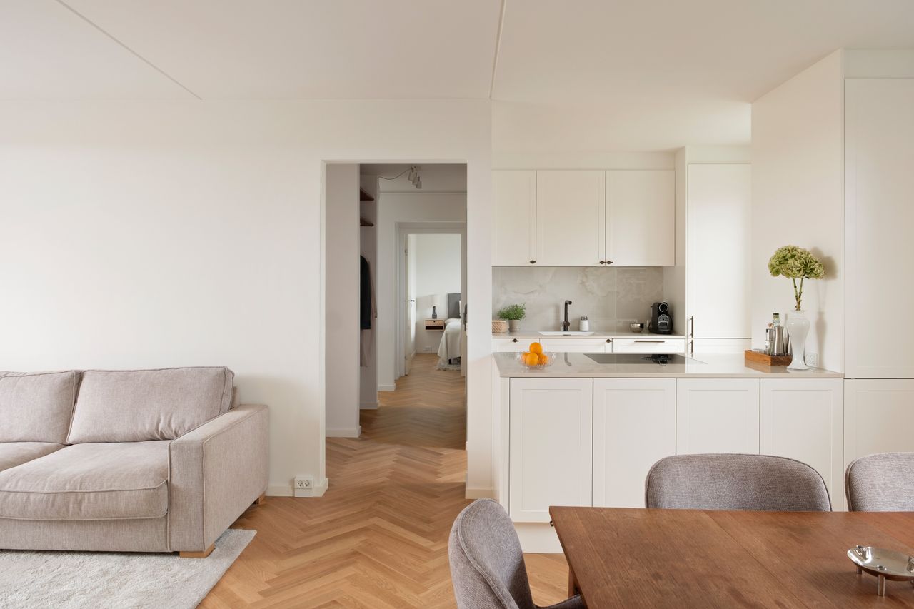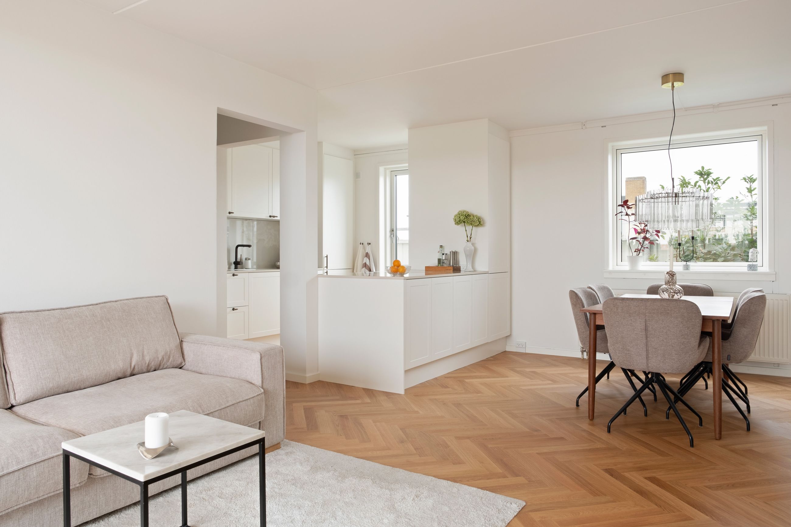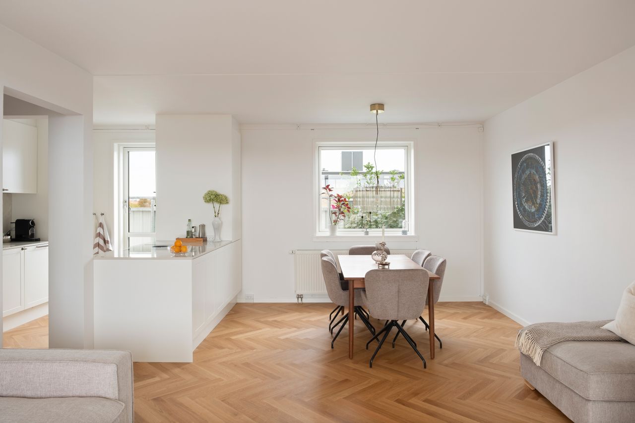 Allerede ved ankomsten via elevatoren mærker man roen og rummeligheden. Entré med garderobeplads – og herfra åbner lejlighedens hjerte sig i det elegante køkken-alrum med et stilrent Tvis-køkken, udført i moderne materialer og med kvalitetsløsninger, der smelter harmonisk sammen med det åbne opholdsrum med pejs. Her er der både plads til spisebord og loungedel – en indbydende ramme for både hverdag og gæster. Overalt i lejligheden er der lagt flot, elegant sildebensparket, som understreger boligens eksklusive udtryk.