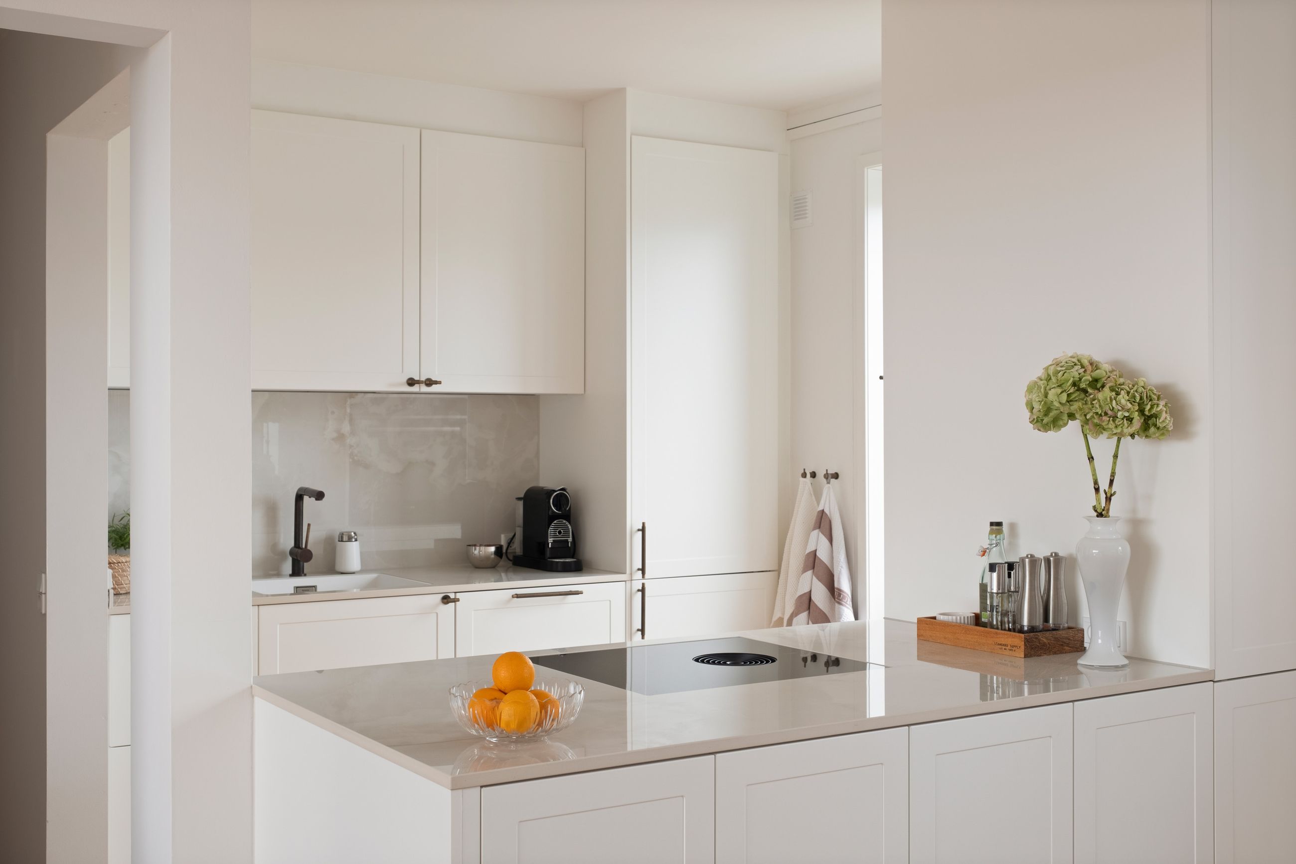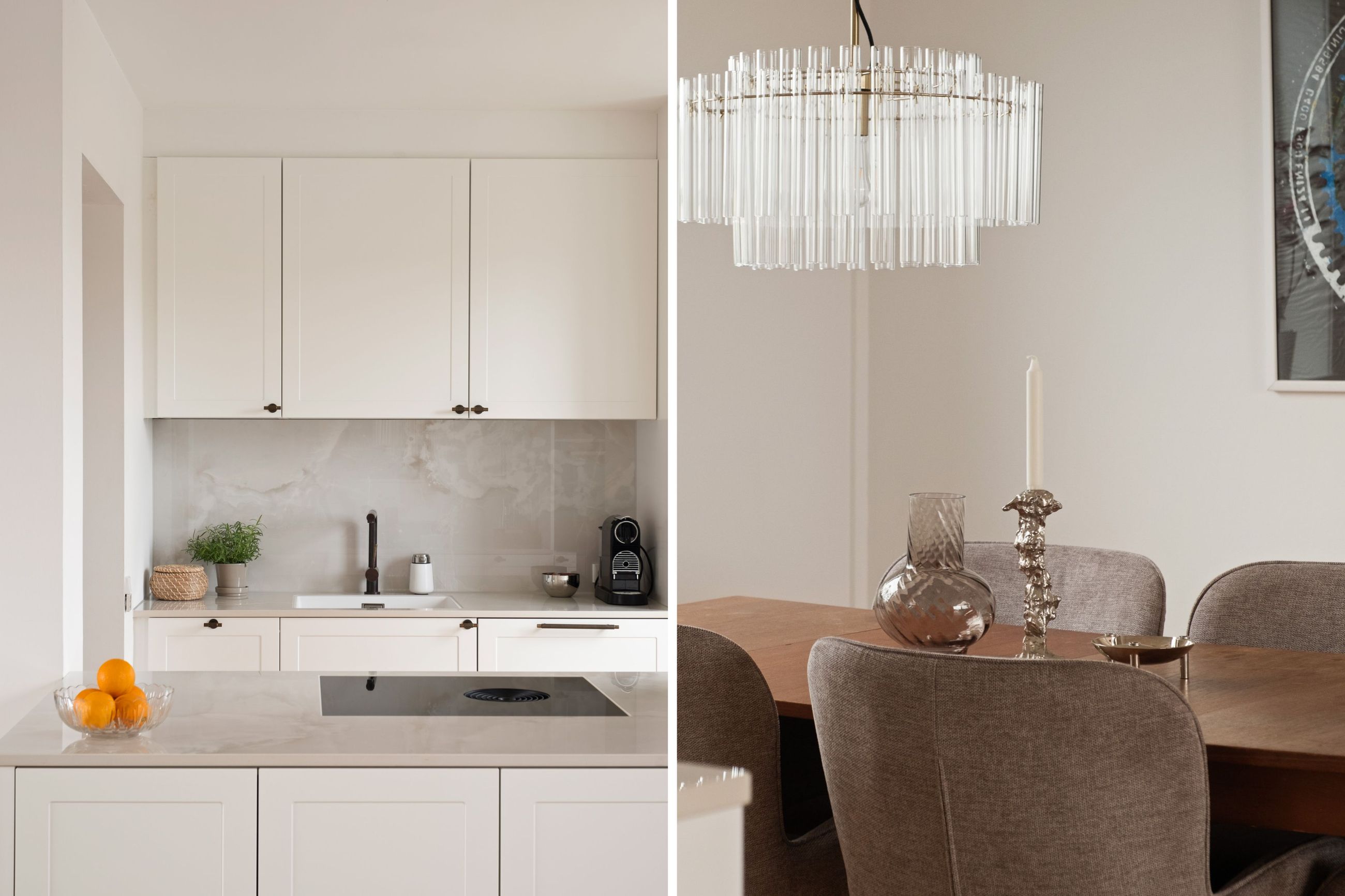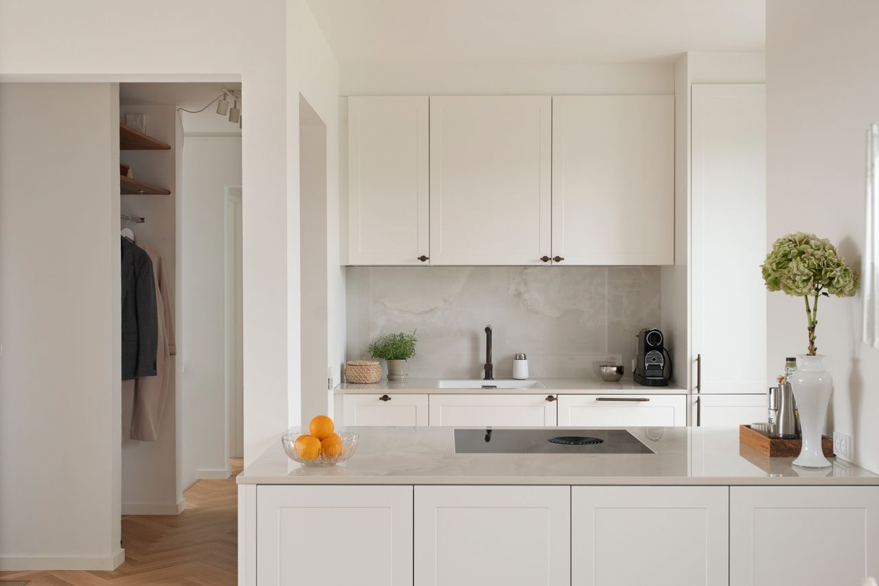 Allerede ved ankomsten via elevatoren mærker man roen og rummeligheden. Entré med garderobeplads – og herfra åbner lejlighedens hjerte sig i det elegante køkken-alrum med et stilrent Tvis-køkken, udført i moderne materialer og med kvalitetsløsninger, der smelter harmonisk sammen med det åbne opholdsrum med pejs. Her er der både plads til spisebord og loungedel – en indbydende ramme for både hverdag og gæster. Overalt i lejligheden er der lagt flot, elegant sildebensparket, som understreger boligens eksklusive udtryk.