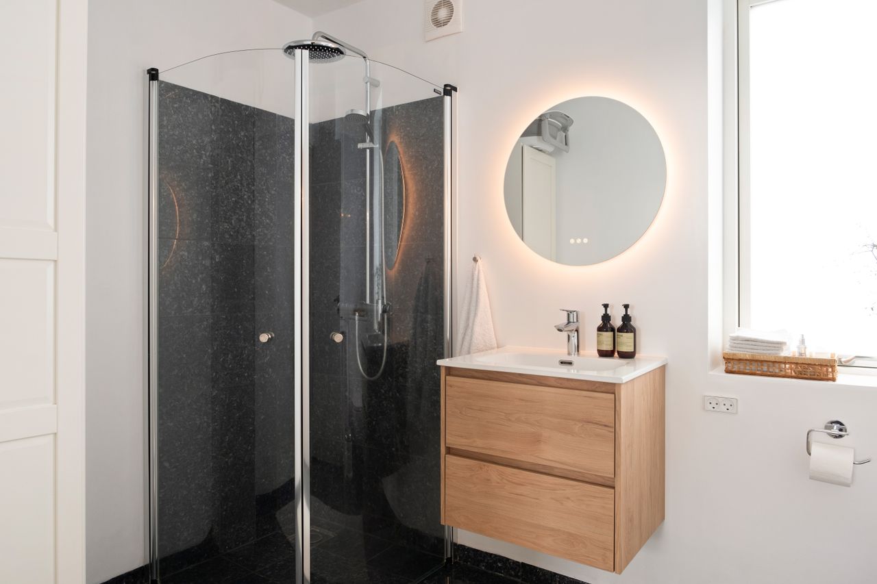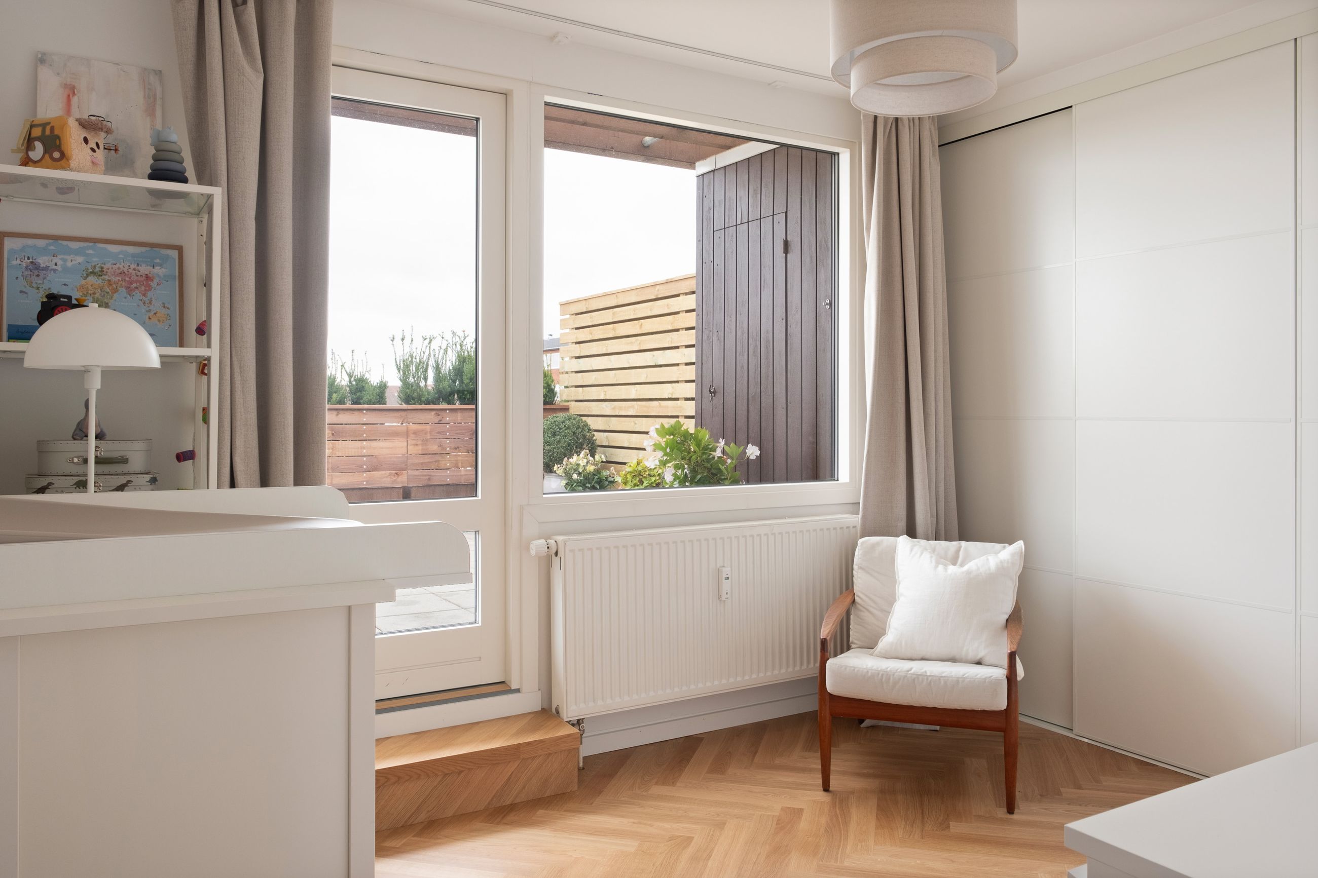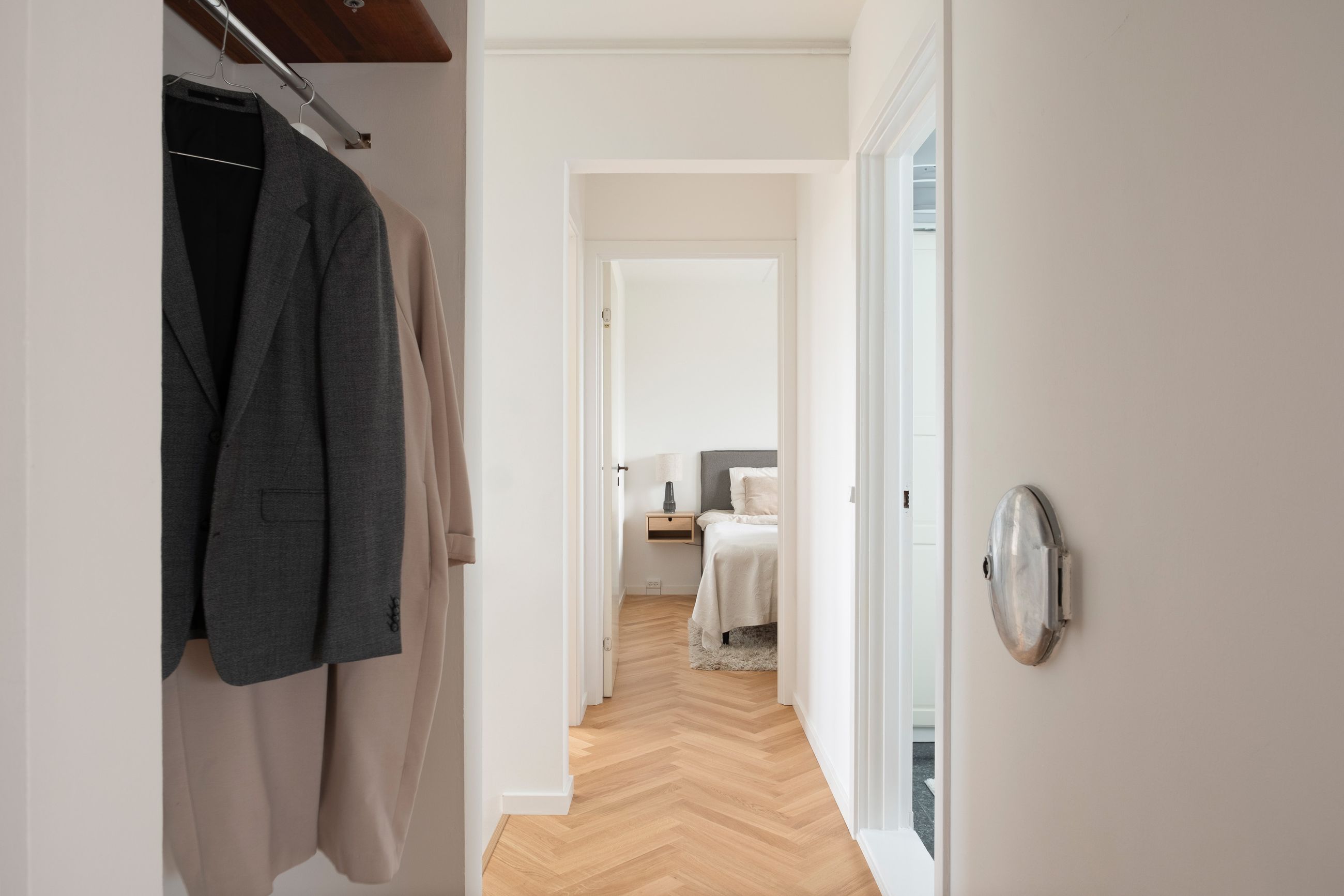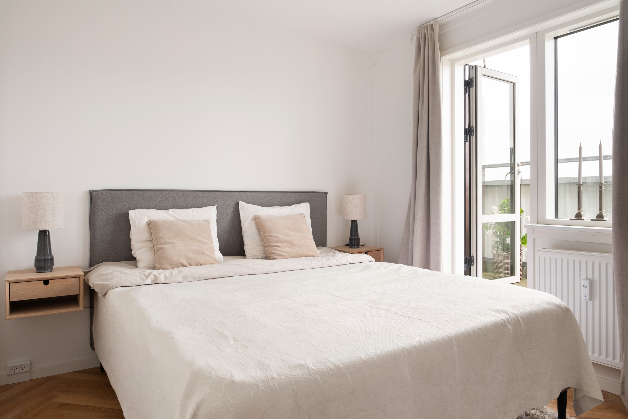 Lejligheden rummer desuden to gode soveværelser – det ene oplagt som master bedroom, det andet som gæsteværelse eller kontor – begge med et roligt lysindfald og god skabsplads. Badeværelset er moderne og stilrent indrettet med separat bruseniche, gulvvarme og kvalitetsmaterialer.
