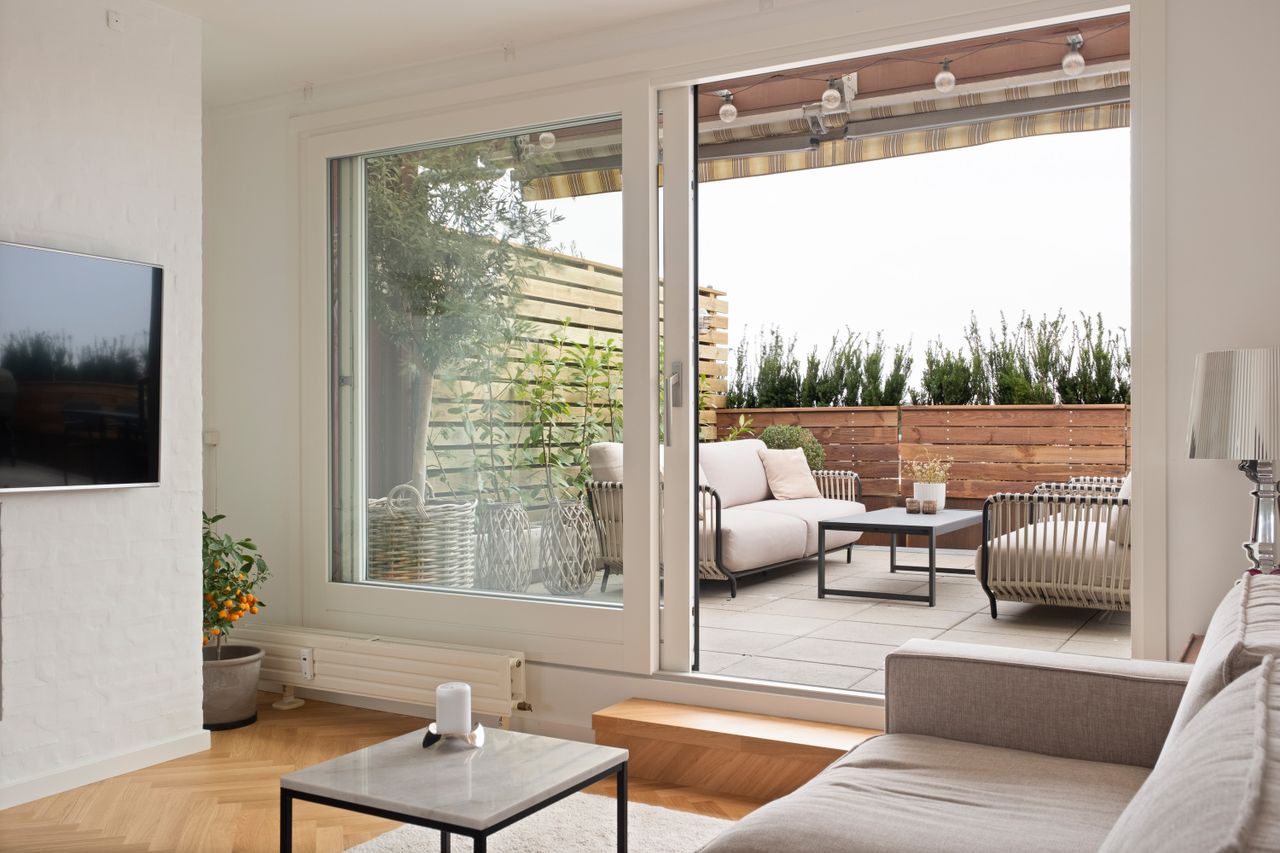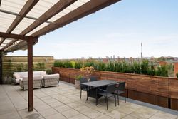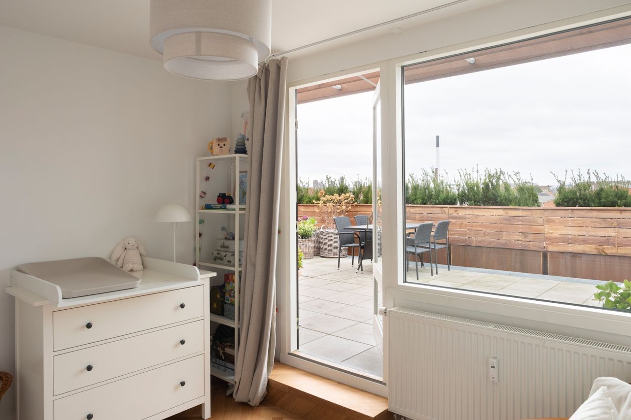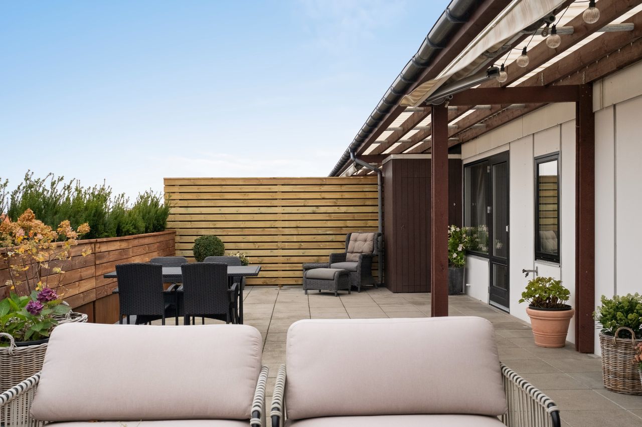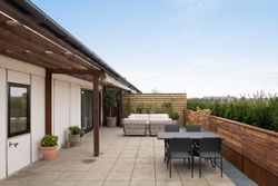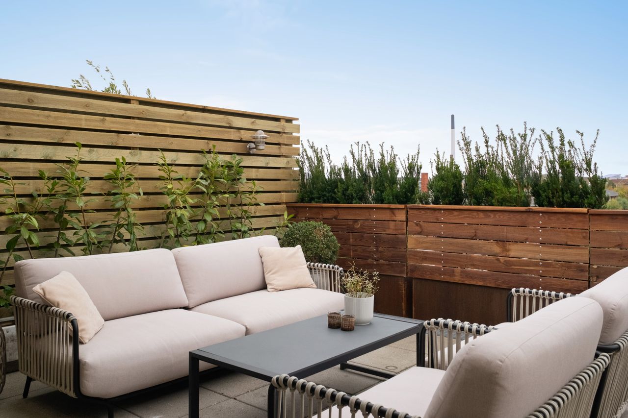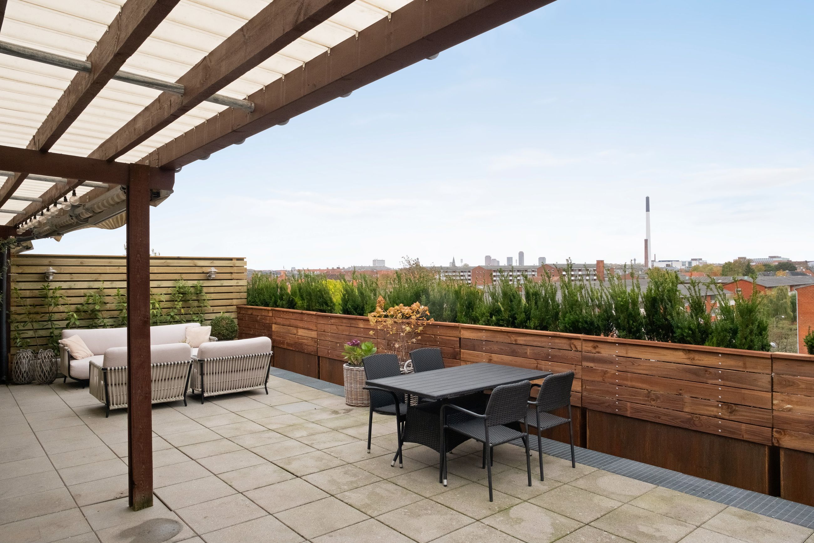 Fra stuen åbner døren sig til lejlighedens absolutte højdepunkt – den sydvendte, private tagterrasse på ca. 60 kvm. Højt hævet over byens tage kan du her nyde solen fra morgen til aften og betragte den storslåede panoramaudsigt over hele København. Terrassen har masser af plads til både loungemøbler, grill og planter – et sted, hvor inde- og udeliv smelter sammen på den mest indbydende måde.