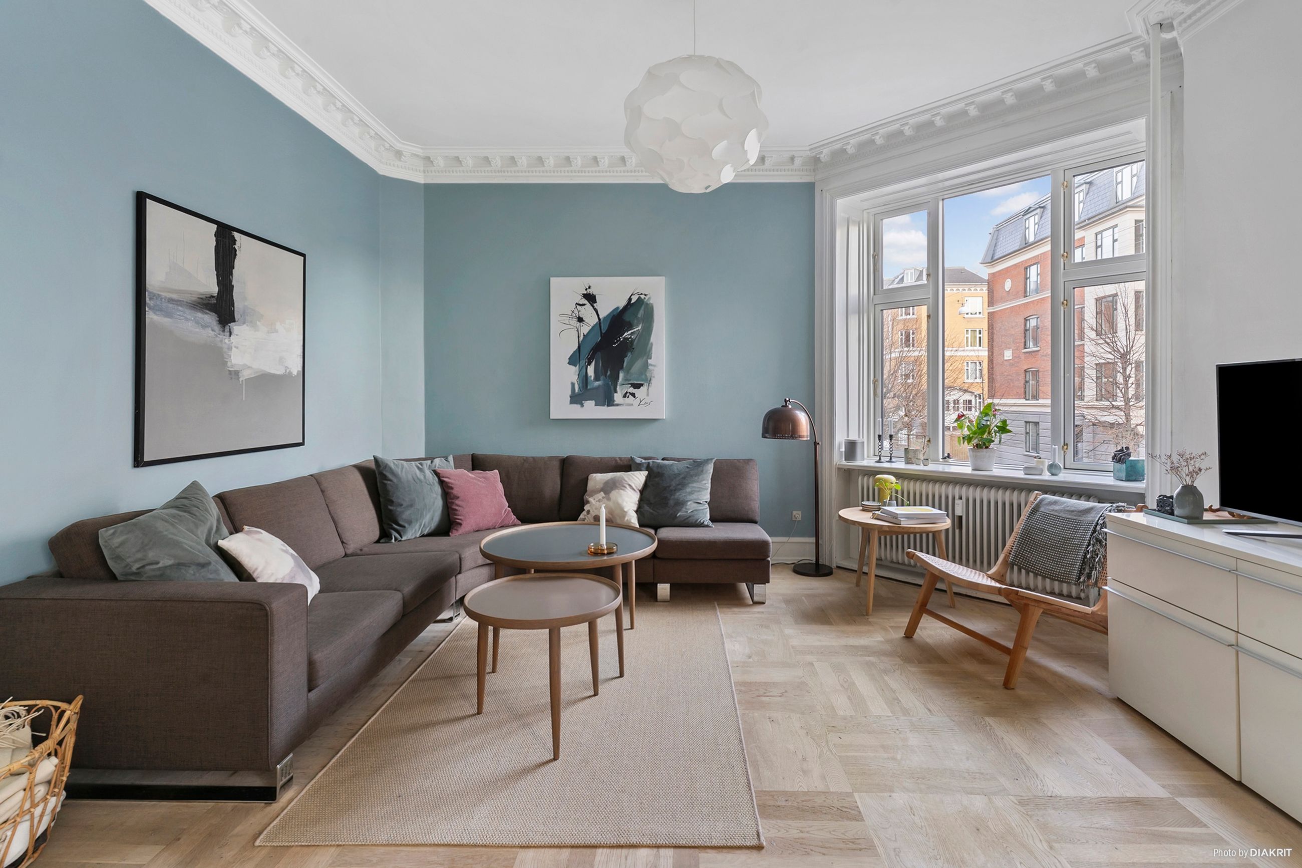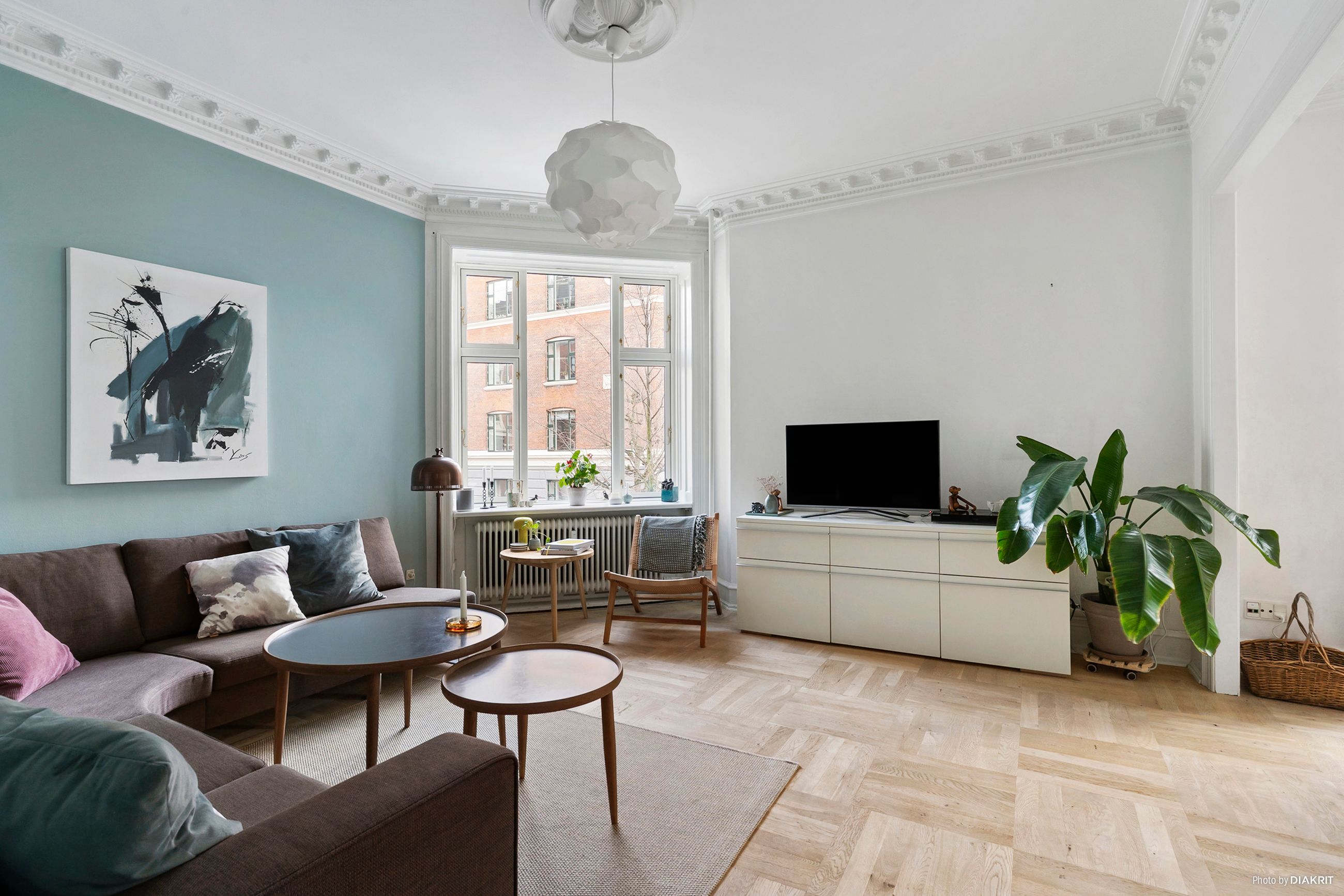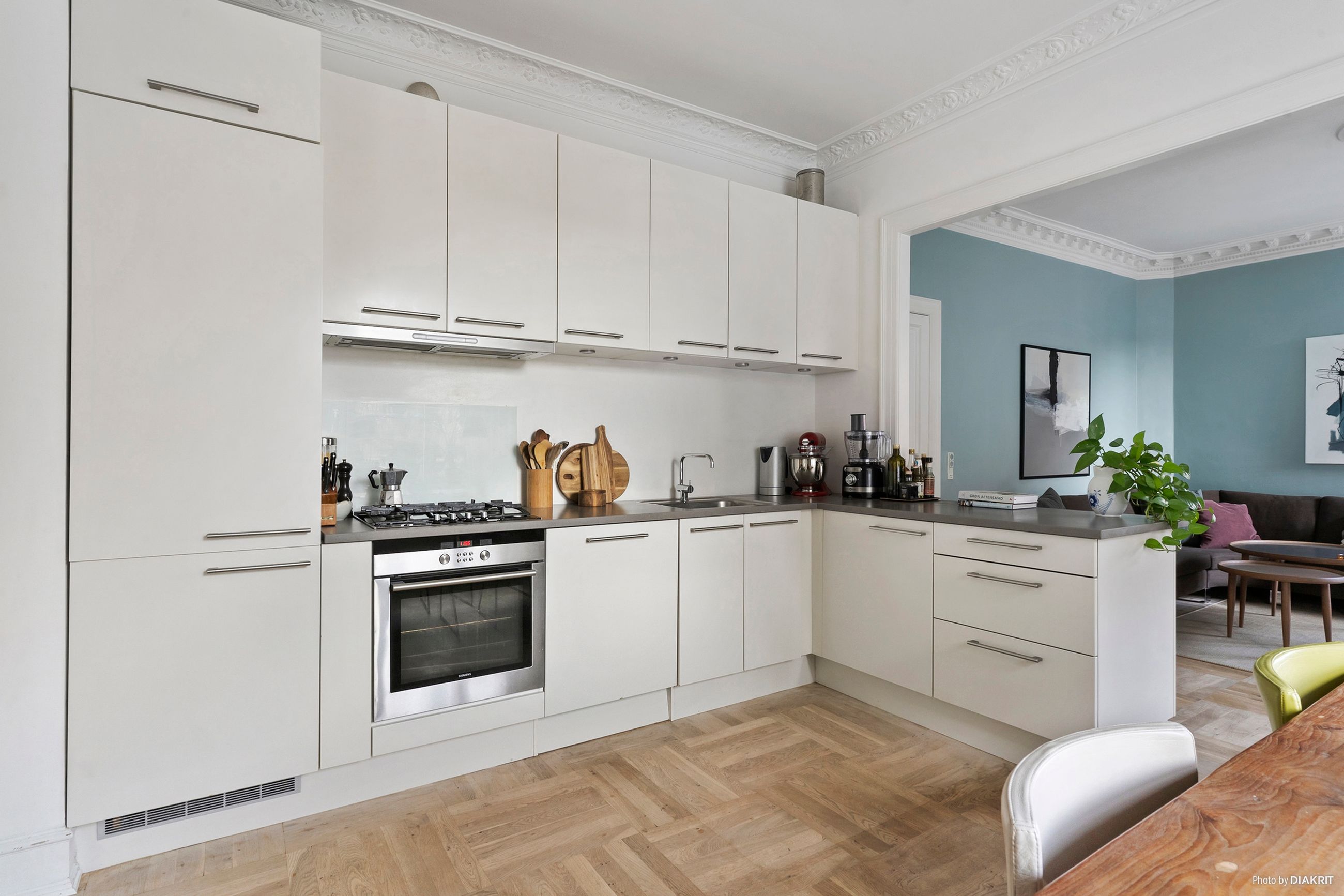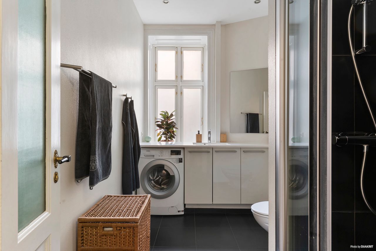 Lejligheden har et fremragende lysindfald og er løbende renoveret med stor respekt for de originale detaljer – de smukke egeparketgulve, fløjdørene og stuklofterne skaber den helt rigtige herskabelige stemning.