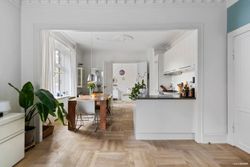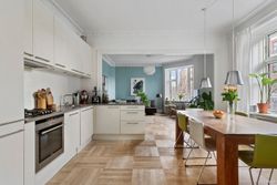 Lejligheden byder på en indbydende og rummelig fordelingsentré samt to elegante stuer en suite, hvoraf den ene har åbent Invita-spisekøkken med alt i hårde hvidevarer. I forlængelse af stuerne ligger et stort og lyst soveværelse, smukt adskilt med fløjdøre. Mod gården findes et rummeligt soveværelse med god skabsplads samt et dejligt børneværelse. Badeværelset er veldisponeret med gulvvarme, væghængt toilet, separat bruseniche og vaskemaskine.