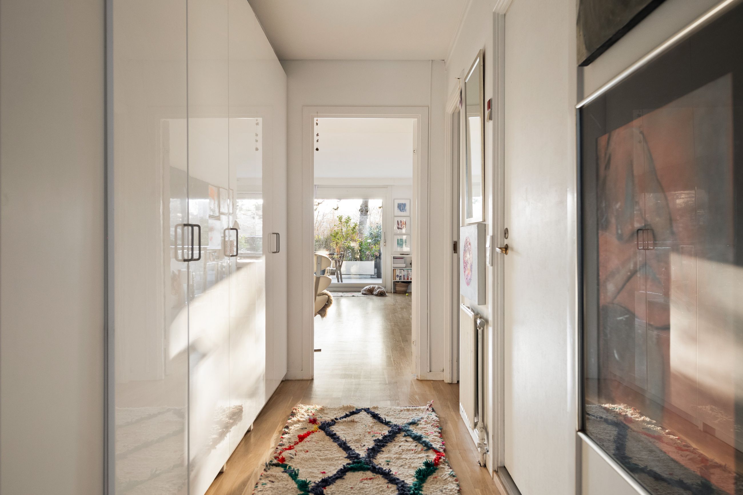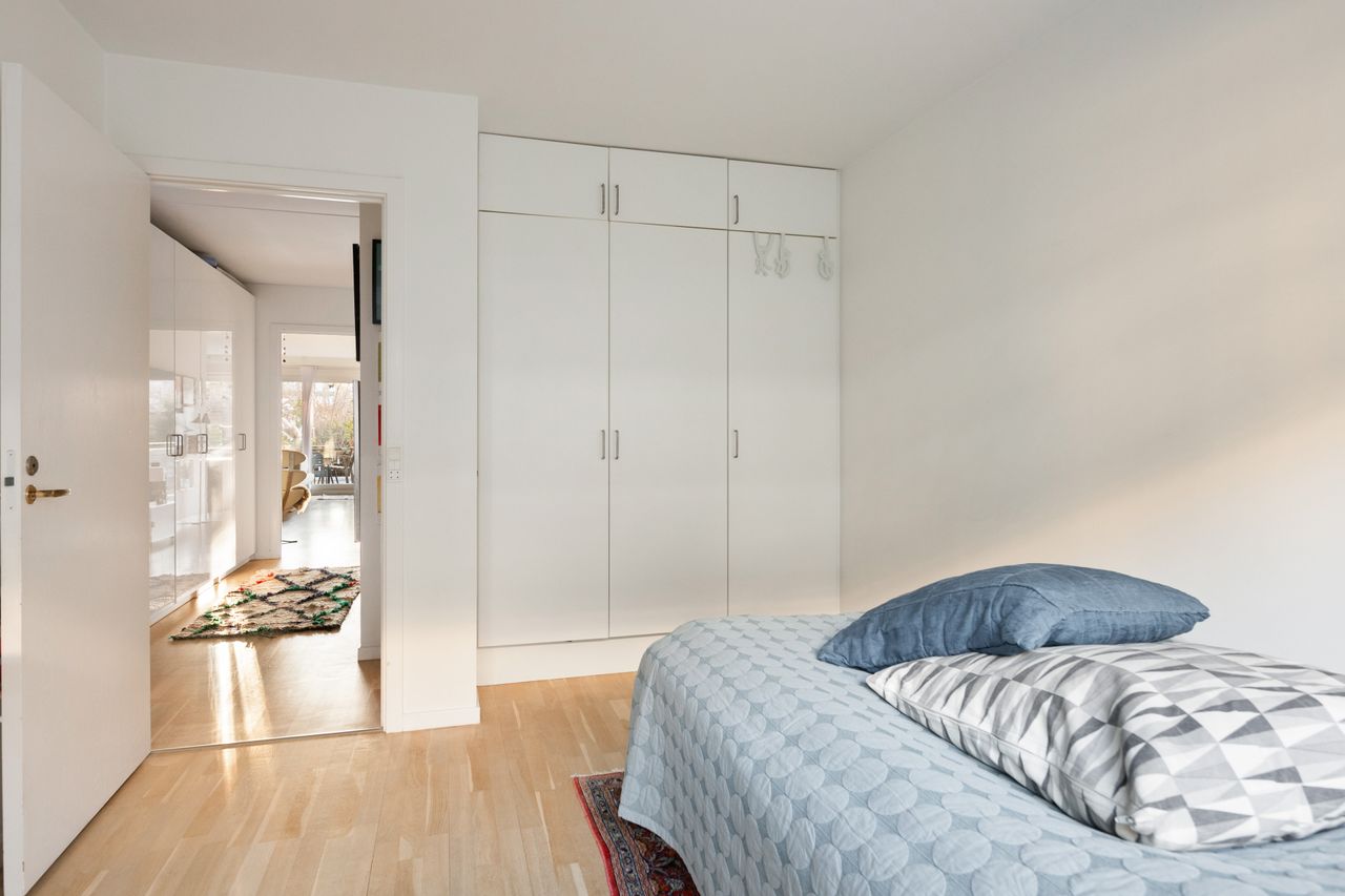 Lejligheden ligger meget højt uden indkig, og mod havesiden fremstår den fantastisk – stille og med fri udsigt. Lejligheden er også ideel for ældre, som har gangbesvær, da man kan vælge at have både udgang og indgang via havesiden (uden trapper). Der er egen parkeringsplads i kælderen, og udgiften hertil er indeholdt i fællesudgifterne.
