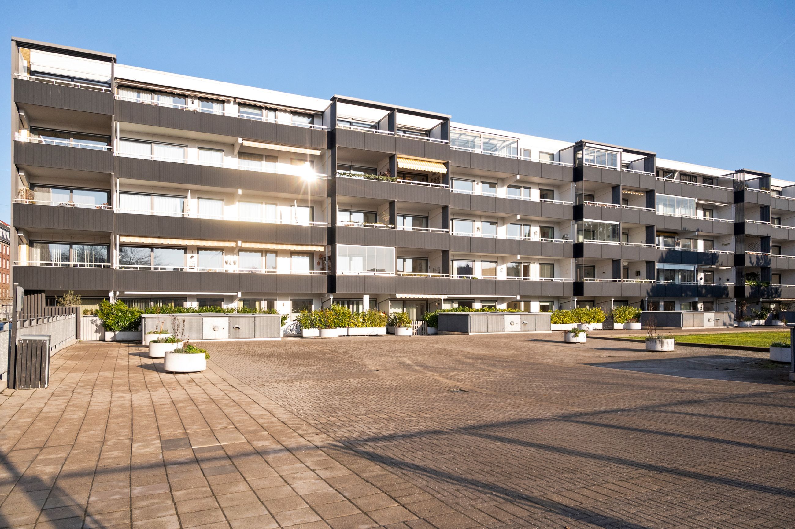 Mange fælles faciliteter, herunder swimmingpool, tennisbane, parkeringskælder, fitnessrum, fælles vaskeri, legeplads, kabel-tv m.m.