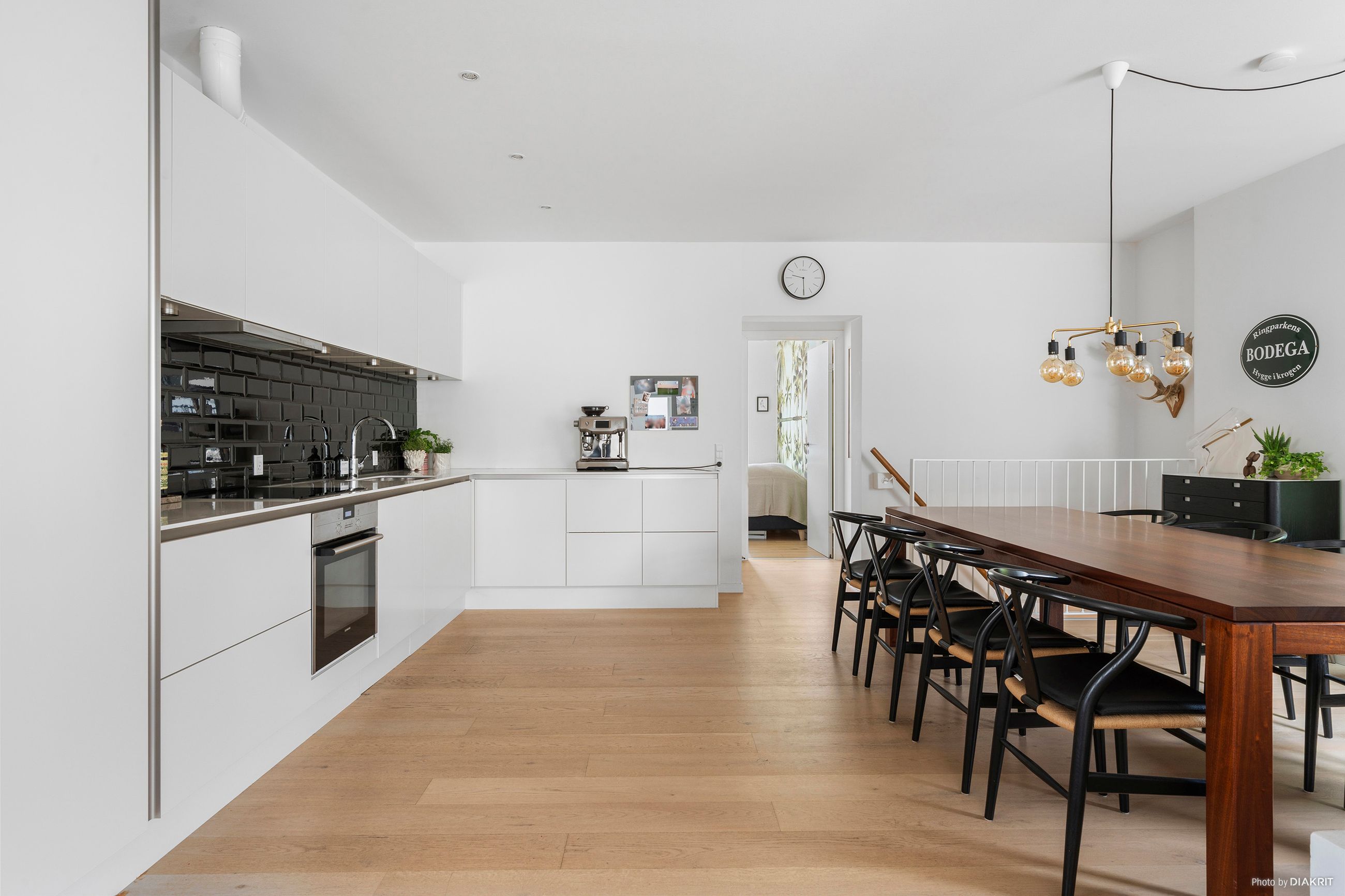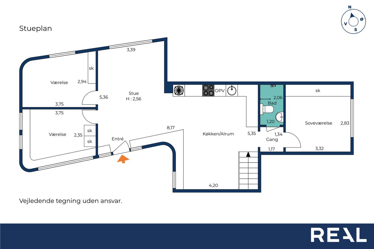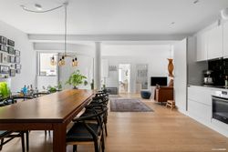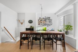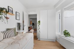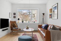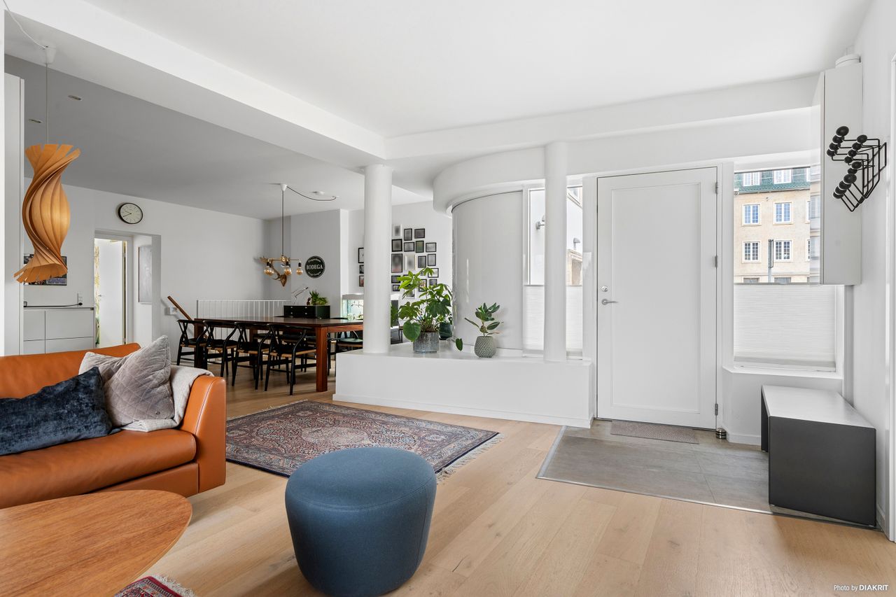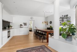 Indretning: Åben entré med flisegulv og plads til overtøj. Nyere HTH køkken i åben forbindelse til opholdsstue og med plads til stort spisebord. Indbyggede spots i loftet i køkkenet. Flotte plankegulve igennem hele lejligheden og super lysindfald fra de syd og vestvendte store vinduespartier.