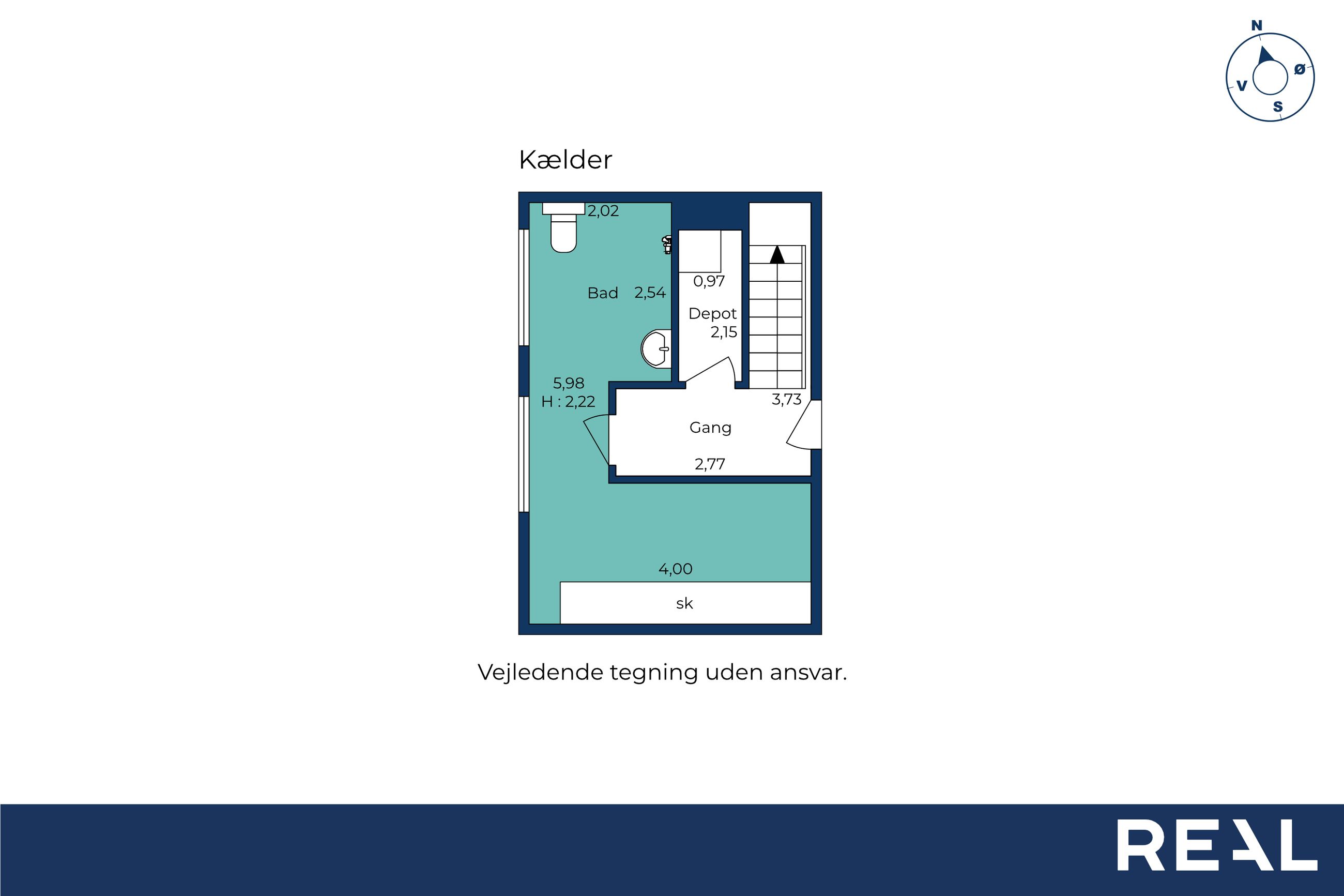 Fra det store køkken / alrum er der nedgang til veludnyttet kælderareal som har 2 store vinduer med naturligt lysindfald oppefra. Her findes stort badeværelse, nærmest spaafdeling med masser af plads at boltre sig på. Her er ligeledes plads til skrivebord og skabsplads som er vinklet rundt om hjørnet fra badet. Separat rum med vaskesøjle og plads til rengøringsremedier. Yderligere er der plads til vin eller anden opbevaring under trappen, hvor der er lavet en lem fra vaskerummet.